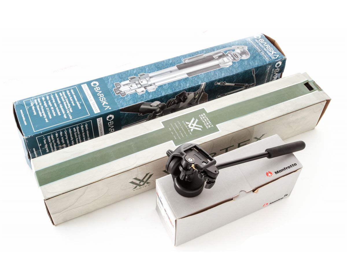 Lot of Two (2) Tripods and one Tripod Head, including one Manfrotto 128RC mini-video fluid head, in original box with owner's manual; one Barska professional tripod, in original box with carrying case; and one Vortex Summit Series tripod, in original box with carrying case. Condition to all is excellent and as new. Boxes show light to moderate shelf wear. Retails @ $800/lot. Est.: $350-$500/lot. (Field Time)