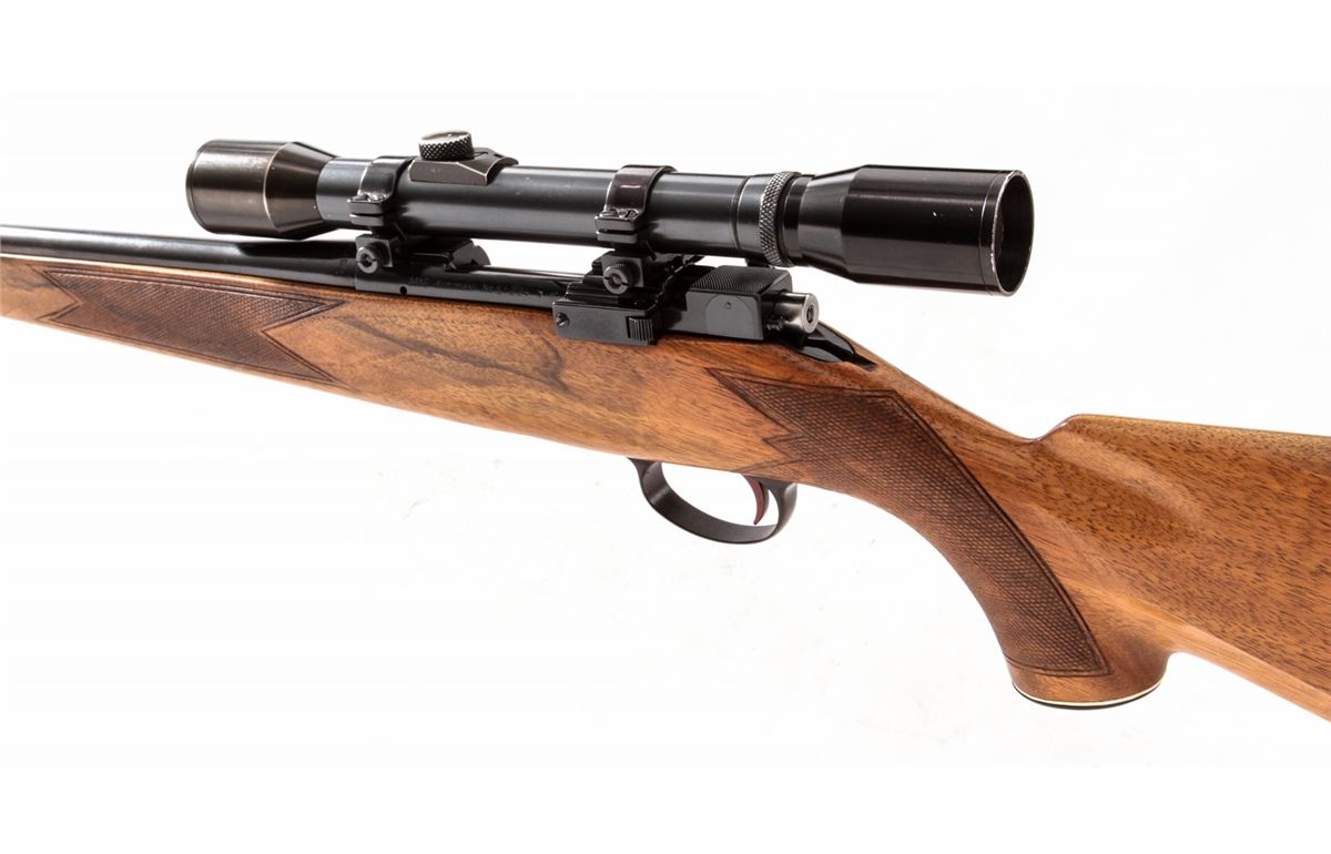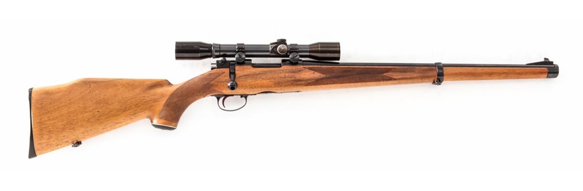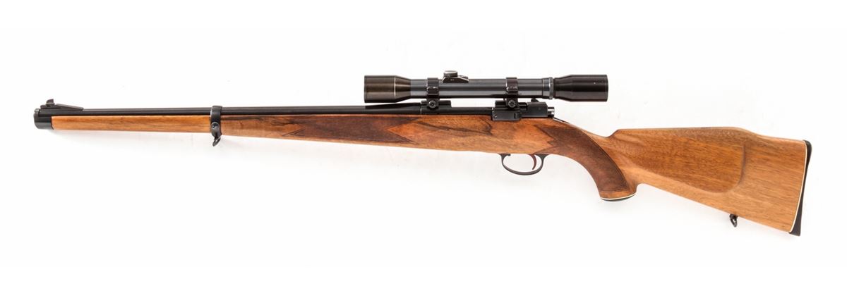 Sako Riihimiki Bolt Action Rifle, #51224, .222 cal., 20'' barrel, blue finish, full-length Mannlicher stock with cheekpiece. Topped with a 4-power Unertl Hawk scope on Sako rings. Condition is very good retaining approx. 94%+ blue. Blond stock with moderate flattening to checks at pistol grip, less pronounced at forend. Action is good, bore is very good, clear scope optics with crosshair reticules. Est.: $450-$600. (C&R)