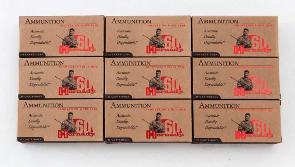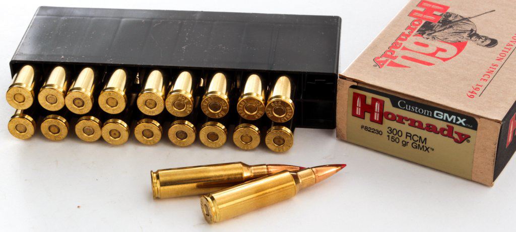 Ammo Lot: 180 Rounds of Hornady Custom GMX .300 RCM 150-grain cartridges. Nine (9) 20-round boxes, all brand new in original packaging. Retails @ $340/lot. Est.: $200-$300/lot. (Field Time)