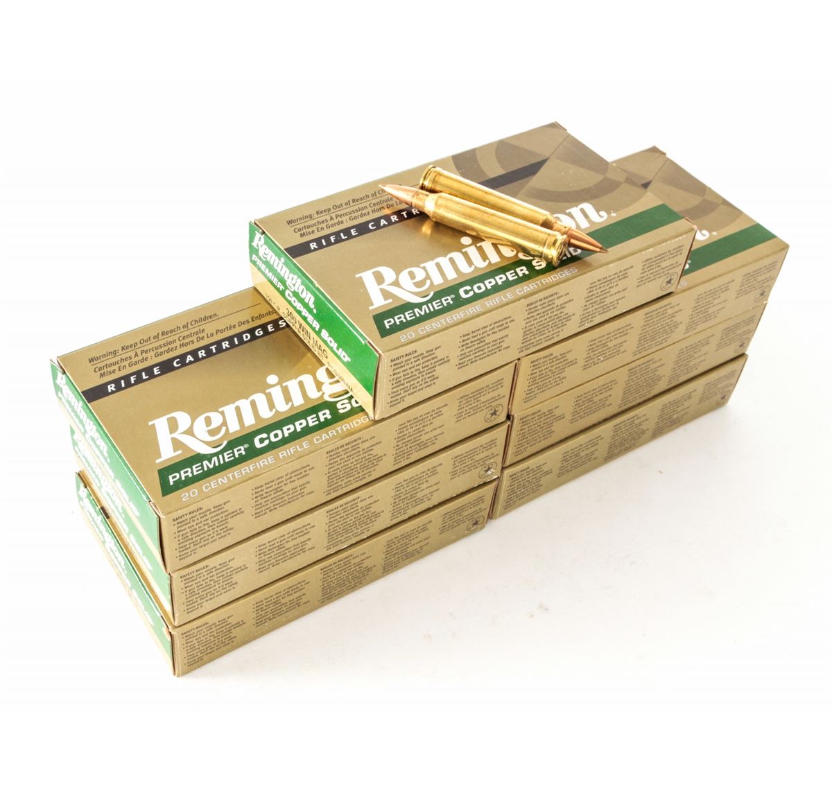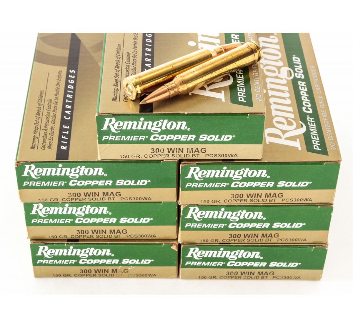 Ammo Lot: Lot of Seven (7) Boxes of Remington .300 Win. Mag., Premier Copper Solid, 150 grain Copper Solid BT cartridges, Part #PCS300WA, 20 rounds per box. Condition is excellent, remaining new in original boxes. Retails @ $420/lot. Est.: $225-$325/lot. (Field Time)