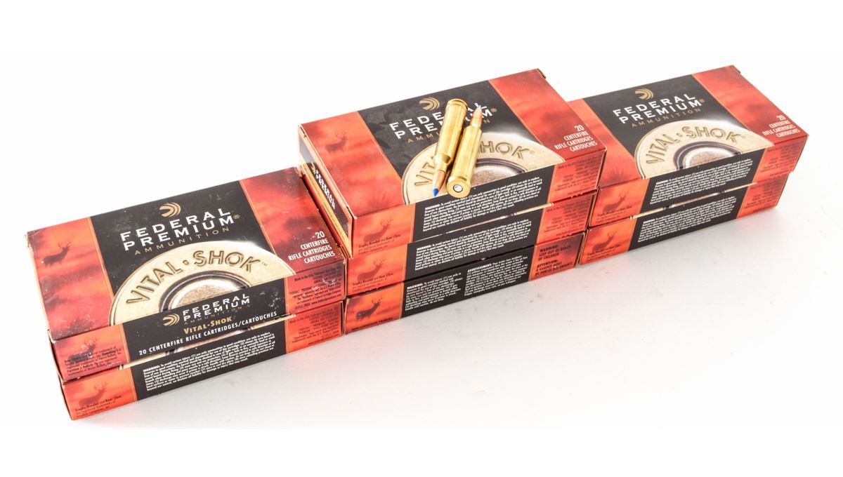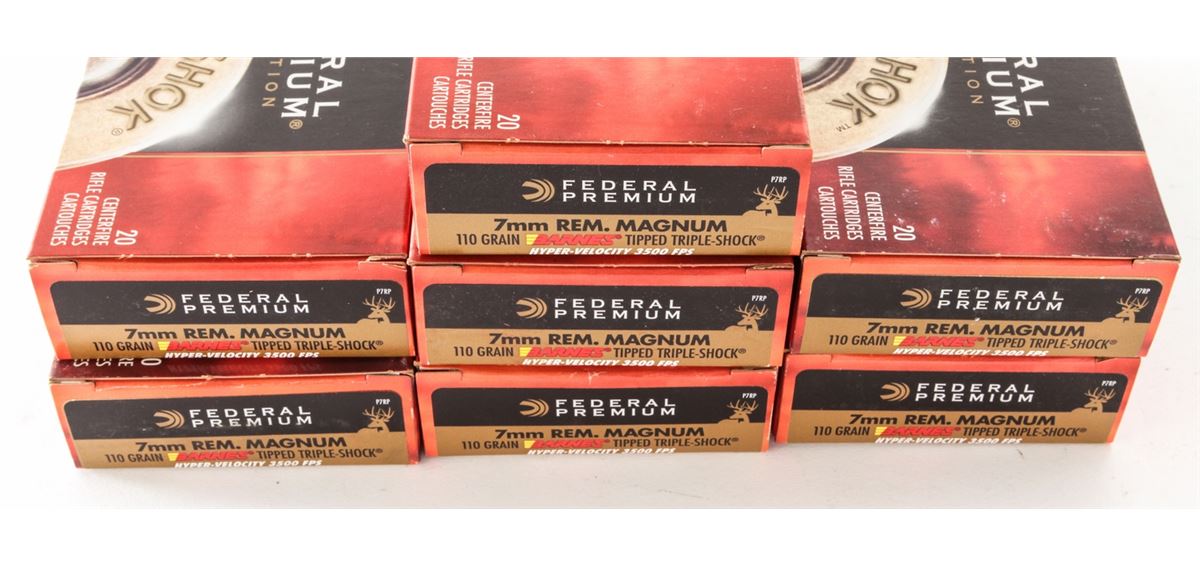 Ammo Lot: Lot of Seven (7) Boxes of Federal Premium 7mm Rem. mag., Vital-Shok, 110 grain Barnes Tipped Triple-Shock, part #P7RP, 20 rounds per box. Condition is excellent, remaining new and in original boxes. Retails @ $385/lot. Est.: $200-$300/lot. (Field Time)