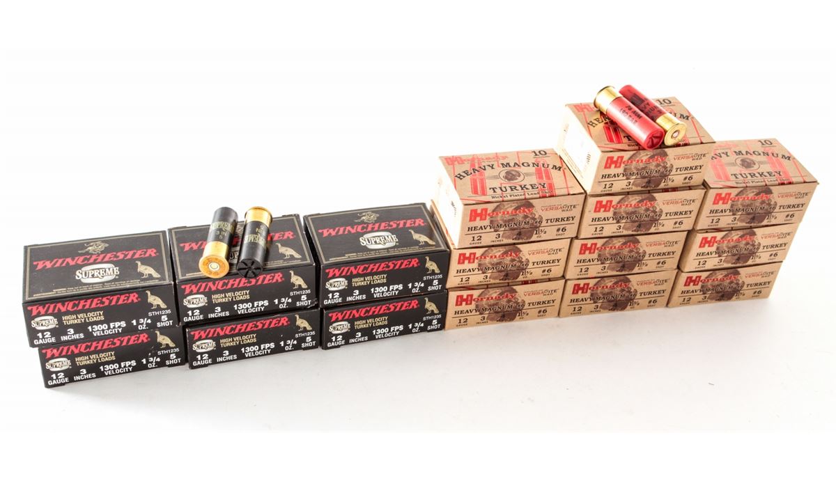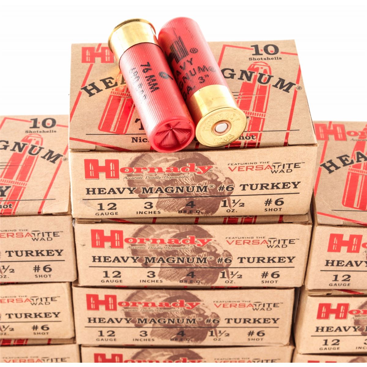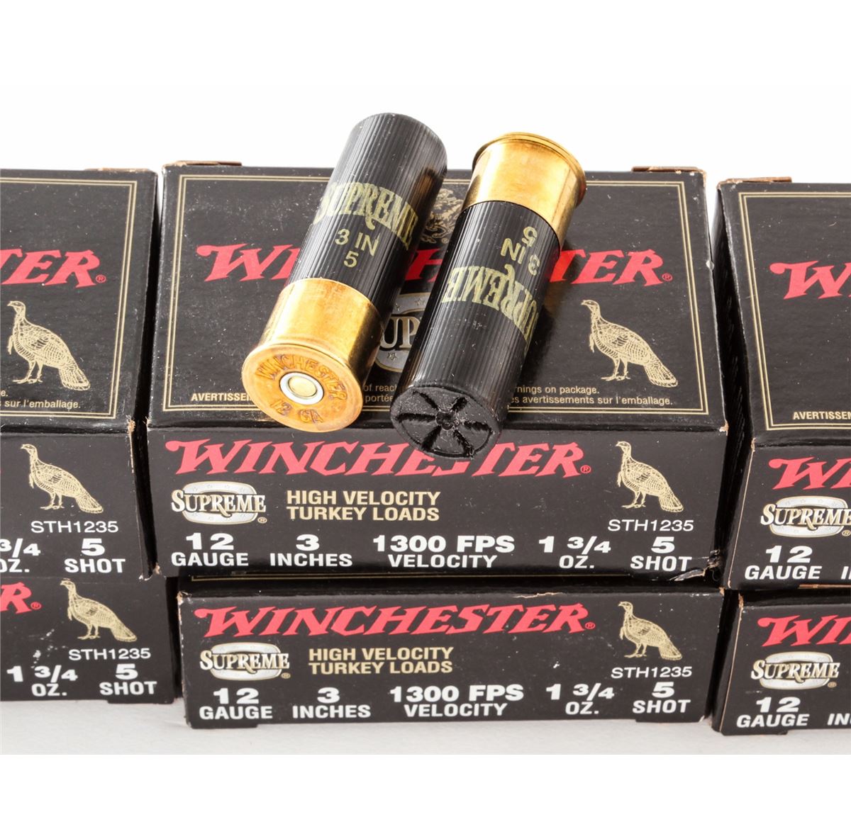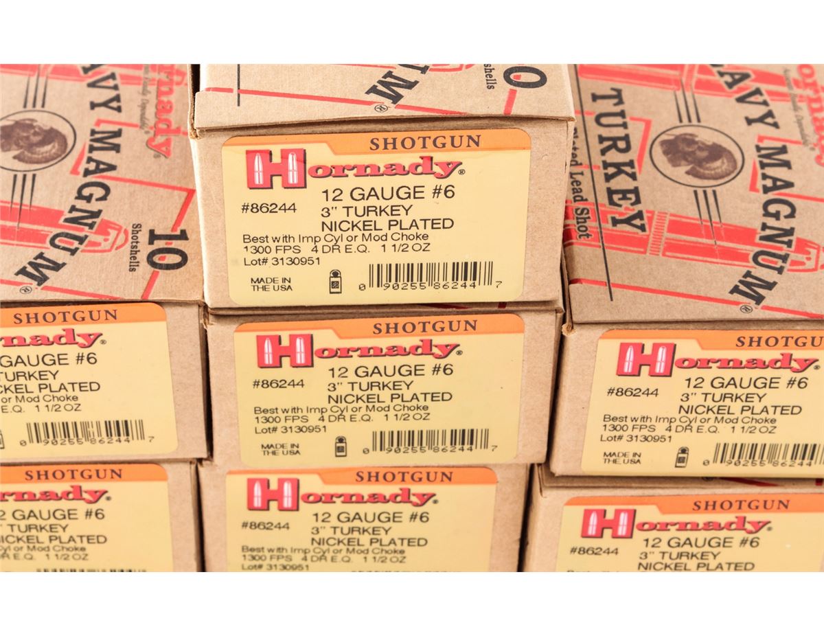 Ammo Lot: Sixteen (16) Boxes of 12 Gauge Turkey Loads: 1) Six (6) boxes of Winchester Supreme, part #STH1235, 3'' chamber, 1-3/4 oz., #5 copper plated lead shot, 10 rounds per box. 2) Ten (10) boxes of Hornady Heavy Magnum, part #86244, 3'' chamber, 1-1/2 oz., #6 nickel-plated lead shot, 10 rounds per box. Condition is excellent, remaining new and in original boxes. Retails @ $308/lot. Est.: $150-$250/lot. (Field Time)