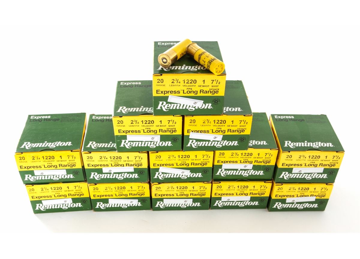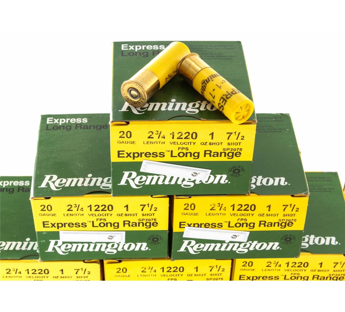 Lot of Thirteen (13) Boxes of Remington 20 Gauge Express Long Range, 2-3/4'', 1 oz., 7-1/2'' shot, part #SP2075, 25 rounds per box. Condition is excellent, remaining new and in original boxes. Retails @ $220/lot. Est.: $125-$200/lot. (Field Time)