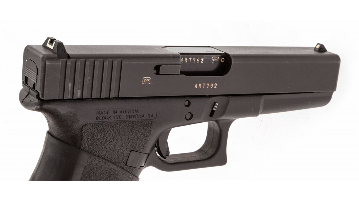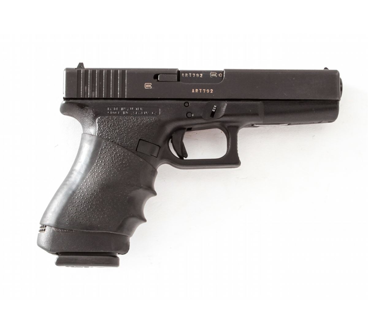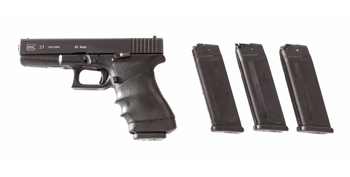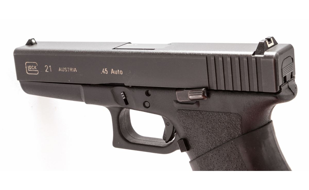 Glock Model 21 Semi-Automatic Pistol, #ART792US, .45 ACP cal., 3-3/8'' barrel, matte finish, with four (4) 13-round magazines, Hogue rubber grip wrap, and standard sights. A Generation II pistol. Condition is excellent showing light range use. Est.: $450-$600. (Modern/PPT) (High cap mags not available to Calif. residents.)