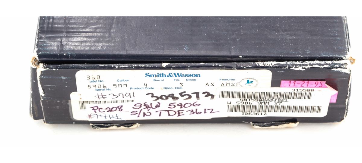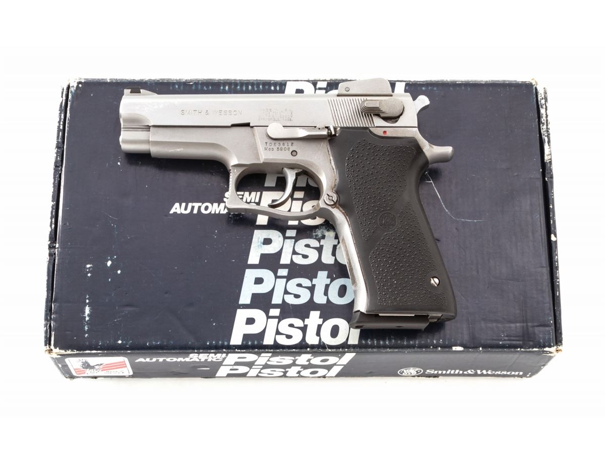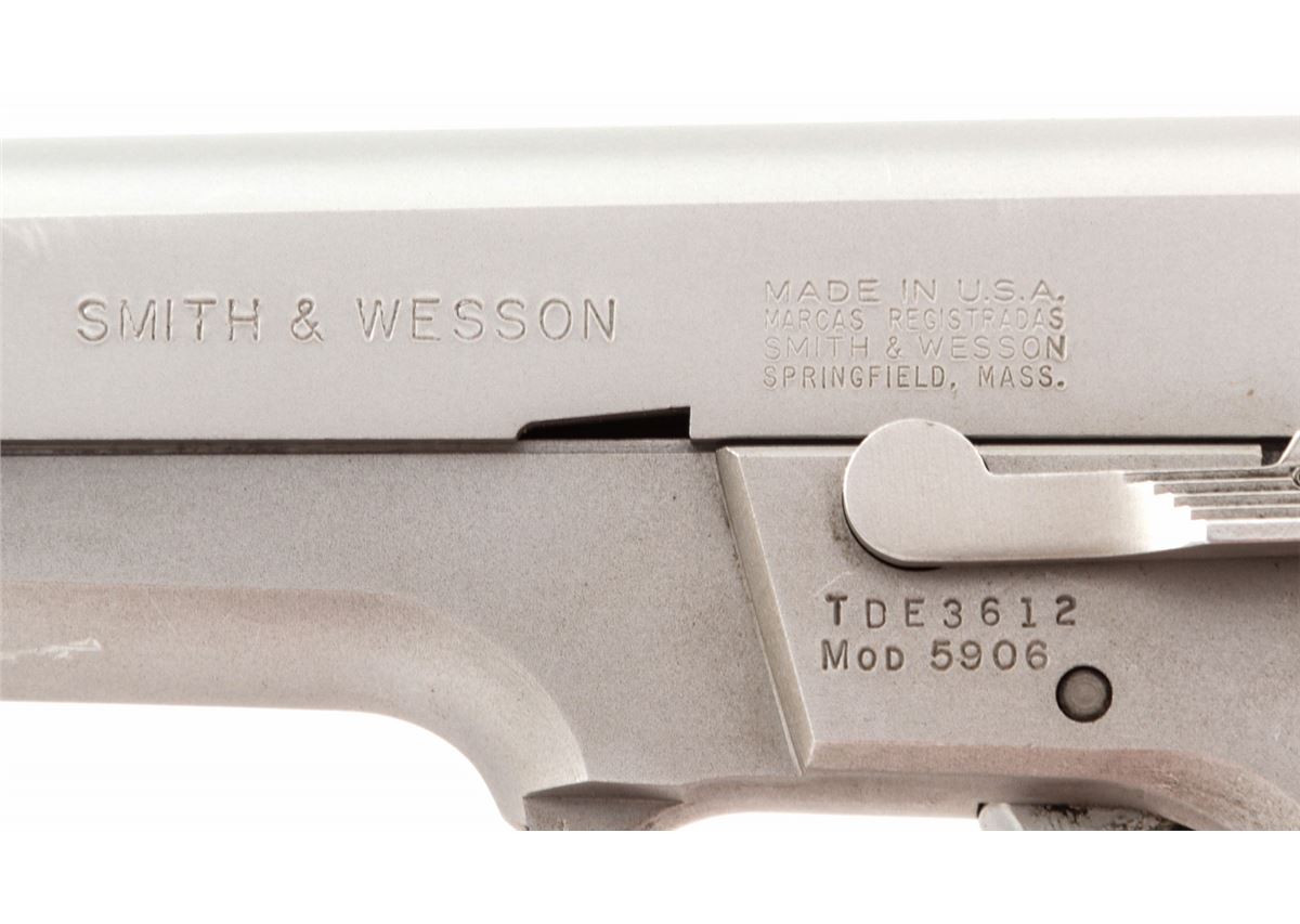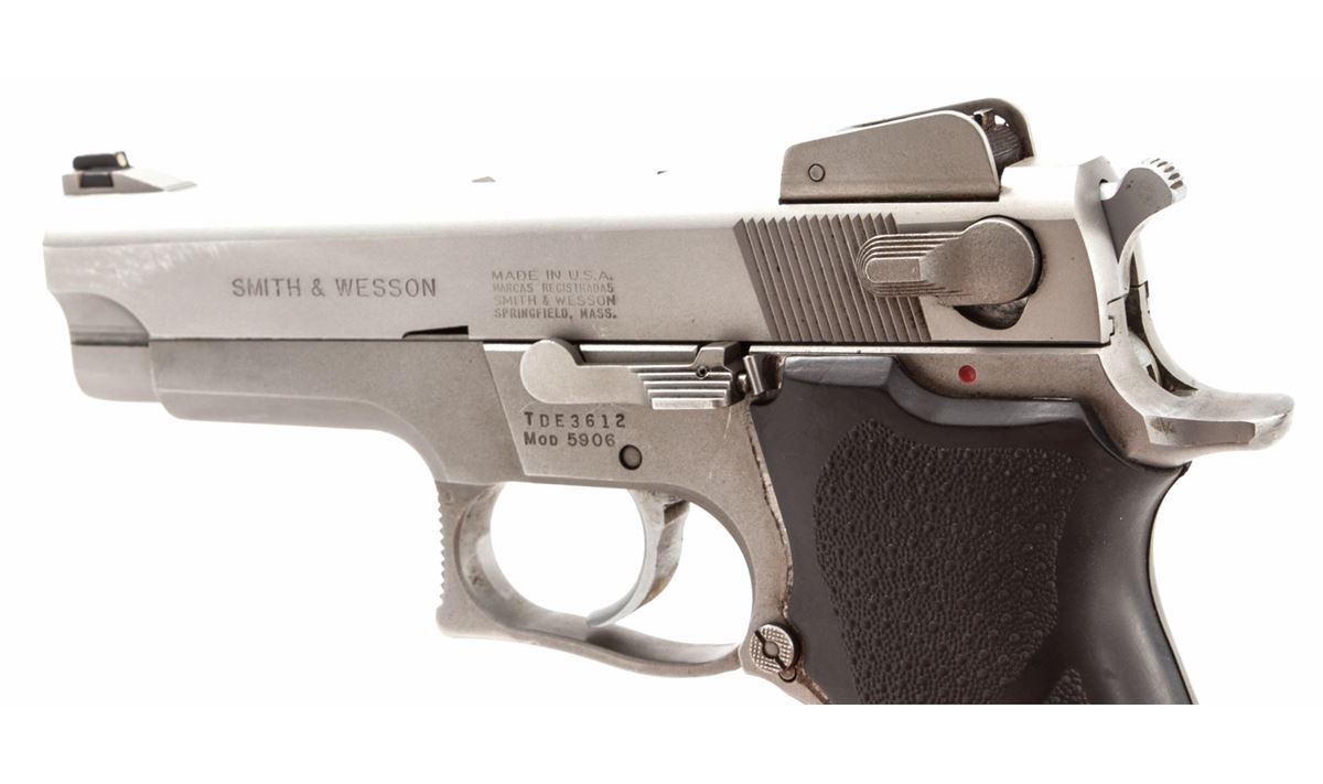Smith & Wesson Model 5906 Semi-Automatic Pistol, #TDE3612, 9mm, 4'' barrel, stainless steel, Hogue rubber grips, with one 10-round magazine. Condition is fine to near excellent showing light to moderate range use and in need of a cleaning. In original box. Est.: $400-$600. (Modern) (Not available to Calif. residents.)