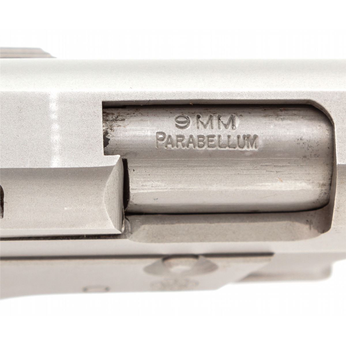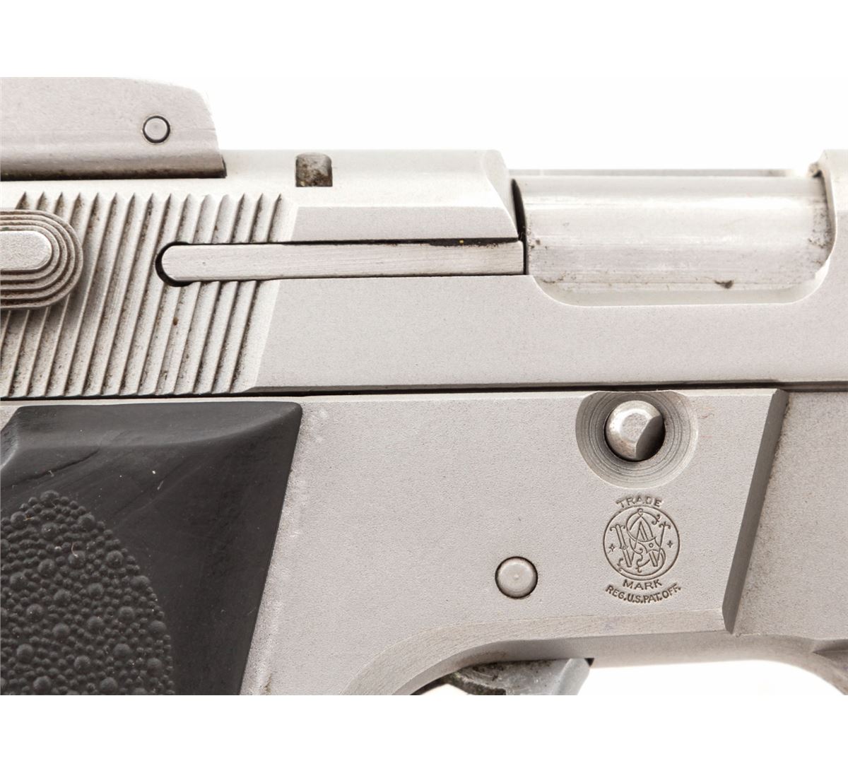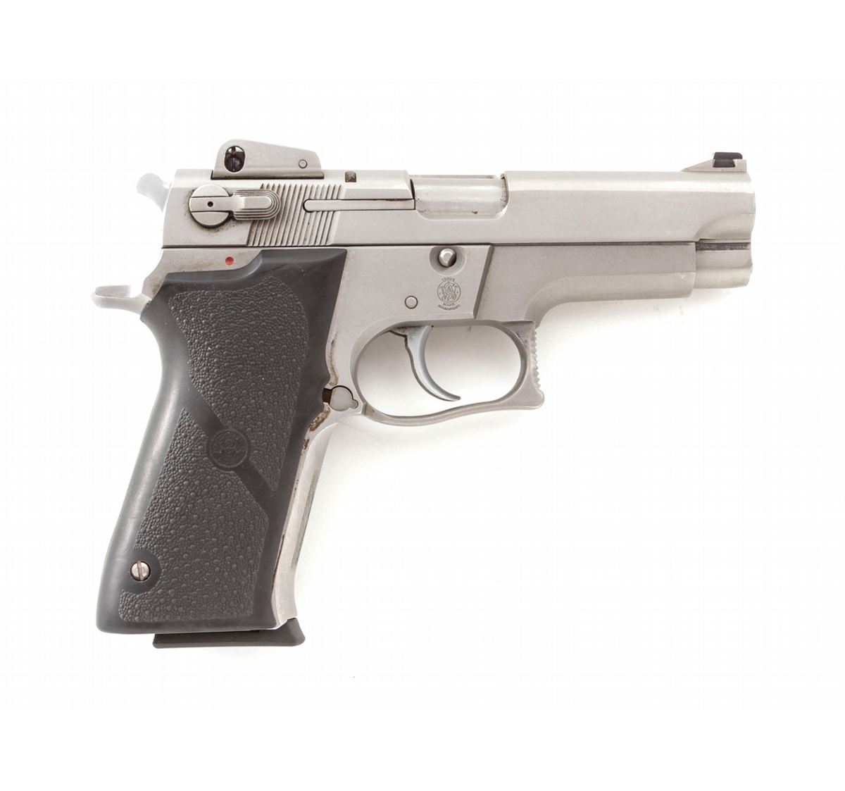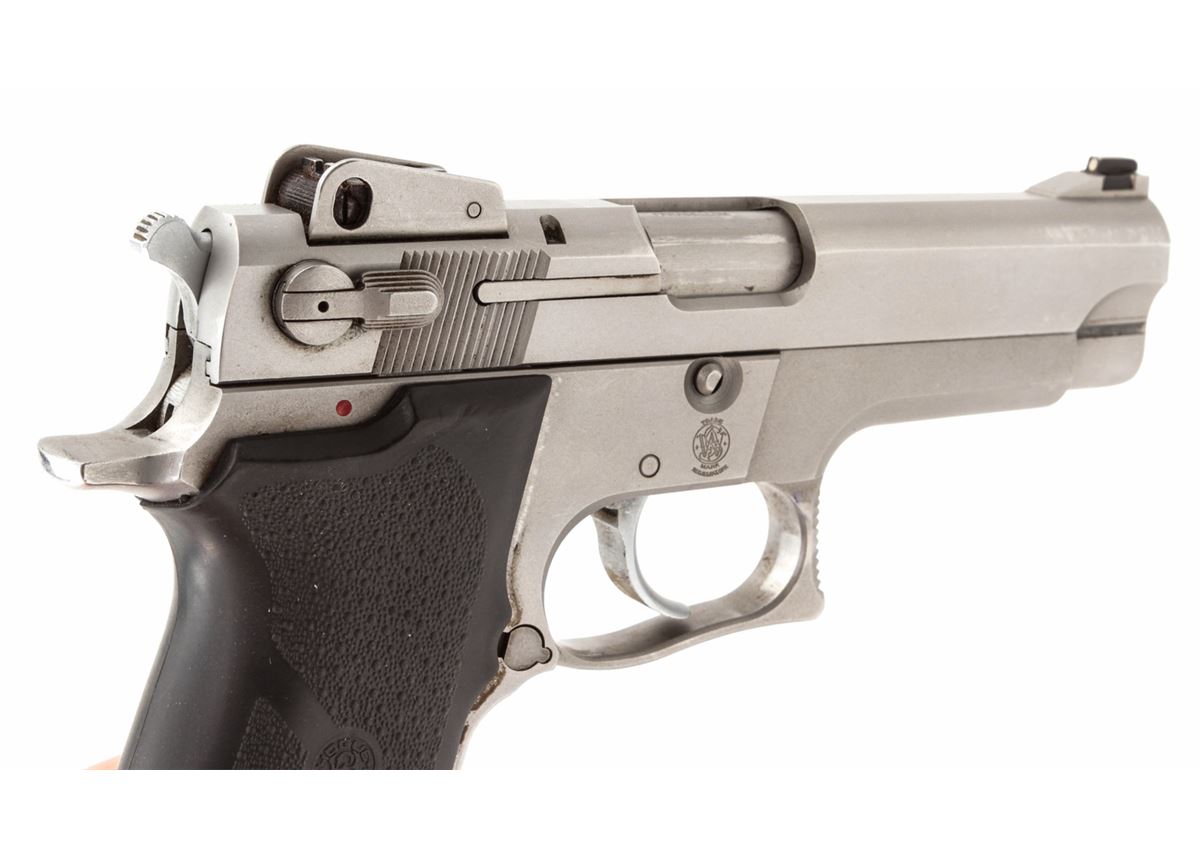 Smith & Wesson Model 5906 Semi-Automatic Pistol, #TDE3612, 9mm, 4'' barrel, stainless steel, Hogue rubber grips, with one 10-round magazine. Condition is fine to near excellent showing light to moderate range use and in need of a cleaning. In original box. Est.: $400-$600. (Modern) (Not available to Calif. residents.)
