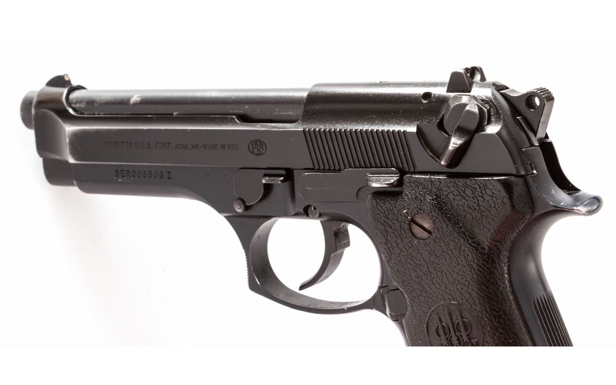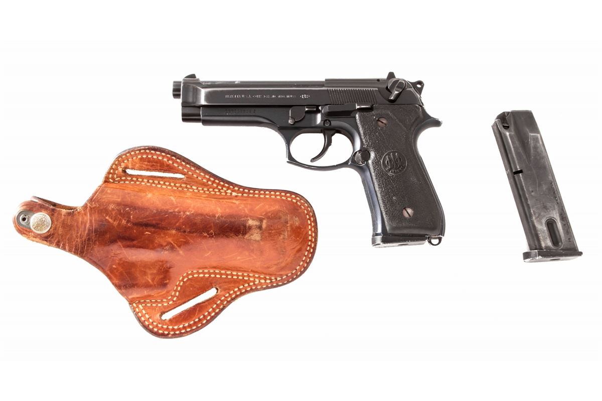 Beretta Model 92F Semi-Automatic Pistol, #BER006808Z, 9mm, 4-7/8'' barrel, blue finish, pebblegrain Beretta rubber grips, with two (2) 15-round magazines, in brown leather holster. Condition is very good to near fine retaining approx. 92% blue. Moderate thinning to grips. Good action and bore. Pancake holster with oil darkening. Est.: $450-$600. (Modern/PPT) (High cap mags not available to Calif. residents.)