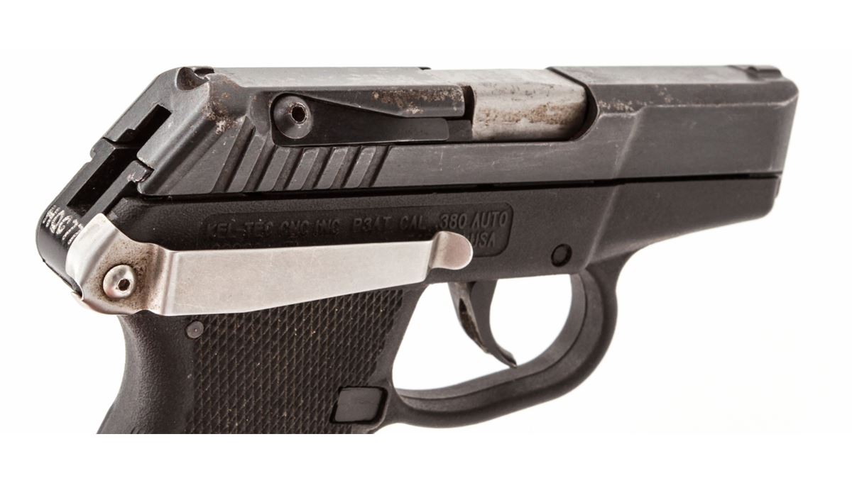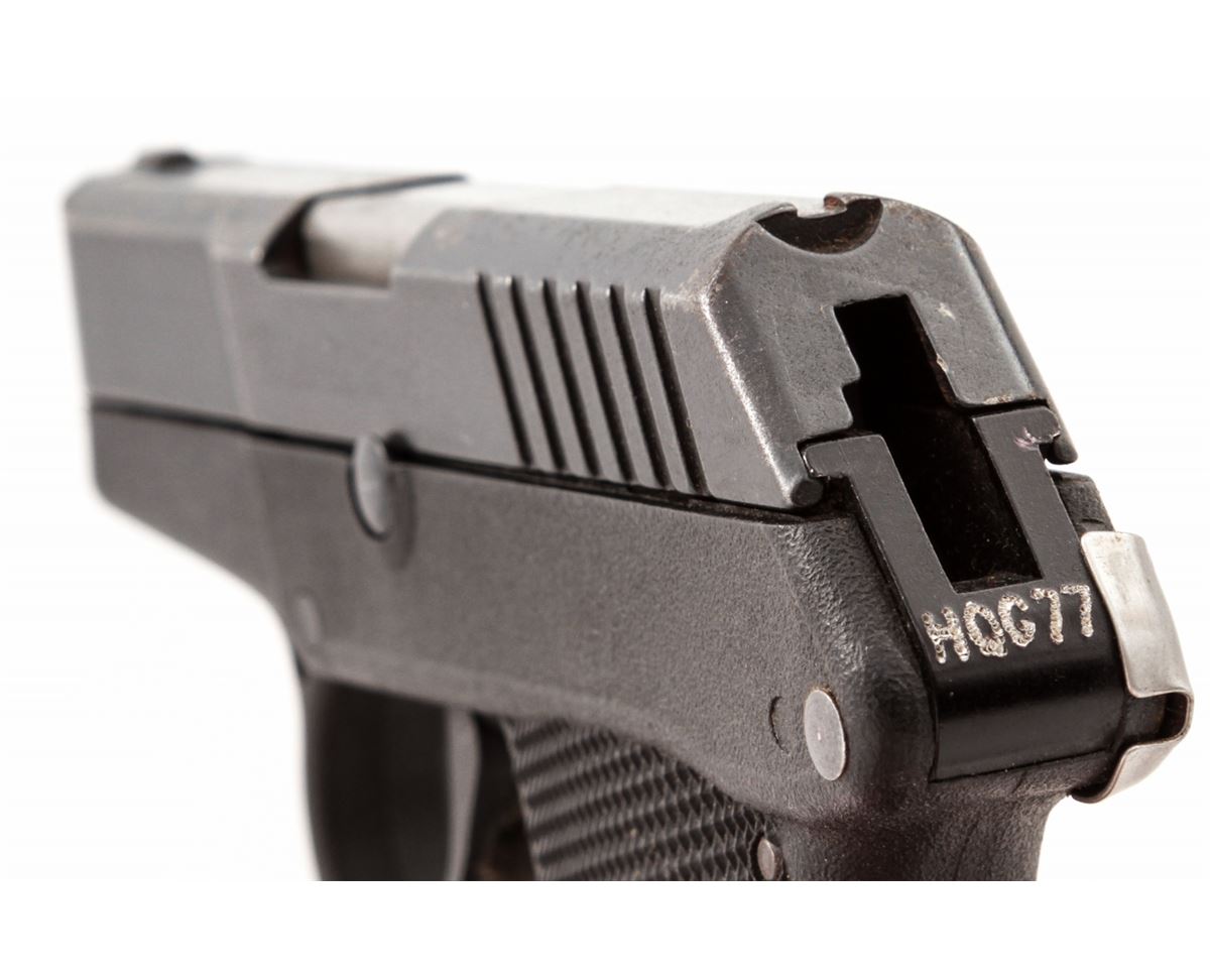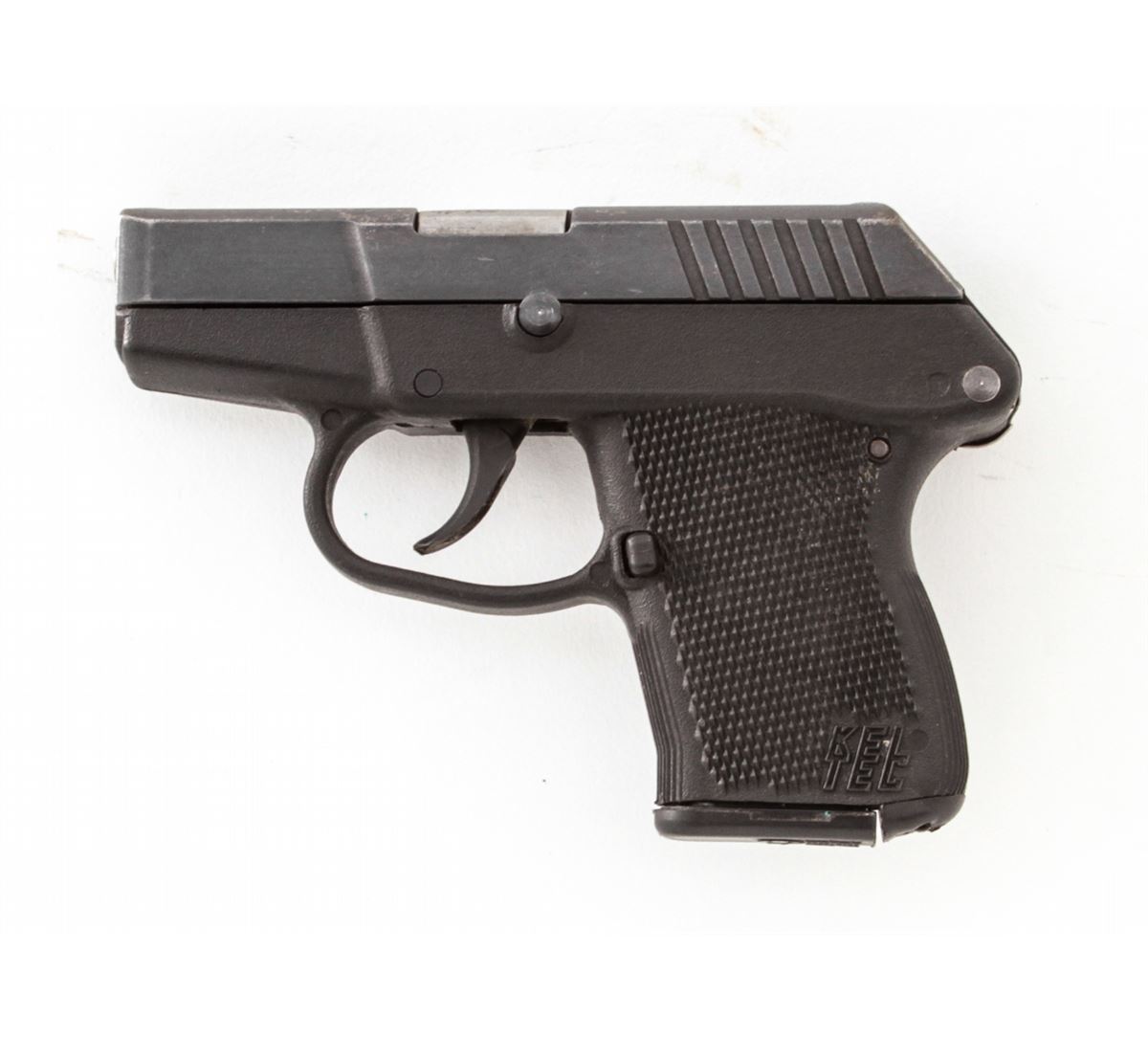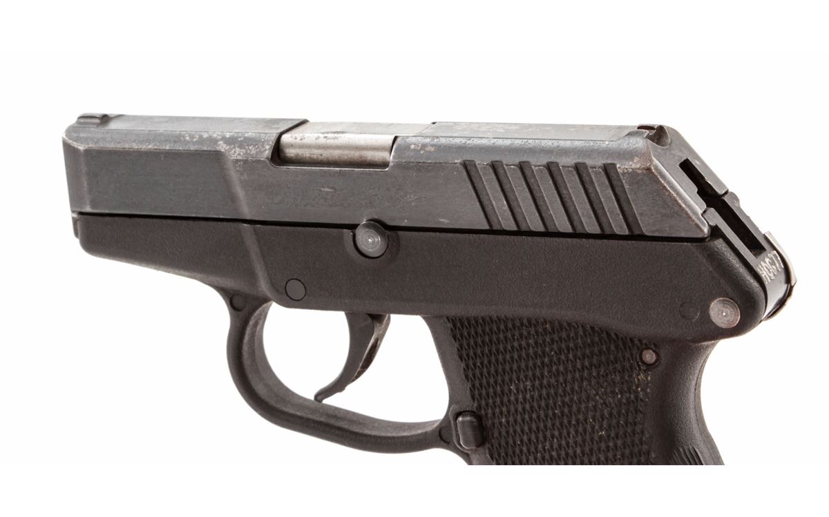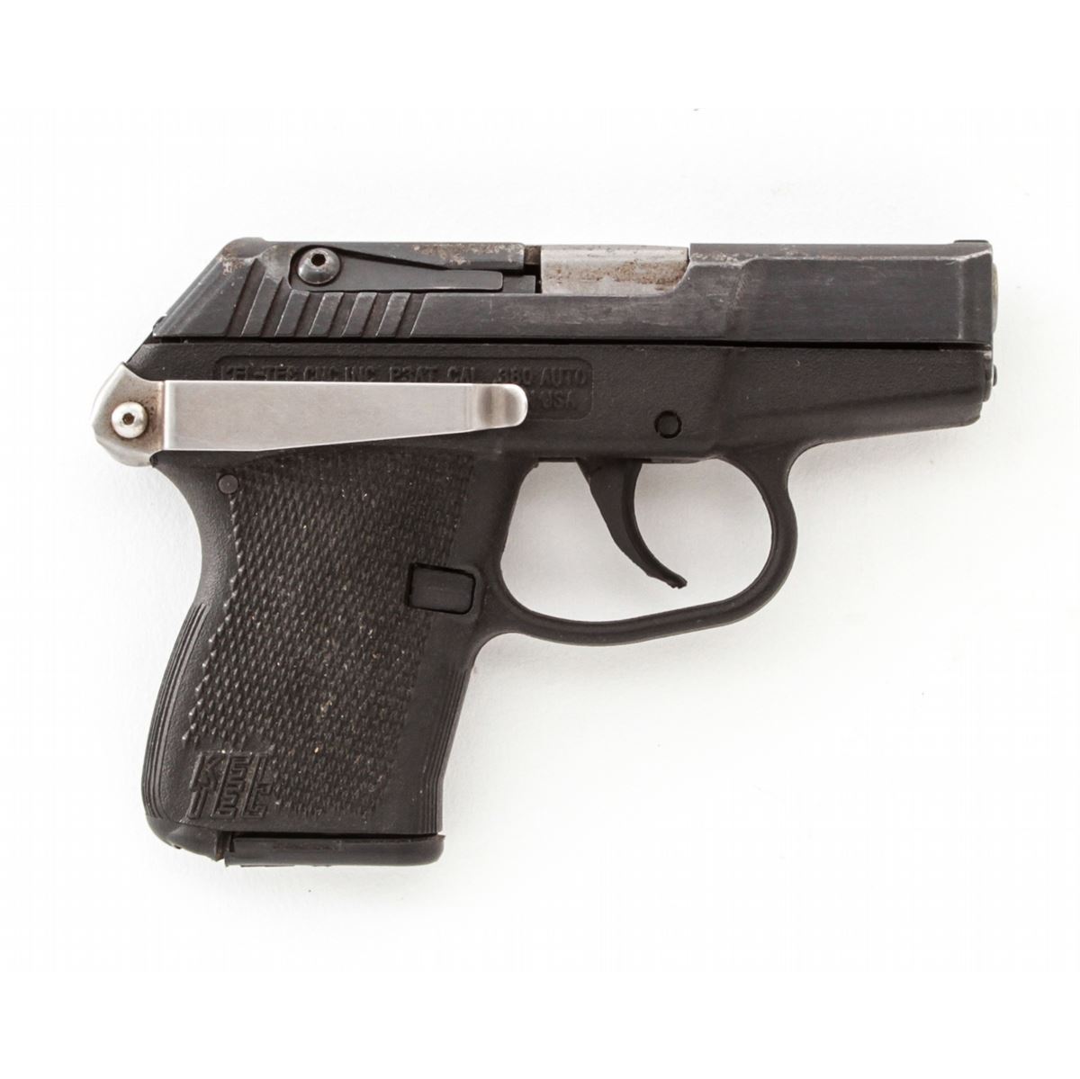 Kel-Tec P3AT Semi-Automatic Pistol, #HQC77, .380 cal., 2-1/2'' barrel, matte blue slide, polymer frame, with belt clip and one magazine. Pistol is double action only. Condition is very good showing moderate use as thinning to the finish on slide. Grips with just minor flattening. Good action and bore. Est.: $125-$250. (Modern/PPT)