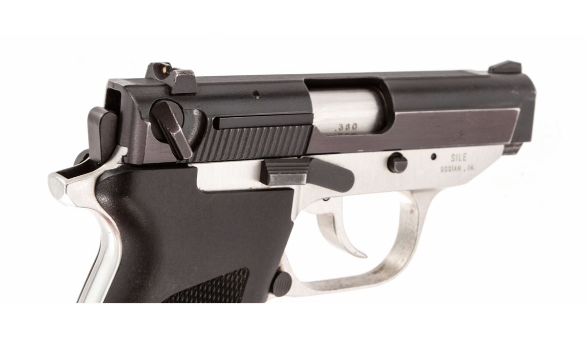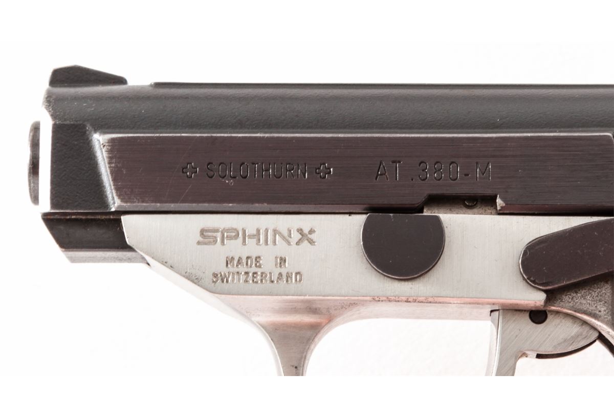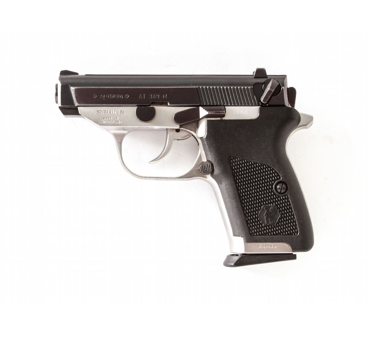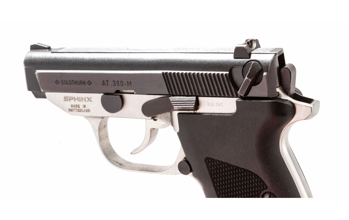 Swiss Sphinx Model AT .380-M Semi-Automatic Pistol, #MO1075, .380 cal., 3.25'' barrel, two-tone finish, factory checkered plastic grips, with one 10-round magazine. Condition is near new showing light handling marks with wear to forward edges of slide. Est.: $400-$600. (Modern) (Not available to Calif. residents.)