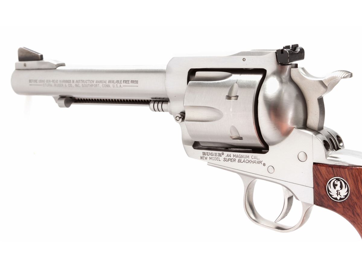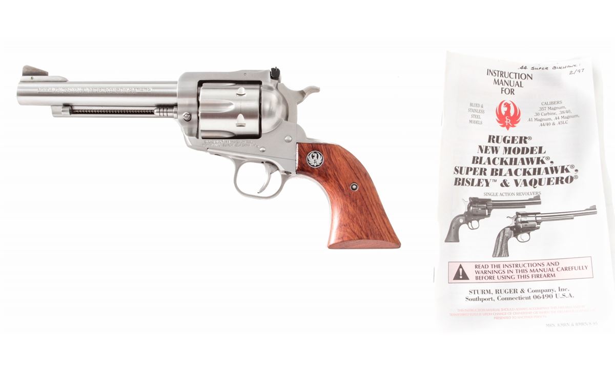 Ruger New Model Super Blackhawk Single Action Revolver, #86-81676, .44 mag. cal., 5-1/2'' barrel, stainless steel, factory smooth hardwood grips with medallions, with original instructions. Condition is excellent, appearing as new. Est.: $450-$600. (C&R/PPT)