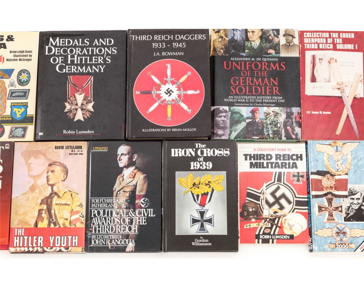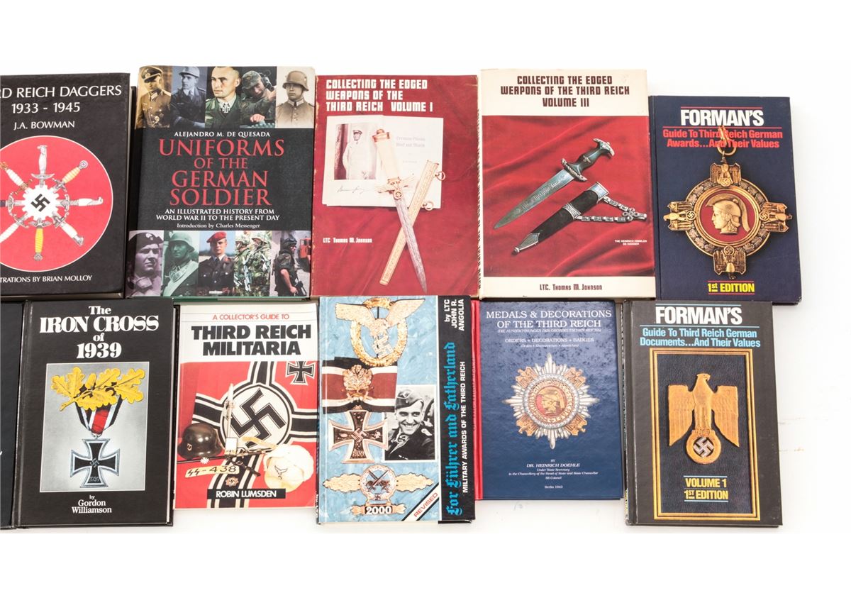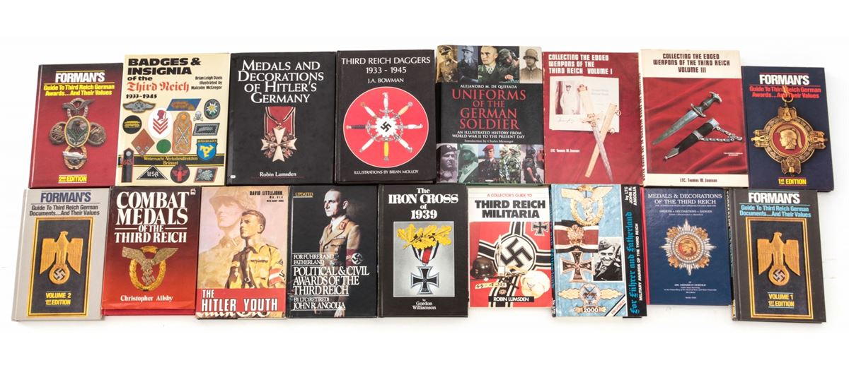 Lot of Seventeen (17) Collector's Reference Books on German militaria, including ''Combat Medals of the 3rd Reich''; ''3rd Reich Daggers'', by J.S. Bowman; several Forman Guides to German Militaria, etc. Condition to all is excellent, some with dustcovers, some showing light shelf wear. Est.: $250-$450/lot.