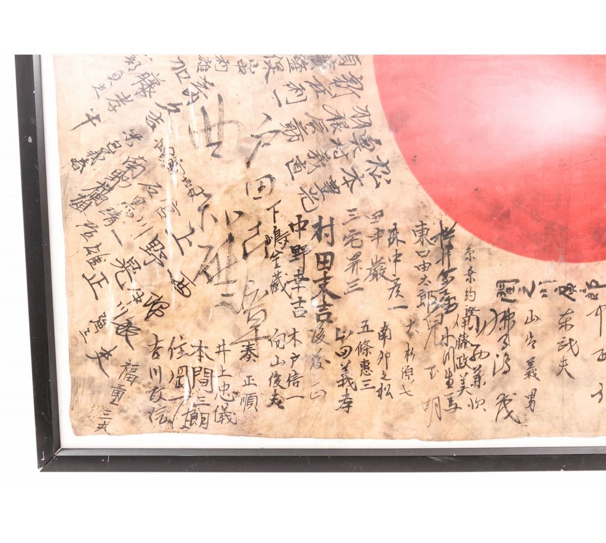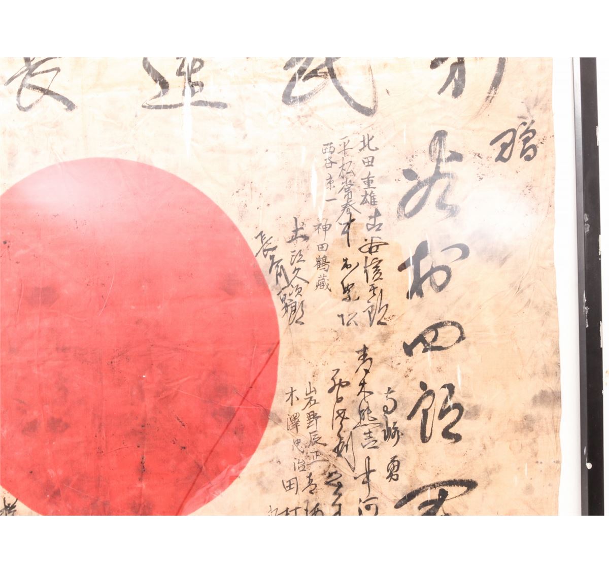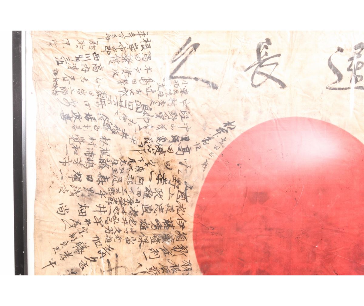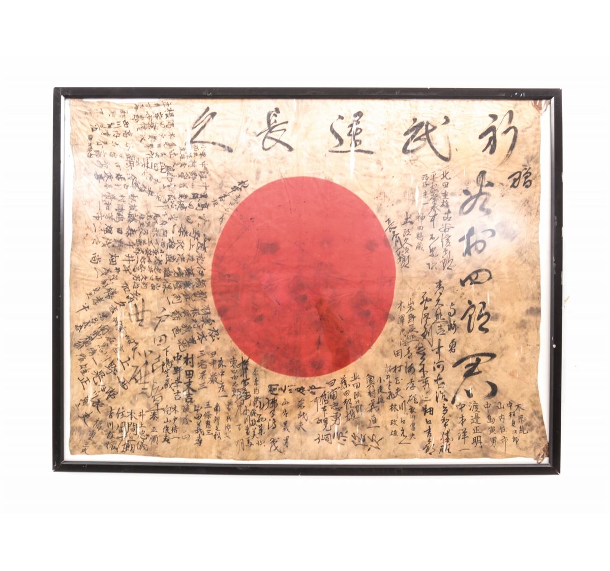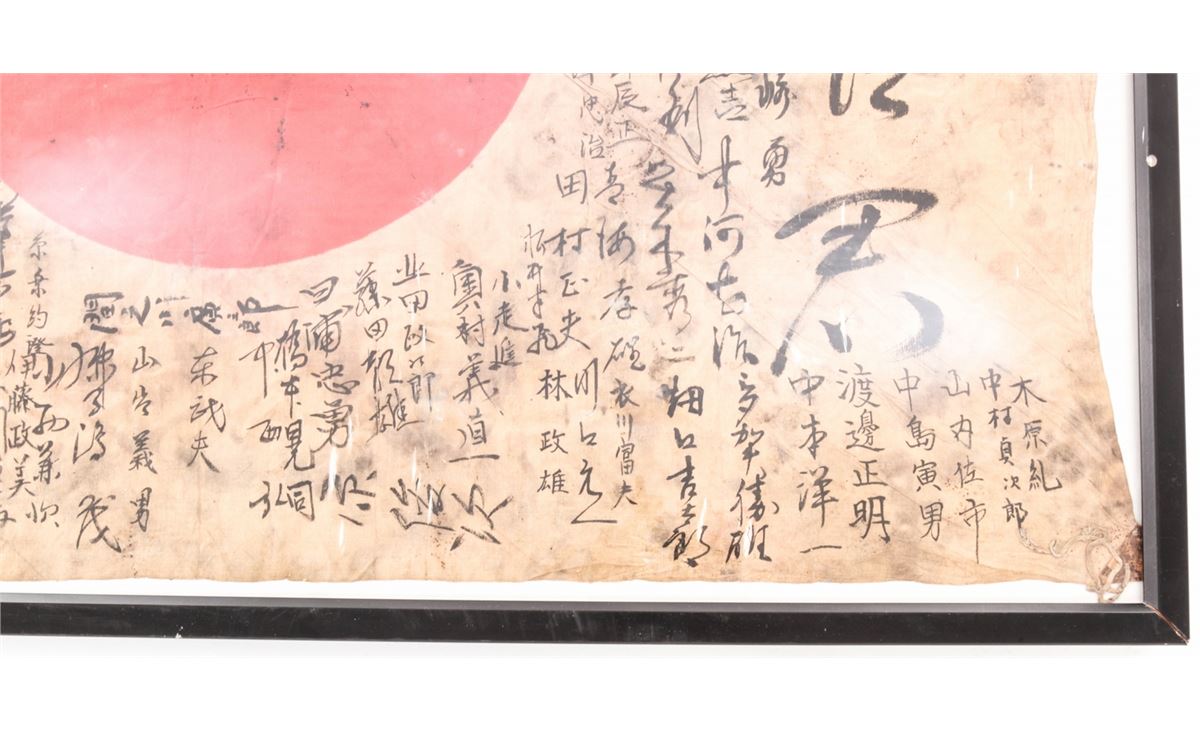 WWII Japanese Personal Soldier's Battle Flag, with signatures of friends and comrades, as well as Good luck slogans, approx. 30''x40''. Condition is fine with light tears to the silk and general soiling. Nicely framed and mounted. Est.: $200-$400.