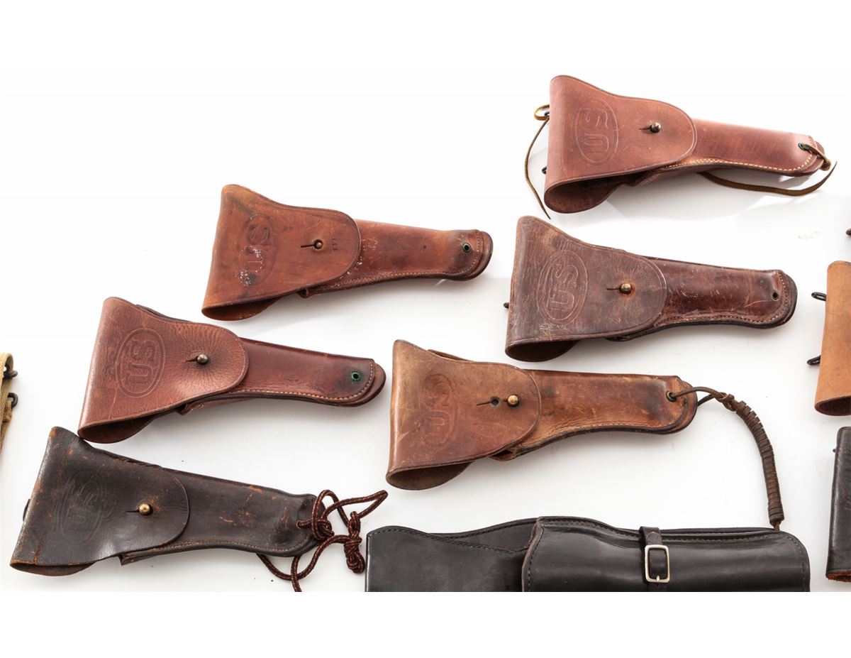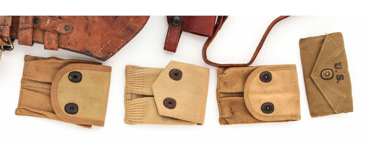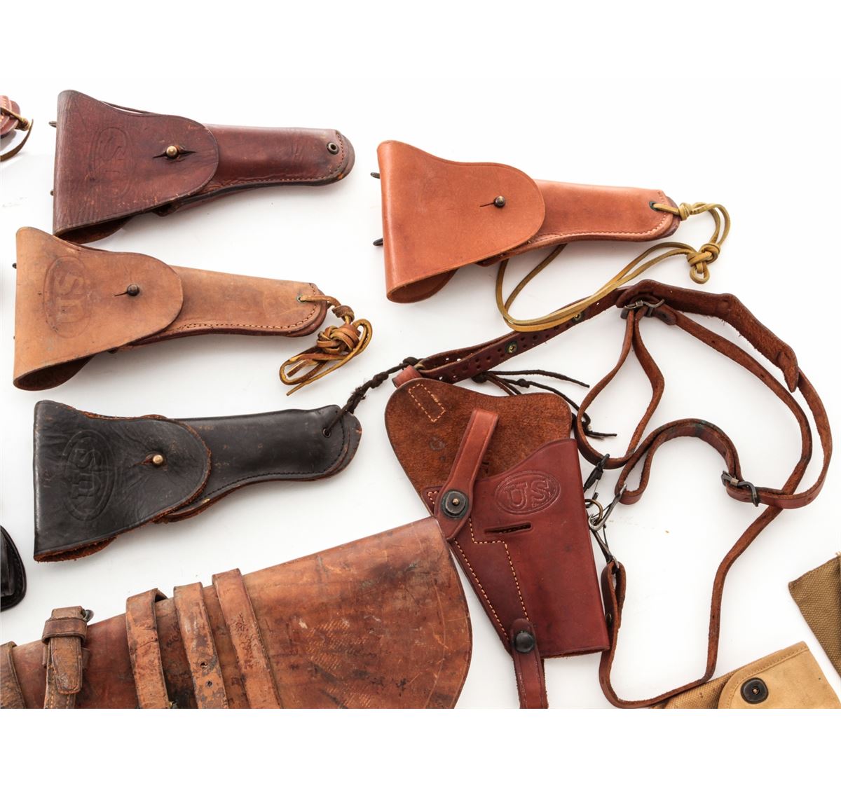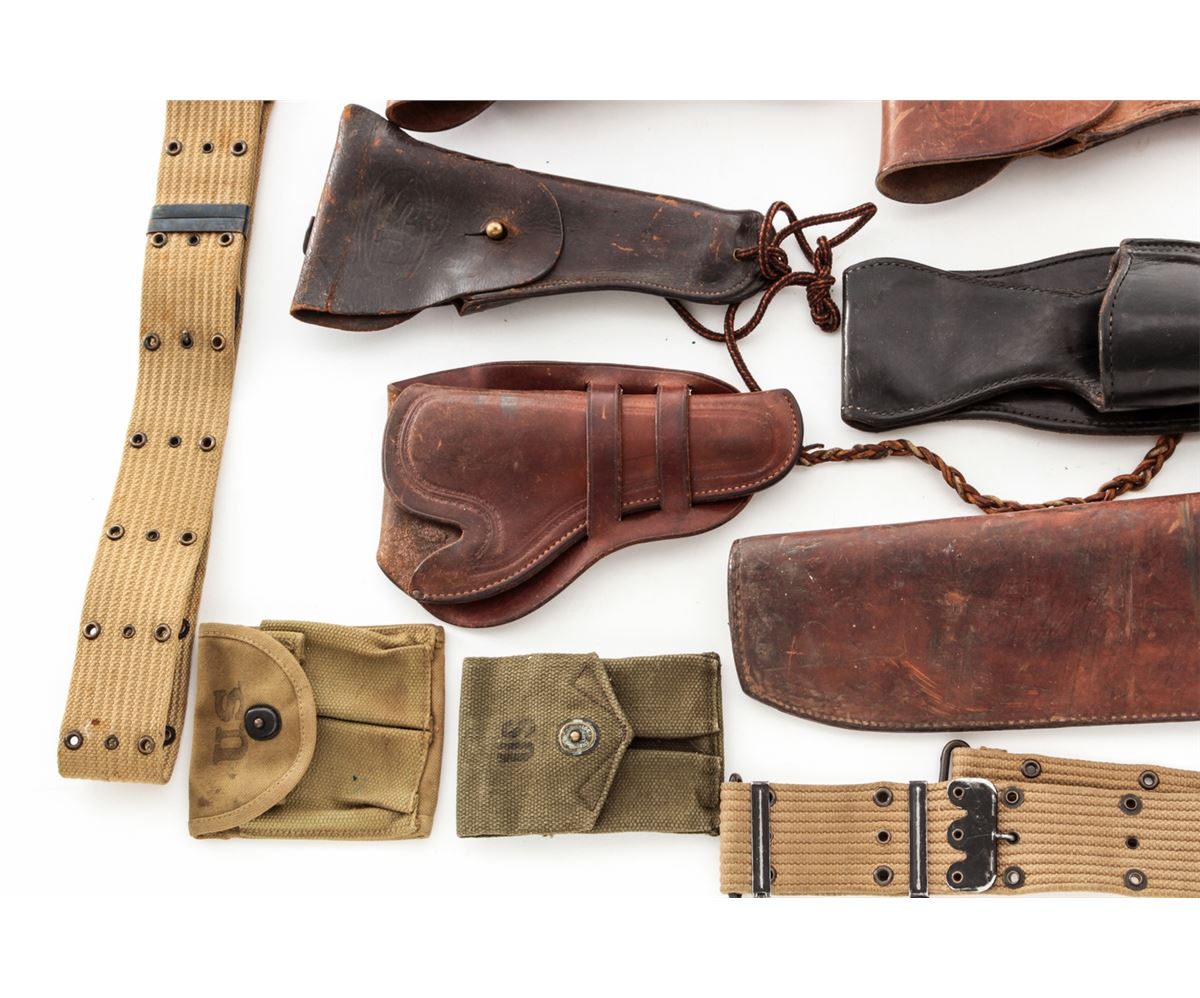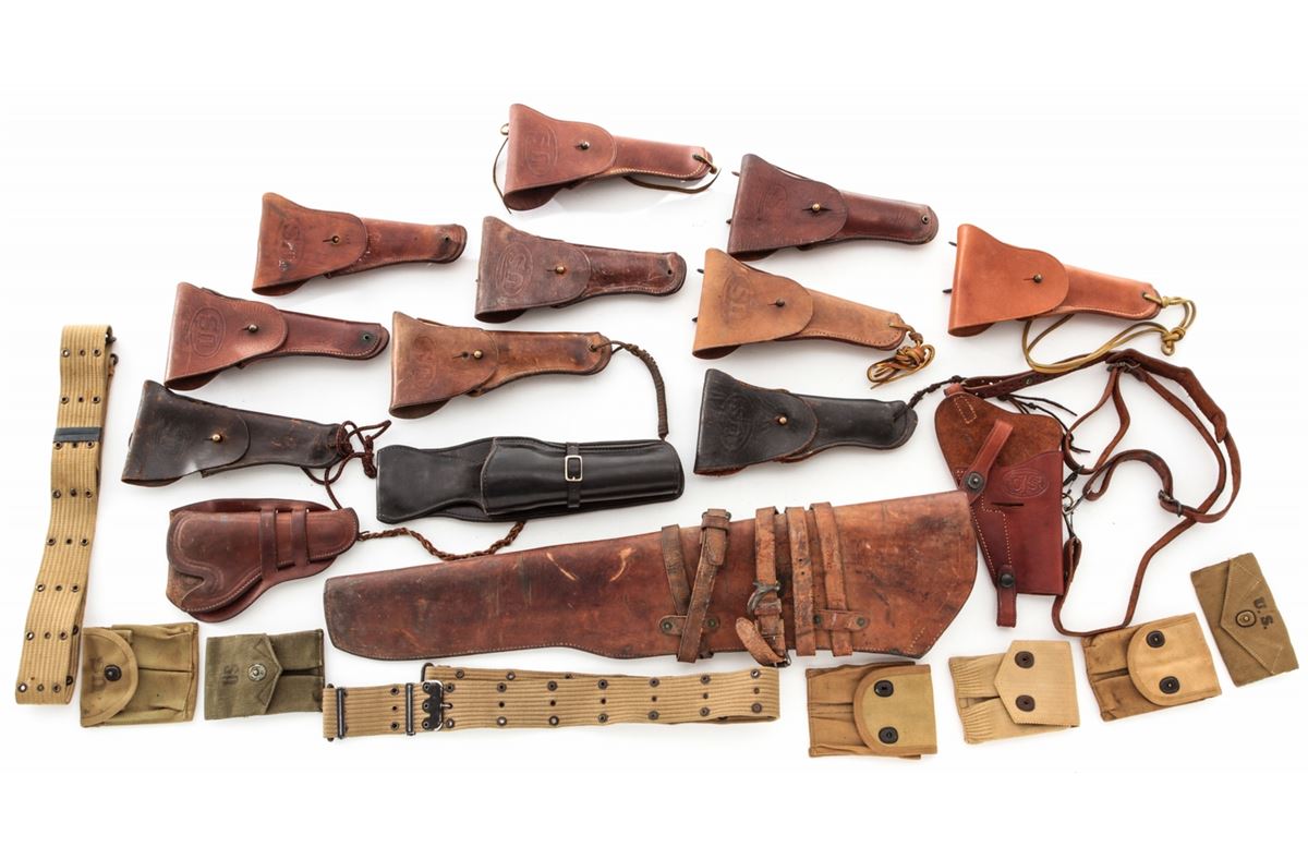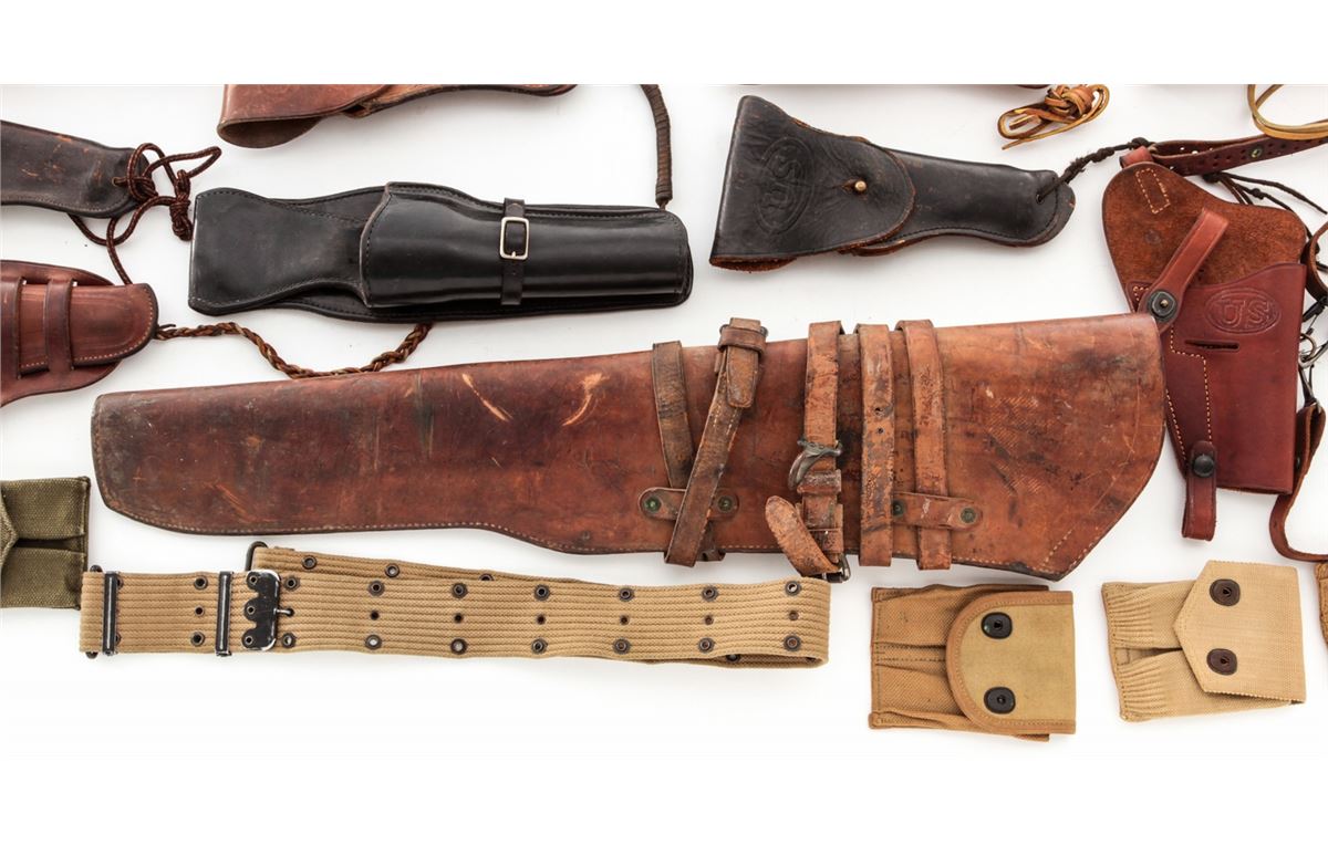 Lot of 20th Century U.S. GI Web Gear, including three (3) 1918 dated mag pouches for Model 1911s; one 1943 dated 1st aid pouch; one 1942 dated M1 Carbine mag pouch; 1945 dated Boyt holster for Model 1911-A1, as well as a WWII pistol belt; WWI 1918 dated leather holster for 1911 pistol and 1918 web belt by Mills; WWII era Tex Tan holster for 1911-A1; 1944 dated Warren Leather Goods holster for 1911-A1. All are in fine to excellent condition. Plus, a WWI era GI holster in fair condition, missing hanger; 1942 dated Boyt holster for 1911 in very good condition, with mild soiling; 1944 dated Milwaukie Saddlery holster for 1911 in very good condition, with mild soiling; WWII era M1 Garand leather scabbard with moderate wear, soiling, scuffs and oil darkening; two post-war leather holsters and one post-war magazine pouch in good condition showing moderate use. Current production brown leather M3 shoulder holster for 1911; one V.L.&A, Chicago, 1920s medium-frame revolver holster in very good condition; left-handed black leather Arvo Ojala quick-draw holster for 7-1/2'' barrel in near excellent condition; and one WWII Boyt 1942 dated holster for 1911-A1 pistol, in near mint condition. Est.: $750-$1,000/lot.