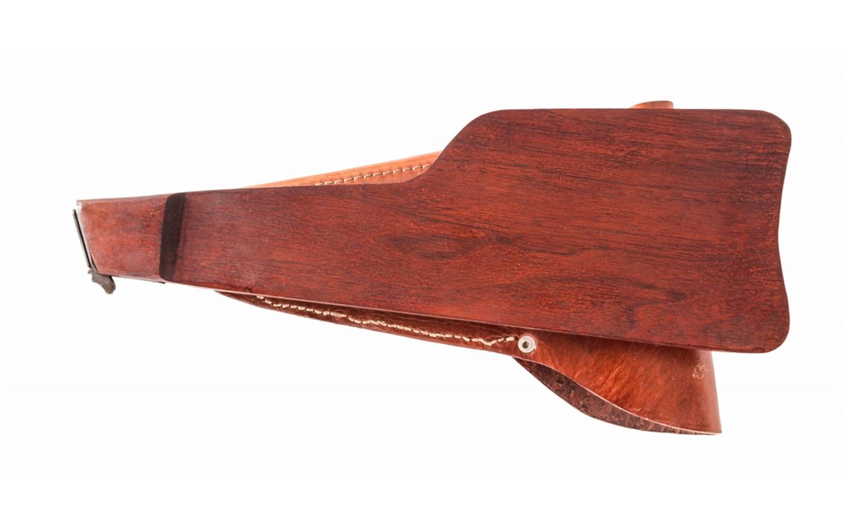 High Quality Browning P-35 Holster/Shoulder Stock, walnut and leather, with attaching iron. Condition is excellent. Est.: $300-$600.