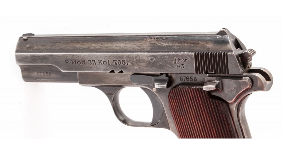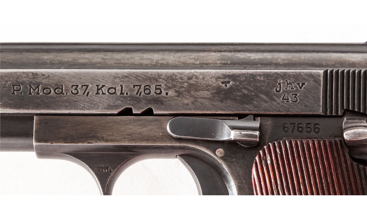 Femaru Model 37 Semi-Automatic Pistol, with German proofmarks, #67656, .32 Auto cal., 4'' barrel, blue finish, grooved walnut grips, with one factory magazine. Additionally marked ''JHV43''. Condition is very good retaining approx. 80% thinning blue. Grips show oil darkening. Good action, fine bore. With ''(stick eagle)/173'' ampt. Est.: $250-$450. (C&R/PPT)