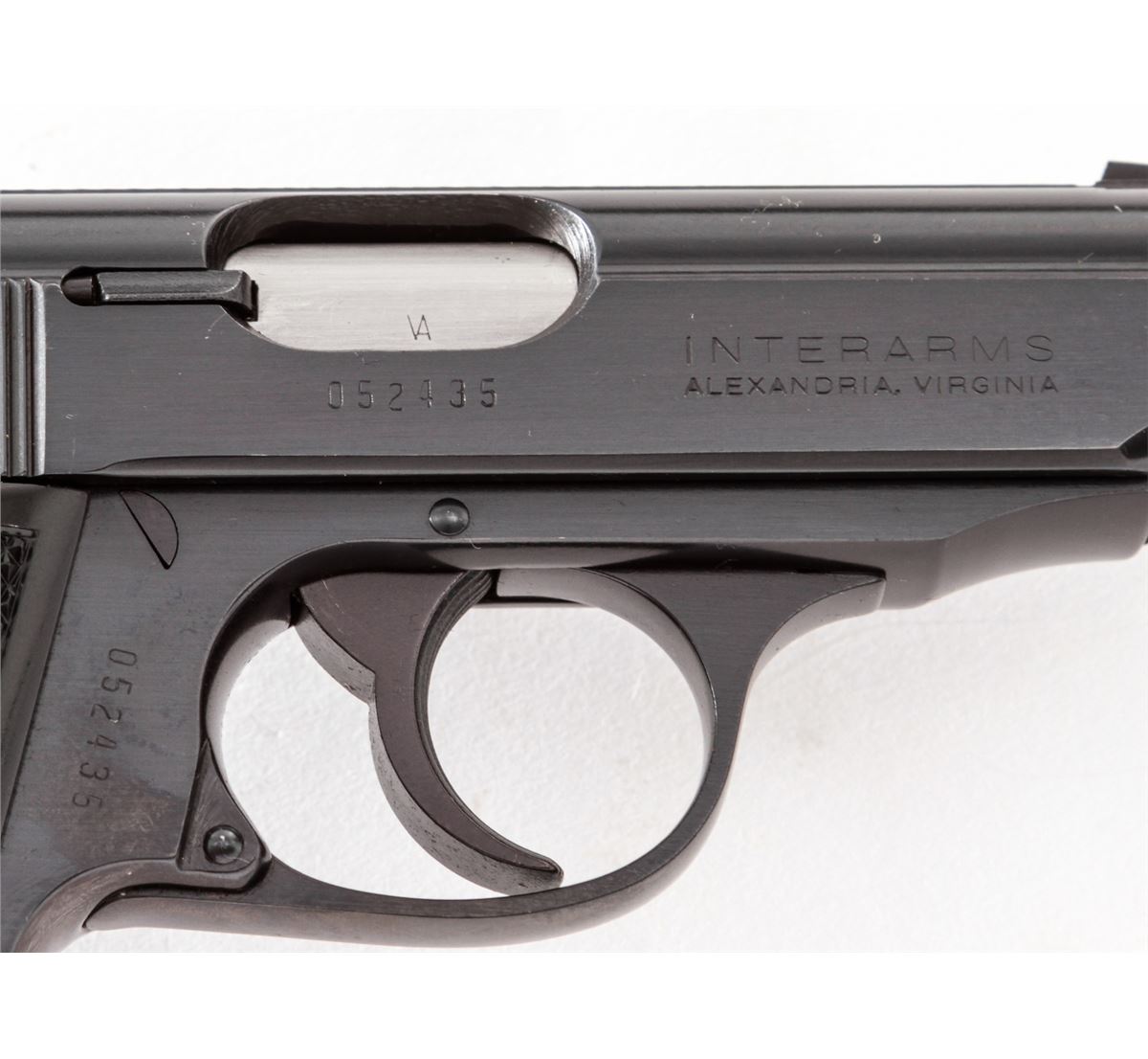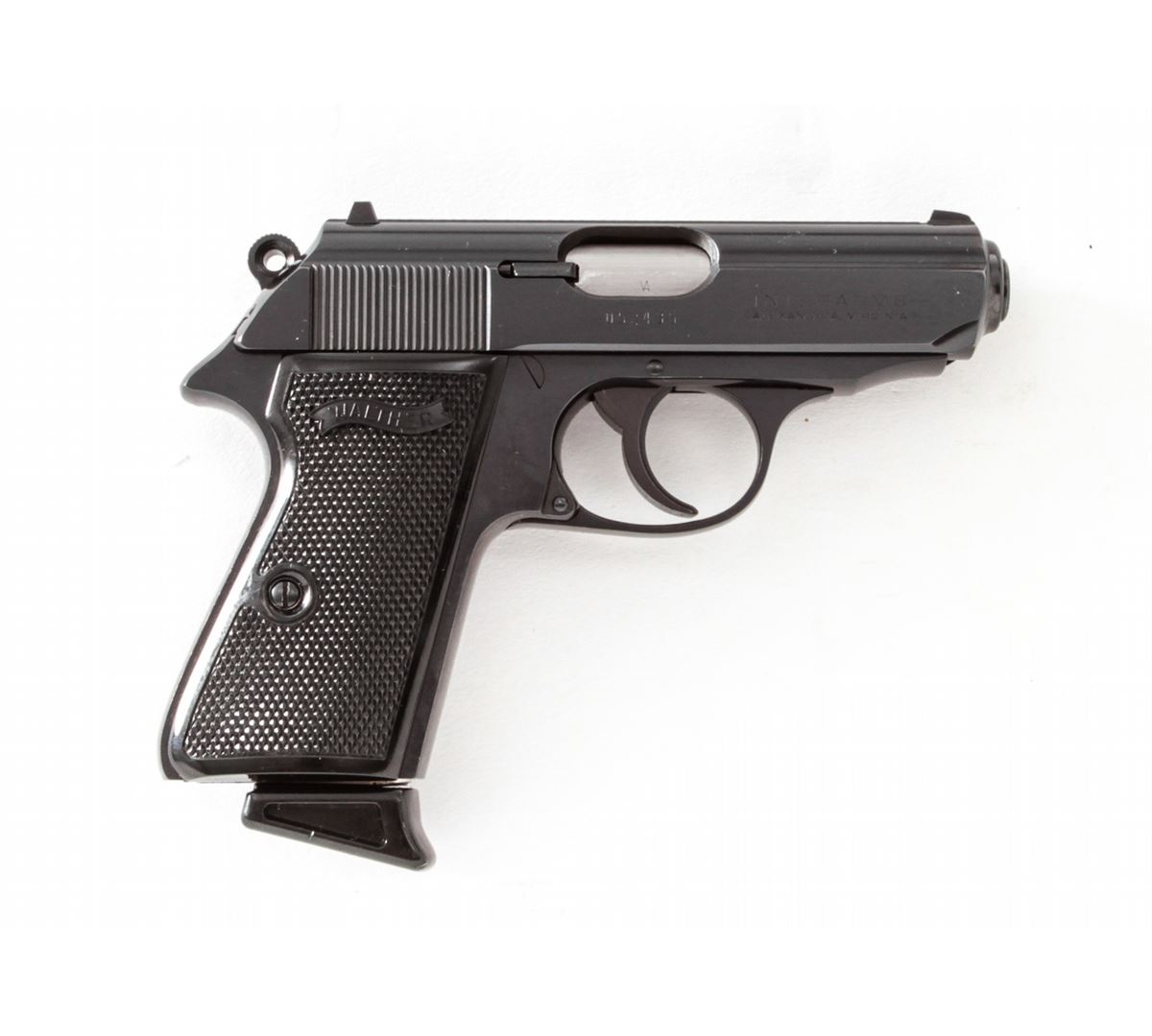 Walther PPK/S Semi-Automatic Pistol, #052435, .380 cal., 3-1/4'' barrel, blue finish, factory checkered black plastic grips, with both flat based and finger-rest magazines. As made under license in the USA. Condition is excellent showing only light marks from handling, with one minor scratch to top of slide. Grips and action are crisp, bore is excellent. Est.: $300-$500. (Modern/PPT)