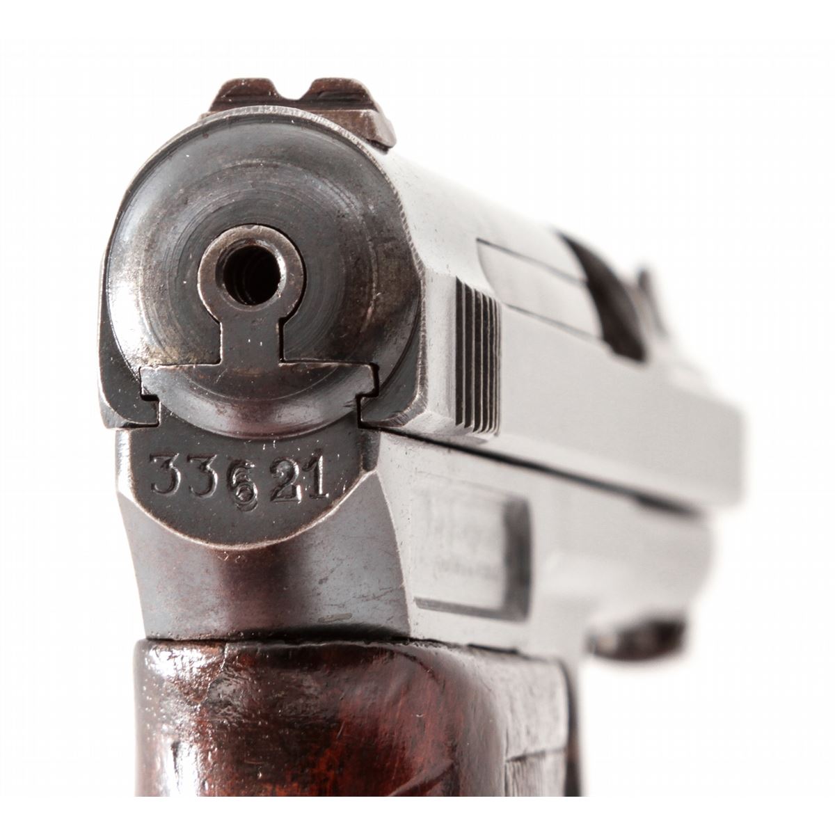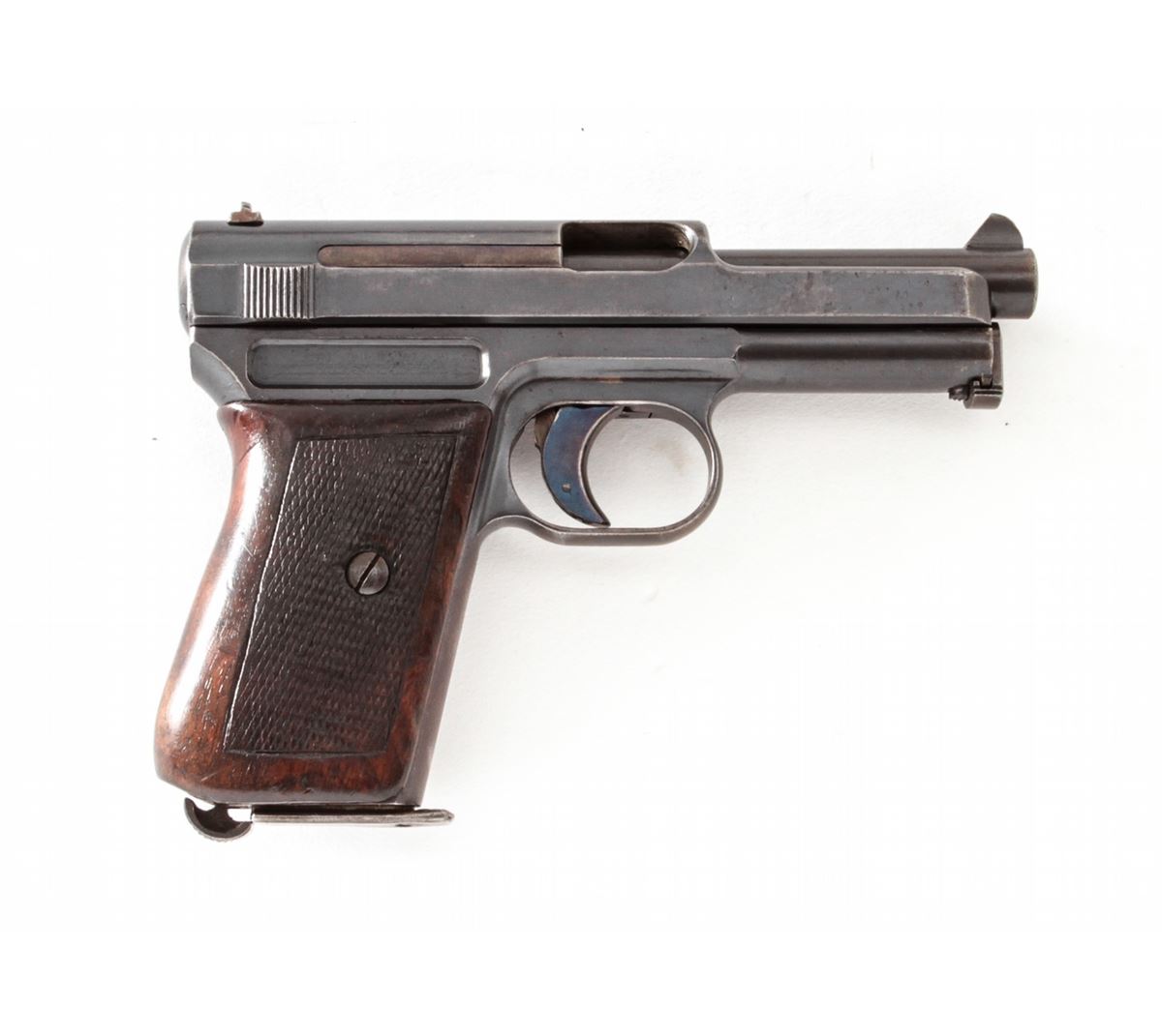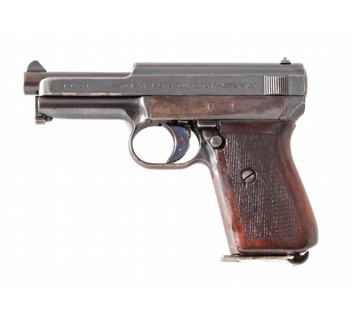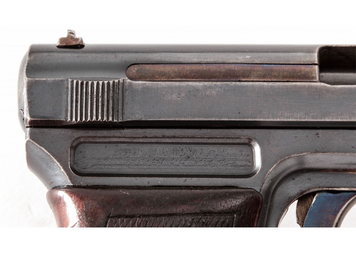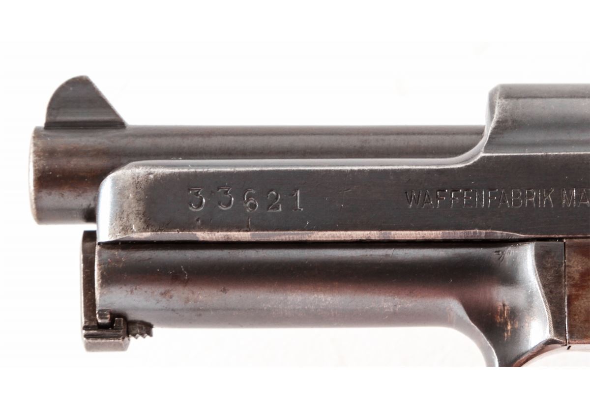 Mauser Model 1910 Semi-Automatic Pistol, #33621, .32 ACP cal., 3-3/8'' barrel, blue finish, wraparound checkered walnut grips, with one factory magazine. Early one-line barrel address to left side of slide. Condition is very good retaining approx. 85% thinning and toning blue; left side receiver flat has toned brown. Grips show moderate flattening, with good action and bright bore. Est.: $250-$450. (C&R/PPT)