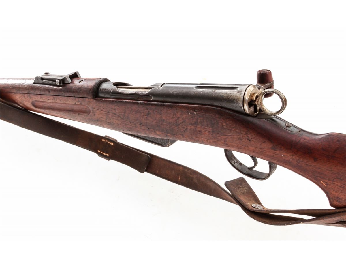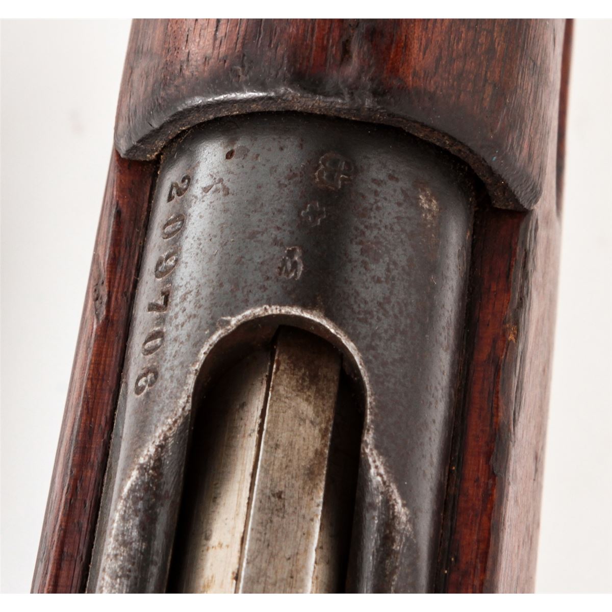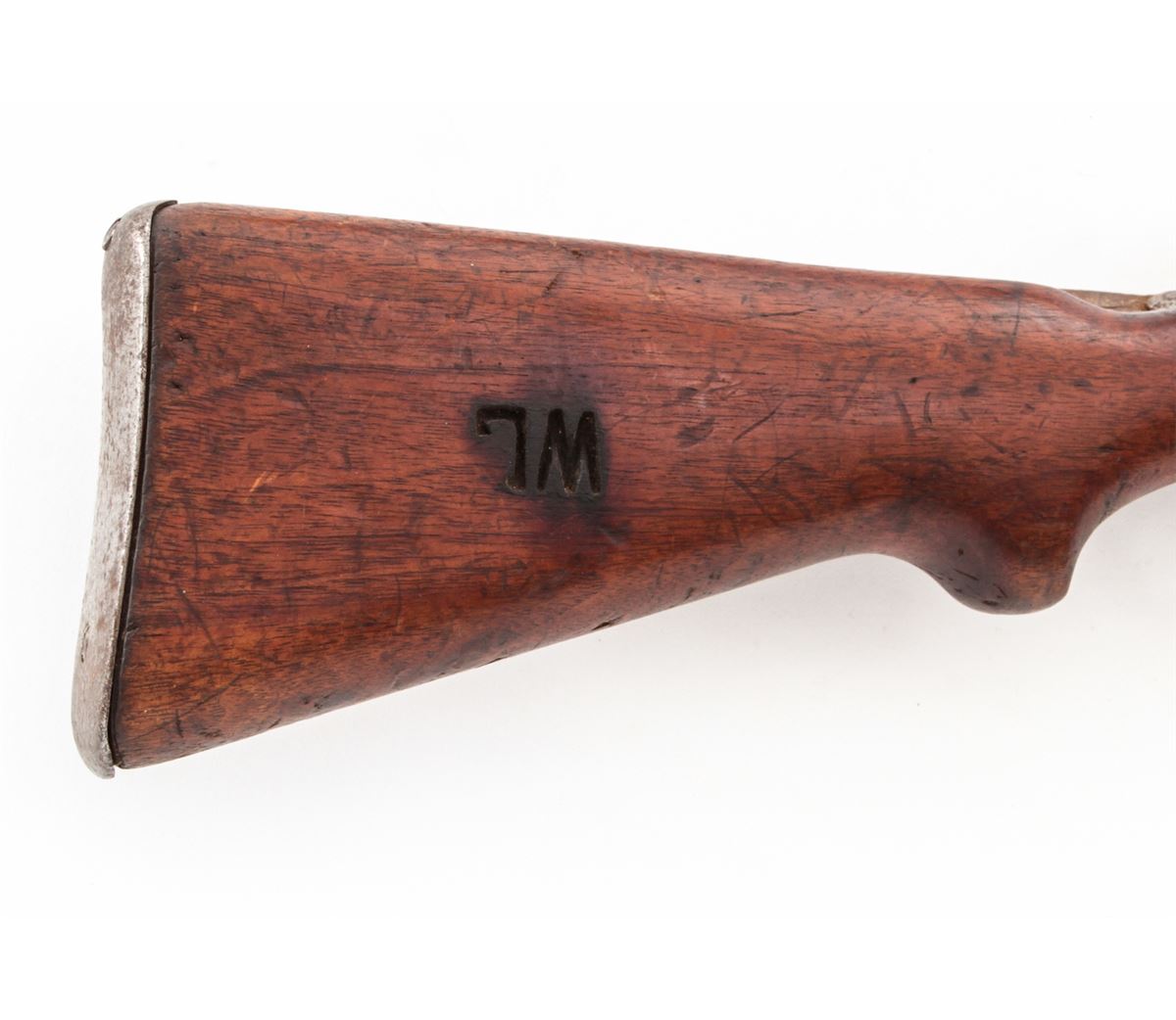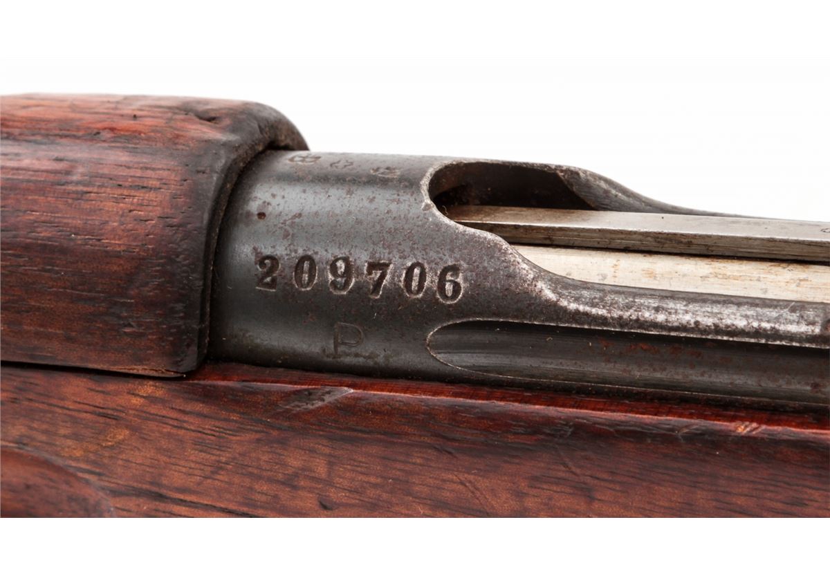 Schmidt-Rubin Model 1911 Straight-Pull Rifle, #209706, 7.5x55mm Swiss, 23'' barrel, blue finish, European walnut stock, with sling. Lightly import marked at muzzle. Condition is fair retaining approx. 85% thinning and toning blue, with wear to rearward portion of receiver. Stock with heavy scuffs, oil darkening and scratches. Right side cheekpiece area has been branded with initials ''WL''. Good action and bore. Est.: $100-$200. (C&R)