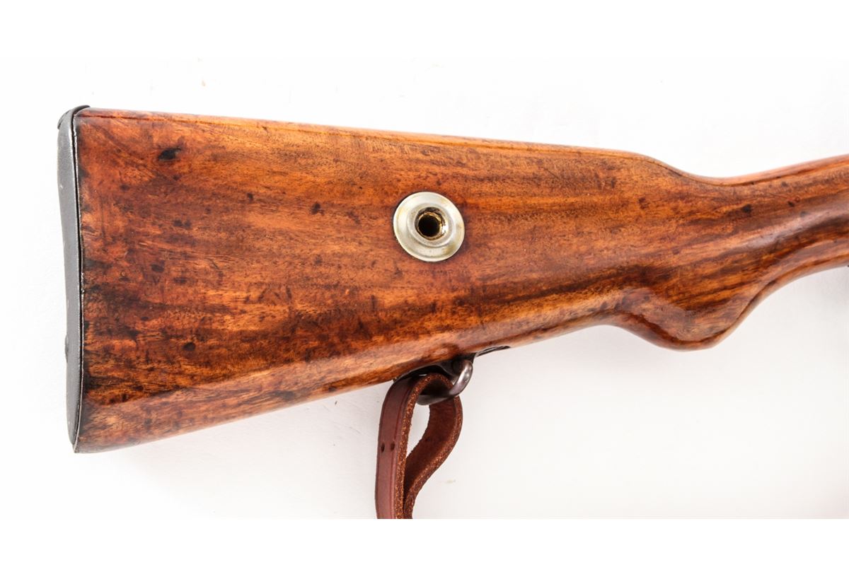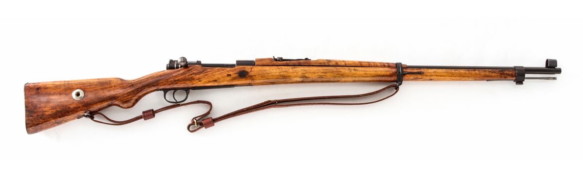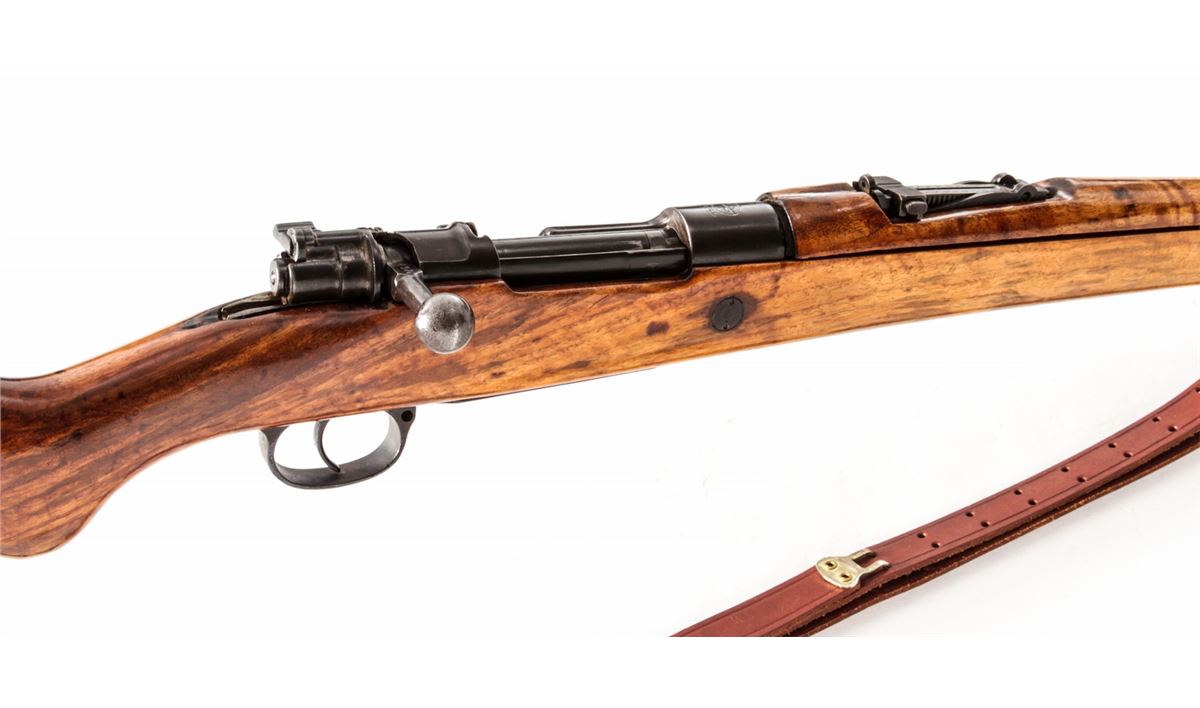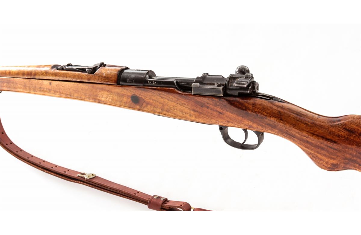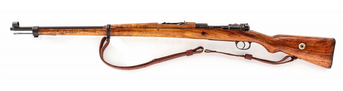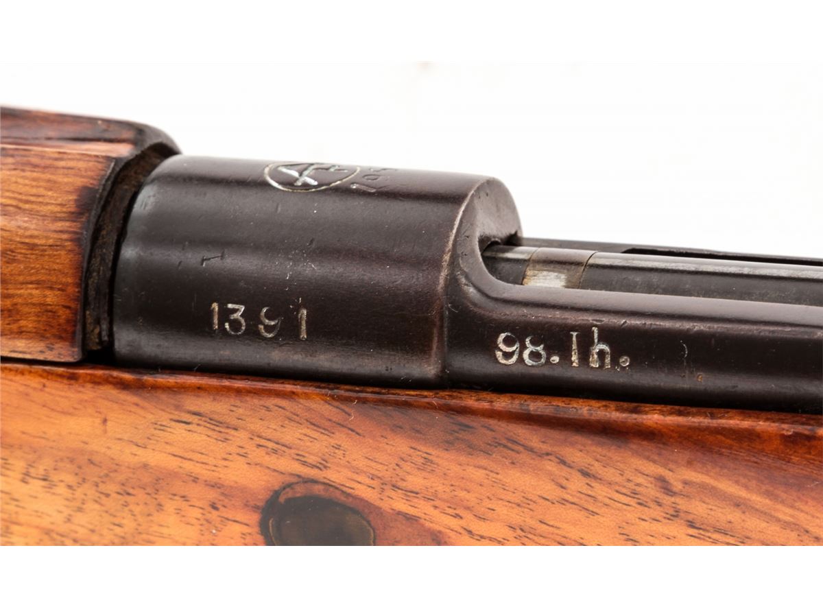 Gewehr 98 (1954) Bolt Action Rifle, #1391, 8mm, 29'' barrel, arsenal blue finish, varnished walnut stock and upper handguard. Chamber marked with ''AFT'' monogram over 1954 date. Left side rail of frame marked ''98.lh''. Magazine follower with Imperial proofmarks. Condition is very good as overhauled and re-marked, retaining approx. 80% blue. Stock with oil darkening and later varnished finish. Mismatched small parts. Good action and bore. Lightly import marked. Est.: $250-$450. (C&R)