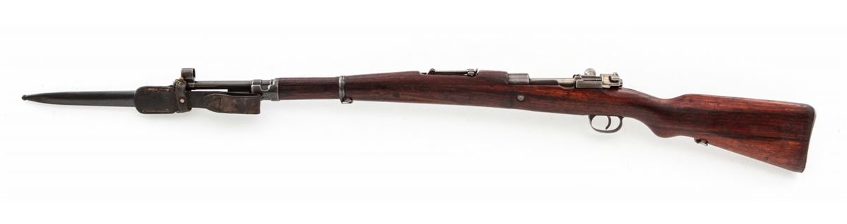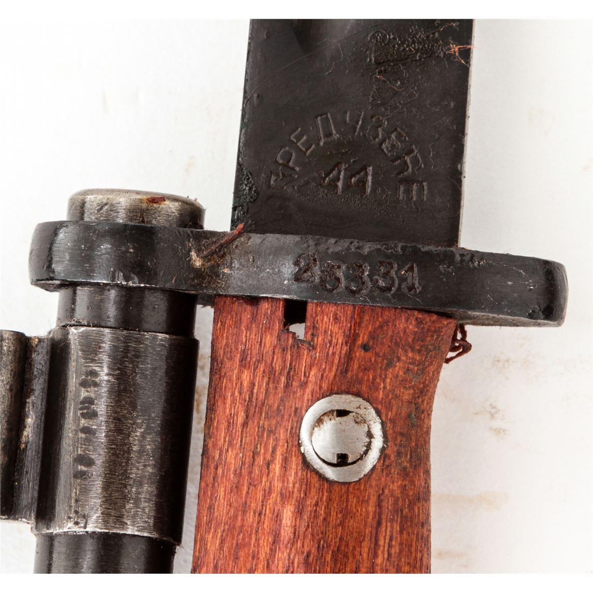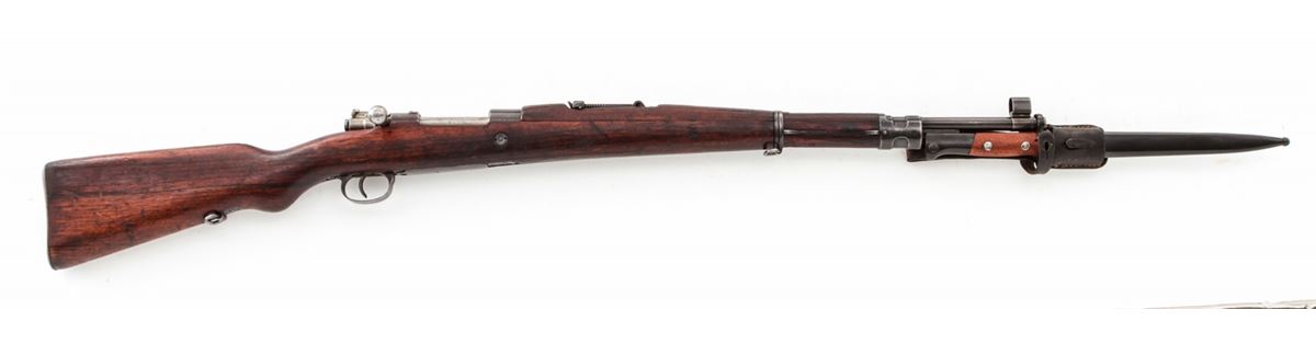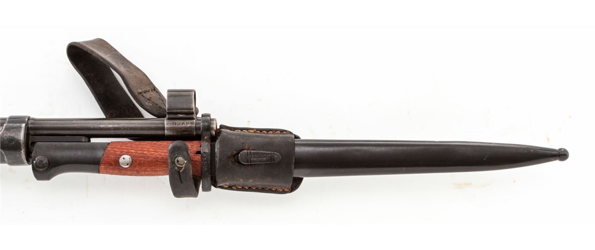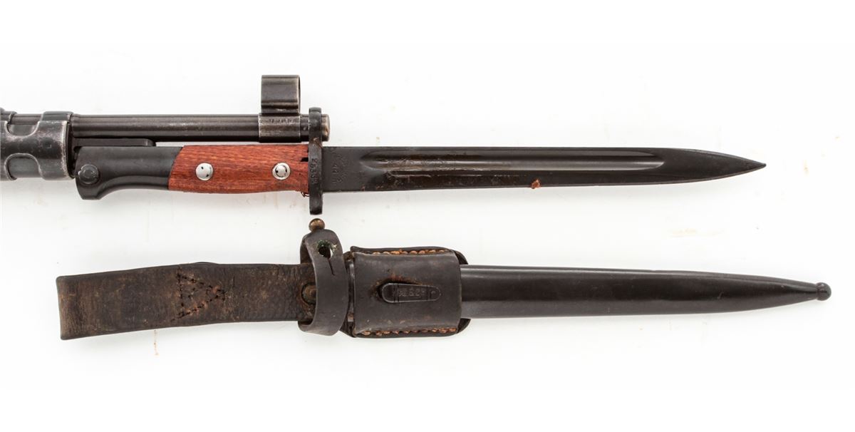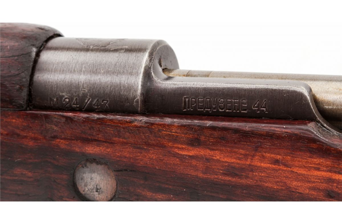 Yugo M24/47 Bolt Action Rifle, #6566, 8mm, 23-1/2'' barrel, blue finish, European walnut stock. Condition is very good to near fine, as lightly import marked, with matching bolt, stock, and force-matched triggerguard, and bayonet and scabbard. Metal surfaces retain approx. 85% evenly thinning blue. Stock with light scuffs, marks and oil darkening. Good action and bore. Est.: $250-$450. (C&R)