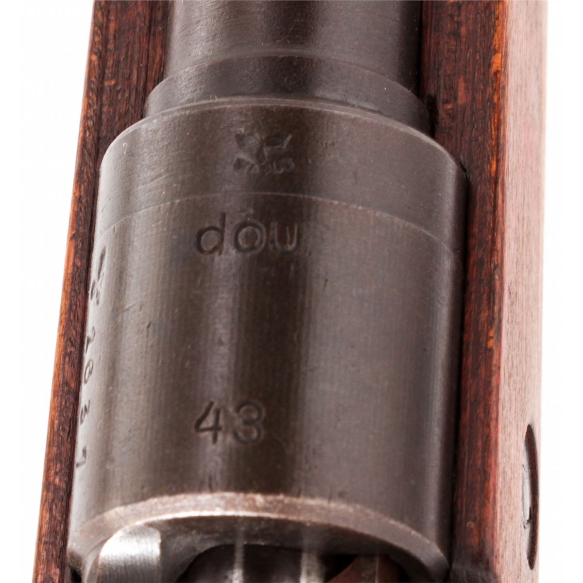 WWII German Model 98K Bolt Action Rifle, by Waffen Werke Bystrica (dou/43), #2637e, 8mm, 24'' barrel, matte blue finish, all visible matching numbers except forward barrel band, laminated beech stock. Condition is fine with light general overall toning to metal surfaces. Stock with light impressions and clear markings. No imports marks visible. Good action, fine bore, ramrod included. Est.: $500-$750. (C&R)