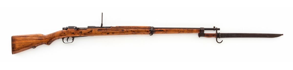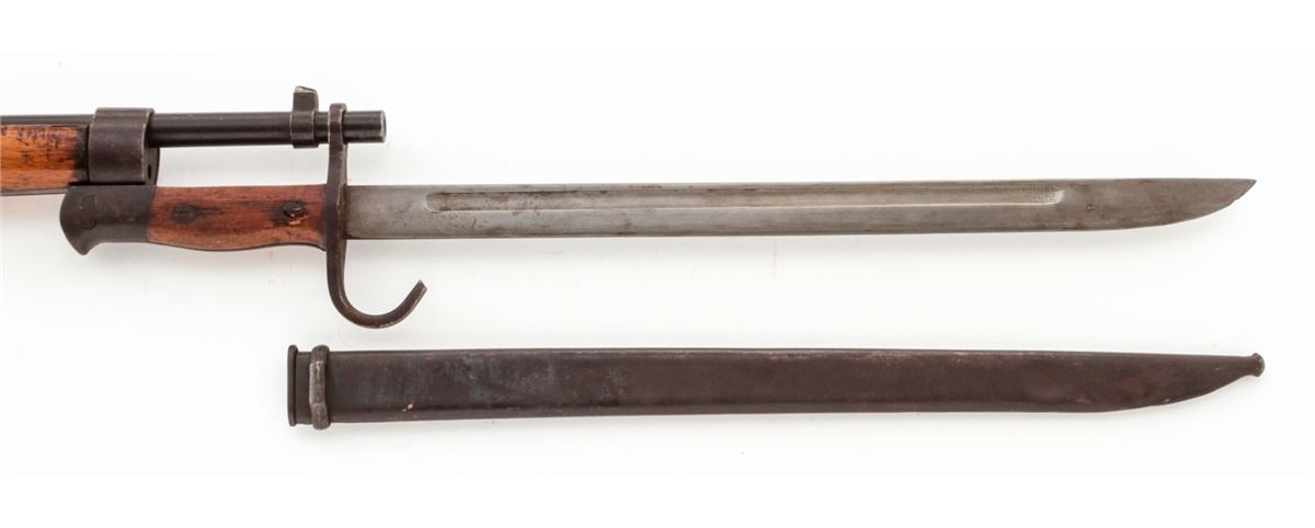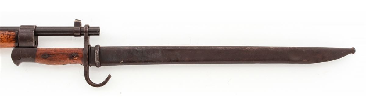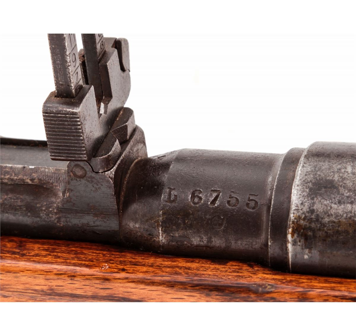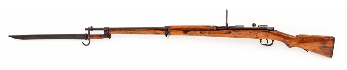 Italian made Japanese Type I Bolt Action Rifle, #L6755, 6.5mm, 31'' barrel, blue finish, hardwood stock. Condition is very good retaining approx. 60% thinning and toning blue. Stock with sanding, repairs and extra varnish. Good action and bore. Japanese bayonet and scabbard are included. Est.: $150-$300. (C&R)