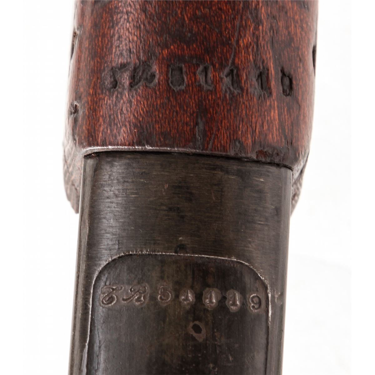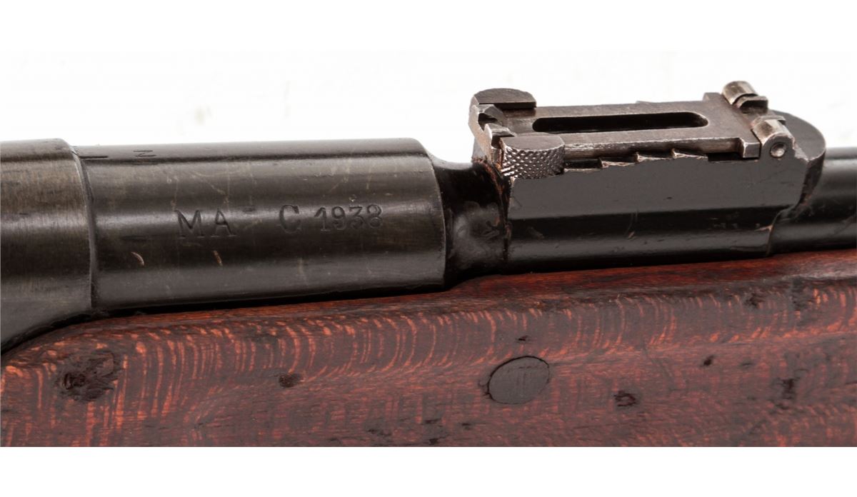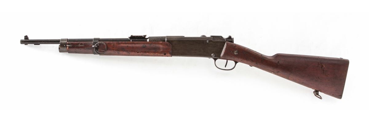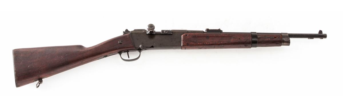 Lebel Model 1886/M93/R35 Bolt Action Carbine, by Chatellerault, #51119, 8mm Lebel cal., 19'' barrel, stove black finish, walnut stock and handguard. Condition is good retaining approx. 85% arsenal black. Stock with moderate scuffs. Action is crisp, bore is very good. Appears all matching except for bolt. Est.: $200-$400. (Antique)