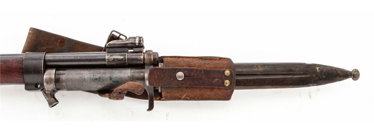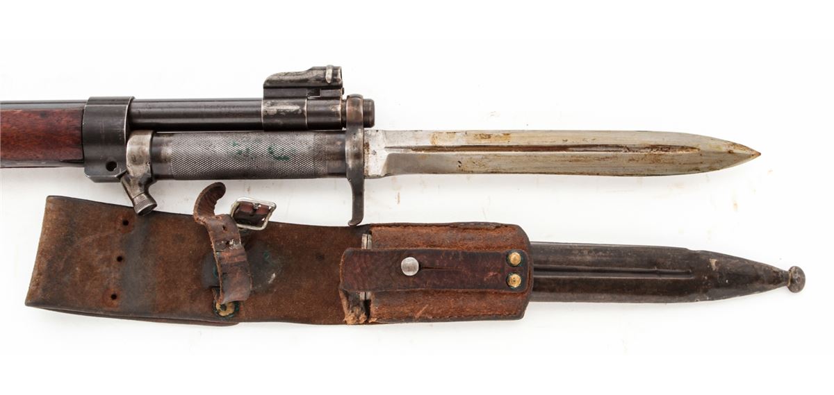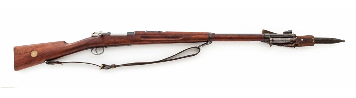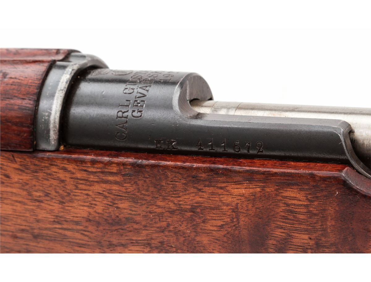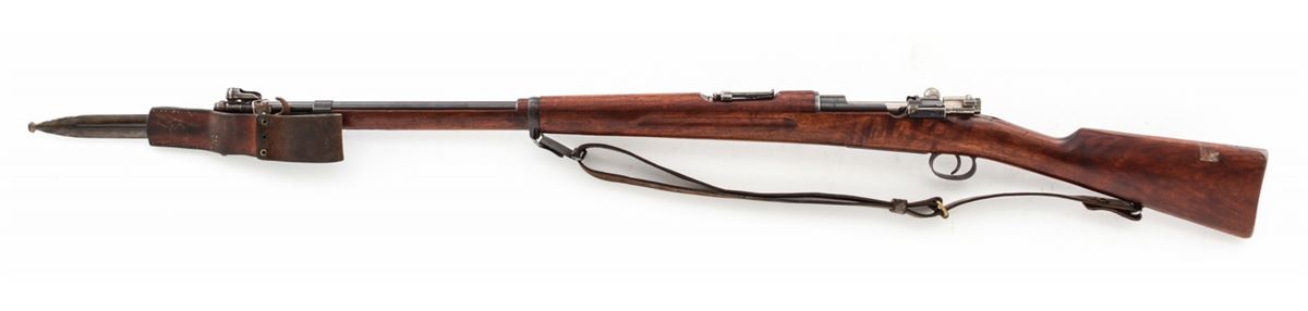 Swedish Model 1896 Bolt Action Rifle, by Carl Gustafs (1917), #411672, 6.5x55mm, 29-1/2'' counter-bored barrel, blue finish, matching numbered walnut stock, leather sling, with mismatched bayonet and scabbard. Condition is excellent as lightly import marked, with all visible matching numbers. Rifle retains approx. 96% original blue. European walnut stock with just light scuffs. Good action, fair to good bore. Est.: $250-$450. (C&R)
