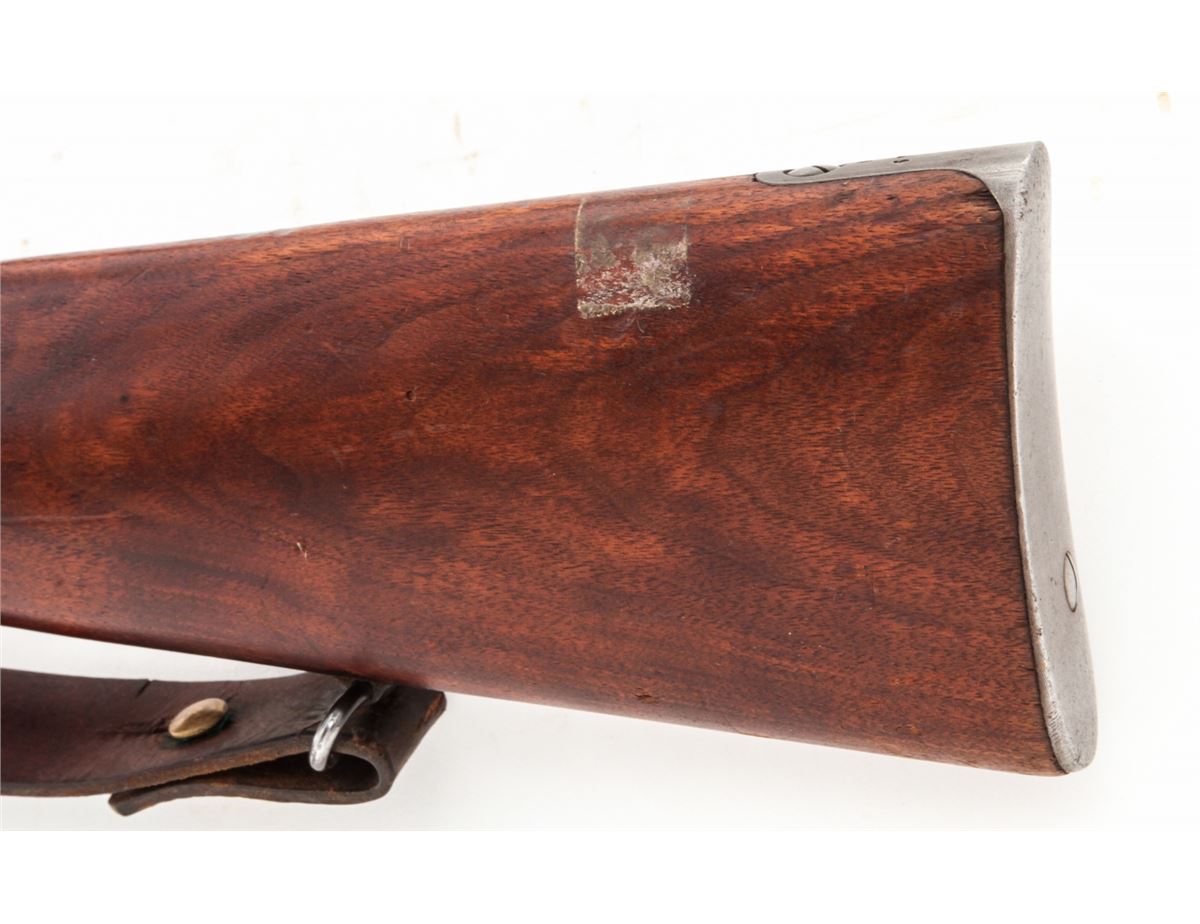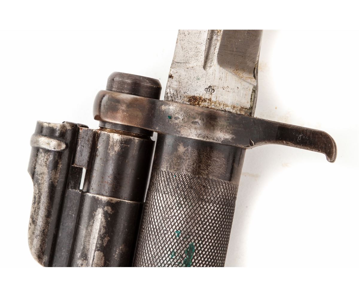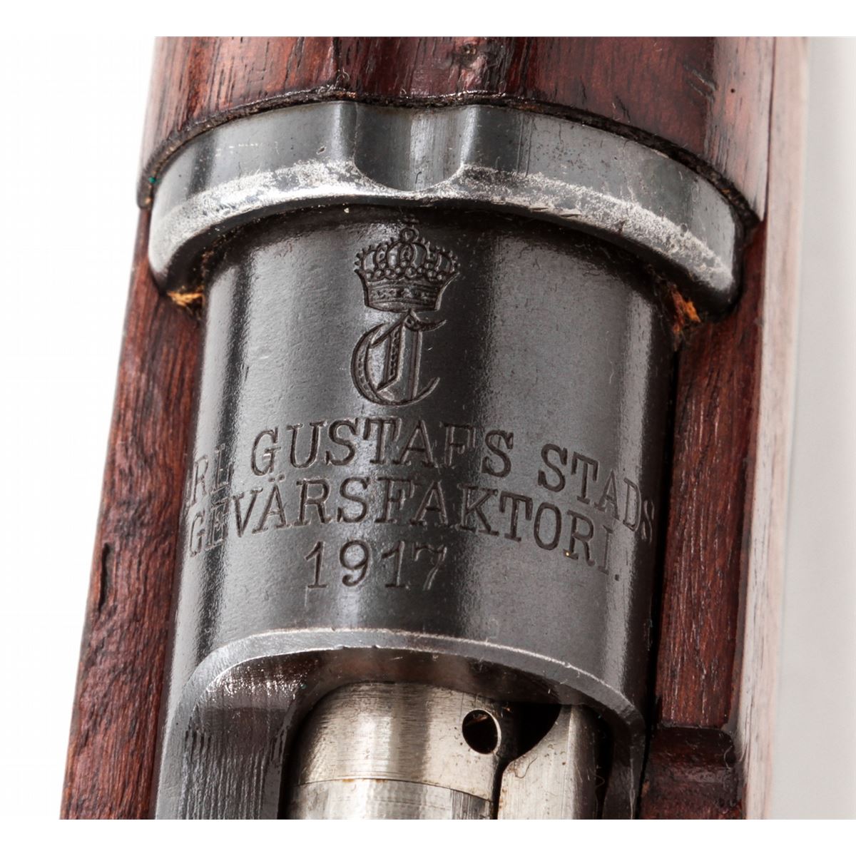 Swedish Model 1896 Bolt Action Rifle, by Carl Gustafs (1917), #411672, 6.5x55mm, 29-1/2'' counter-bored barrel, blue finish, matching numbered walnut stock, leather sling, with mismatched bayonet and scabbard. Condition is excellent as lightly import marked, with all visible matching numbers. Rifle retains approx. 96% original blue. European walnut stock with just light scuffs. Good action, fair to good bore. Est.: $250-$450. (C&R)