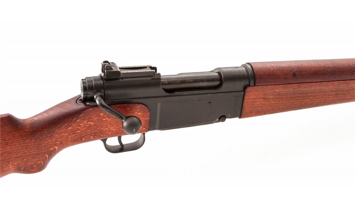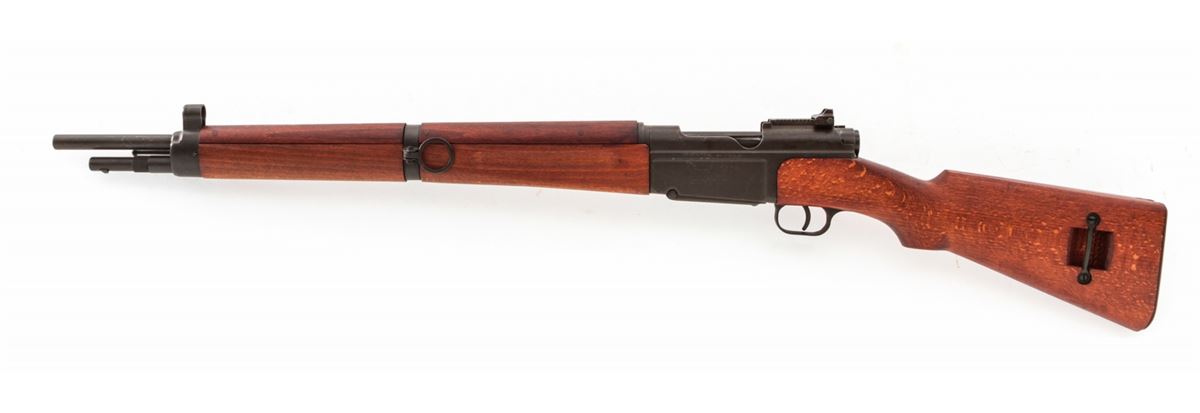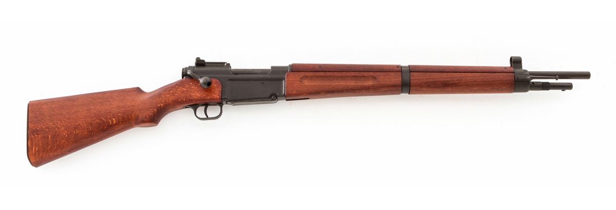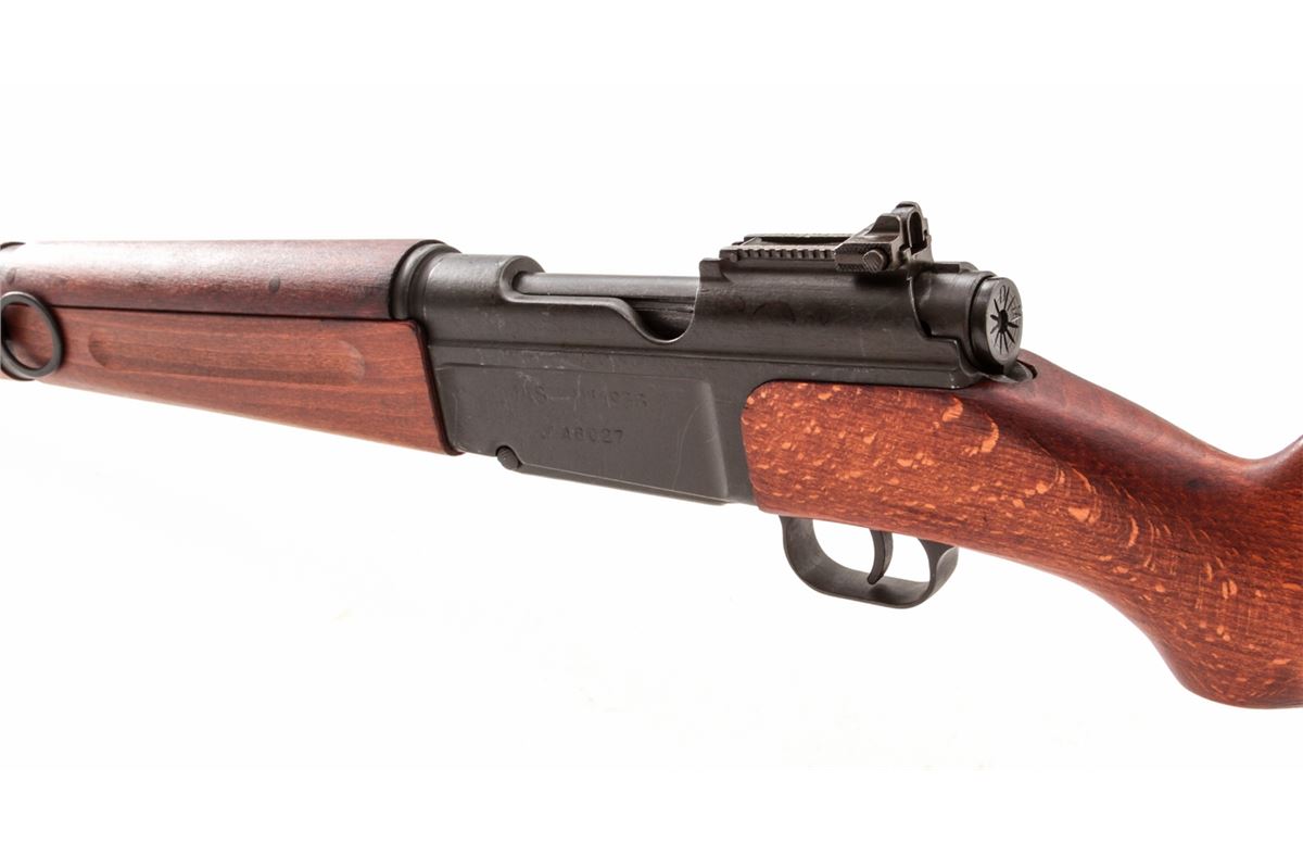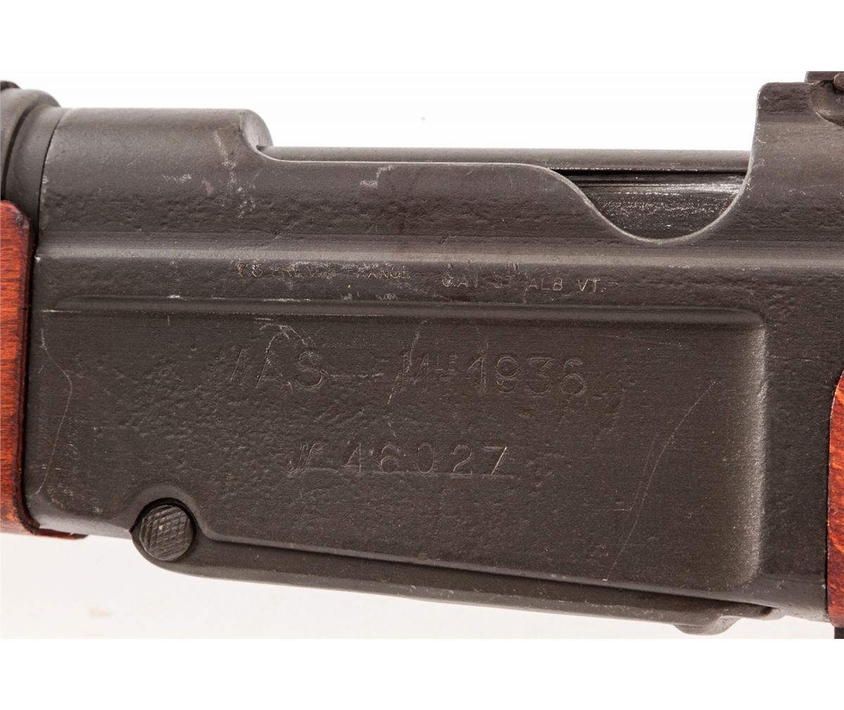 French MAS M1936 Bolt Action Rifle, #N46027, 7.5x54 cal., 22-1/2'' barrel, parkerized finish, beechwood stock and forend, with bayonet. Condition is fine as arsenal reworked and lightly import marked. Approx. 98% parkerized finish remains over mildly pitted frame. Stock and handguards are new and date from the mid-1970s when most of these rifles were overhauled. Action and bore are good. Est.: $200-$400. (C&R)