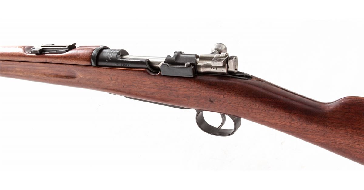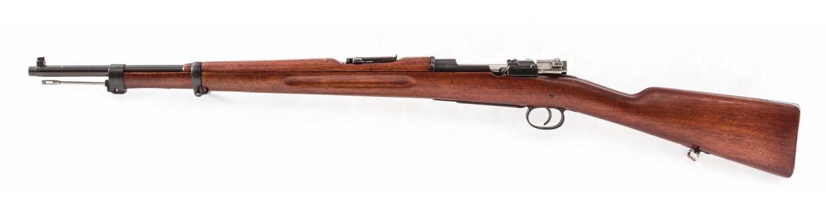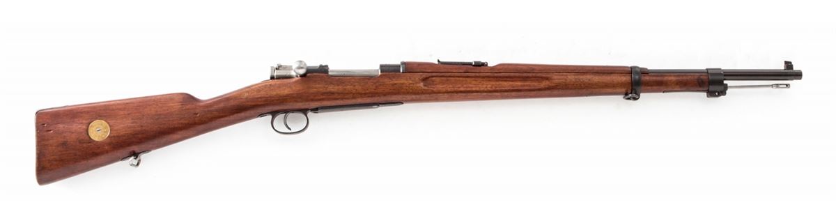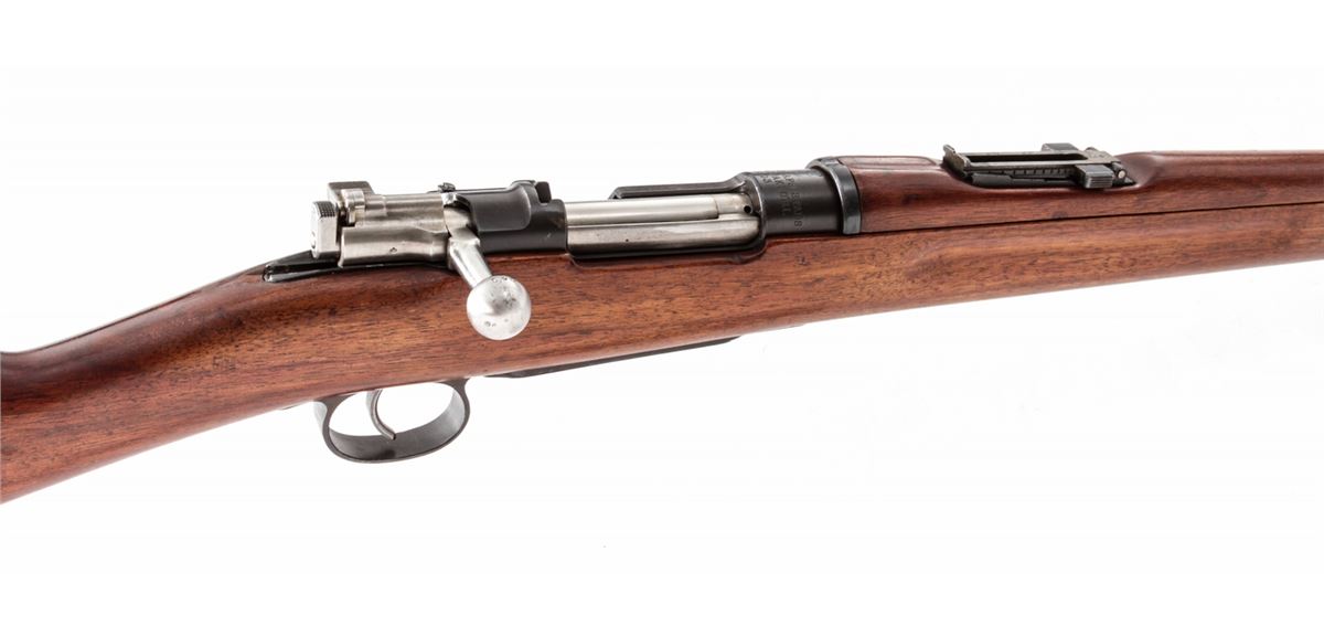 Swedish Model 96/38 Bolt Action Short Rifle, by Carl Gustafs (1905), #132141, 6.5x55mm, 24'' barrel, blue finish, walnut stock and handguard. Condition is fine retaining approx. 98% blue. All matching small parts. Sanded and oil finished stock. Good action and bright bore. Lightly import marked. Est.: $250-$400. (C&R)