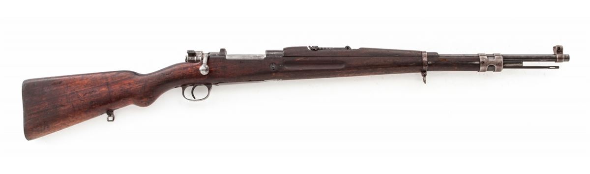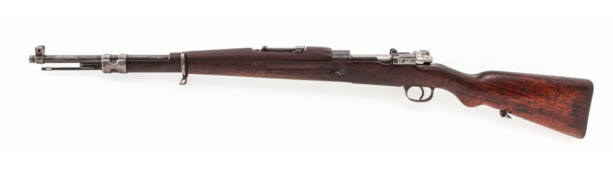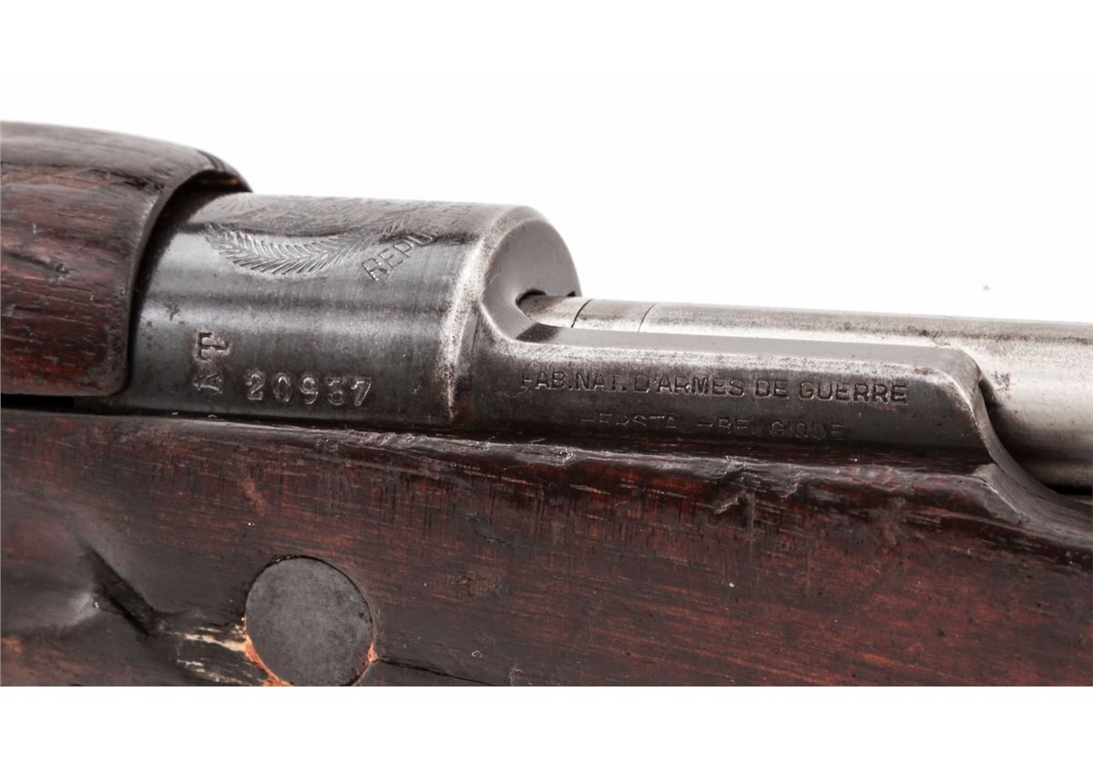 Peruvian Modelo 1935 Bolt Action Rifle, by FN, #20937, 7.65x53 cal. (Arg.), 23-1/2'' barrel, blue finish, walnut stock, with Peruvian crest to chamber area. Condition is good as lightly import marked at muzzle, retaining approx. 80% blue. Stock with heavy scuffs and oil darkening, and fracture to upper handguard and crossbolt. Good action, very good bore. Est.: $200-$400. (C&R)
