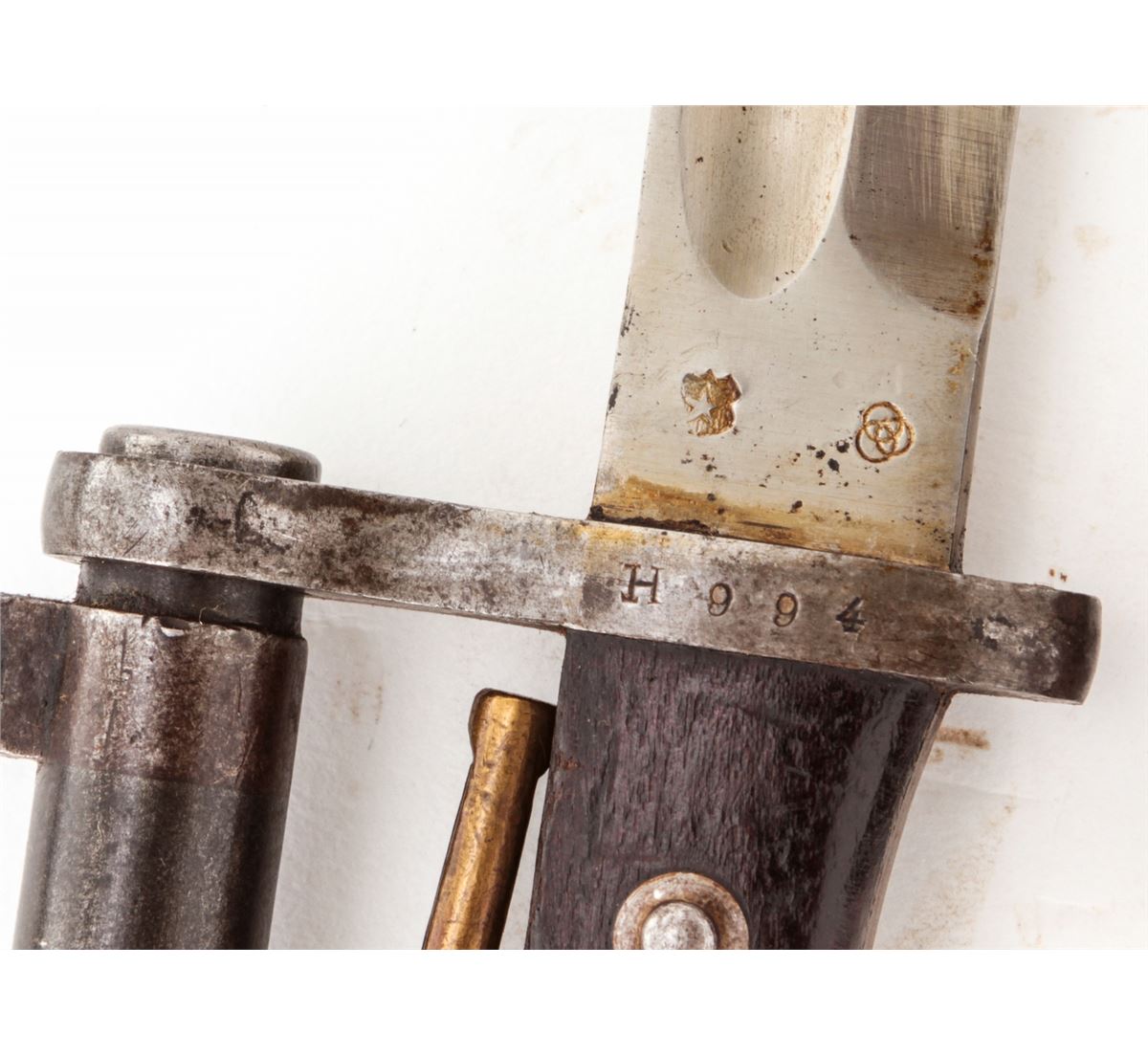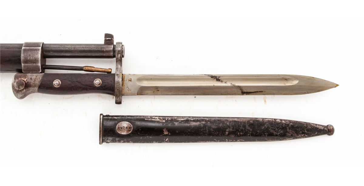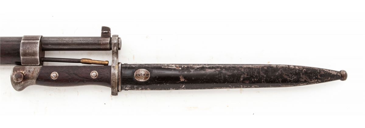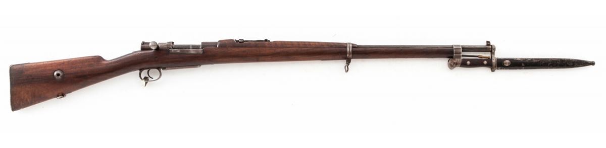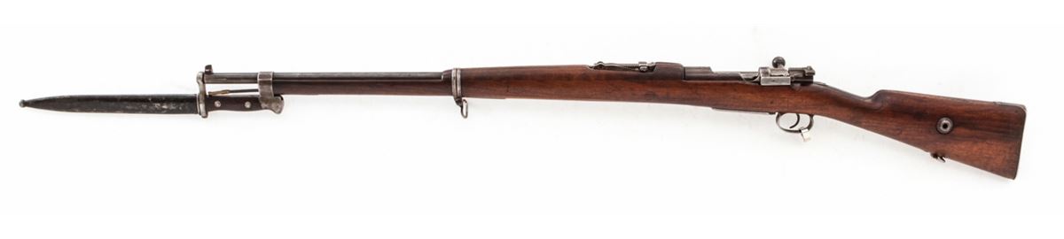 Turkish Model 1893 Mauser Bolt Action Rifle, #12944, 8mm, 29'' barrel, blue finish, European walnut stock, with bayonet. Condition is good as import marked, retaining approx. 65% arsenal finish. Stock with scuffs and impressions and some oil darkening. Matching numbered bolt, with bright bladed Weyersberg bayonet. Good action, very good bore. Est.: $150-$300. (C&R)