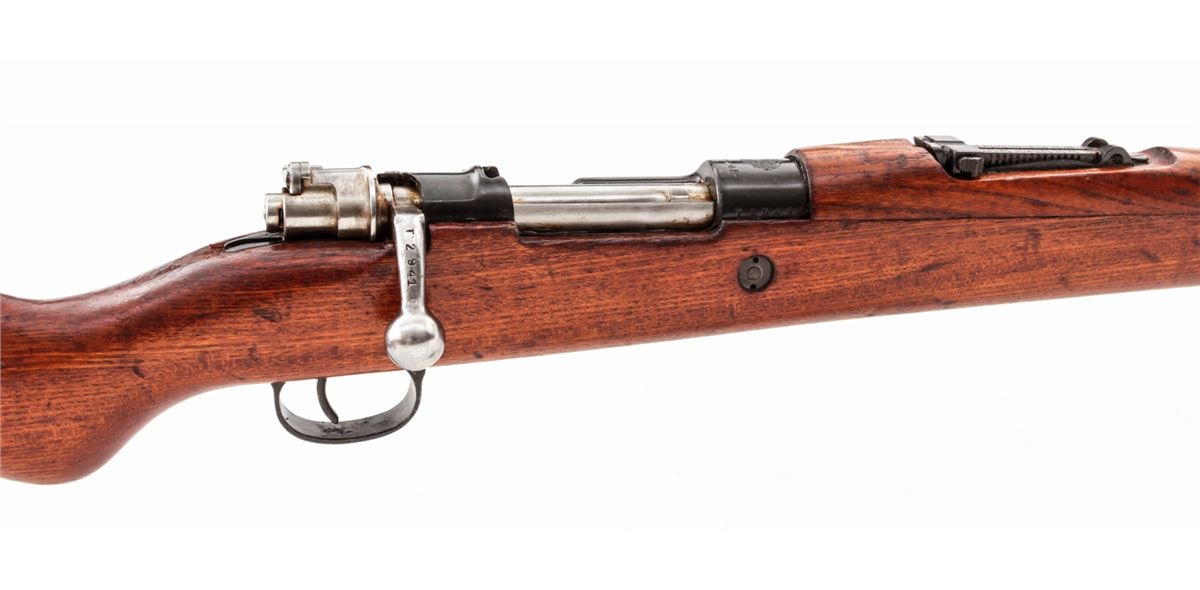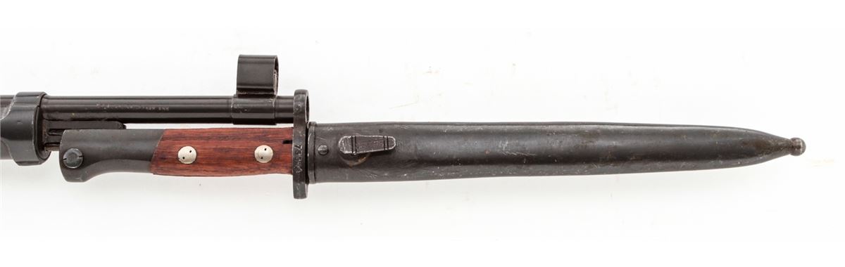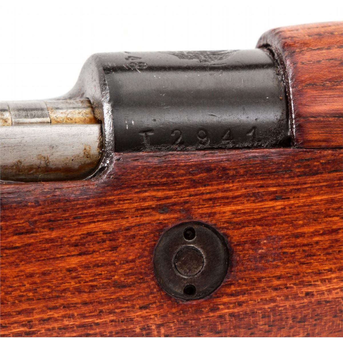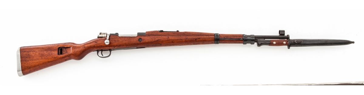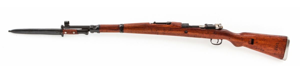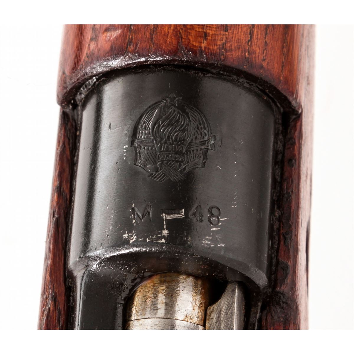 Yugo M48 Bolt Action Rifle, #T2941, 8mm, 23-1/2'' barrel, blue finish, European walnut stock. Condition is fine to near excellent, as lightly import marked, with matching bolt, stock, and triggerguard, and bayonet and scabbard. Metal surfaces retain approx. 95% evenly thinning blue. Rifle is covered in cosmoline. Good action, bright bore. Est.: $250-$450. (C&R)