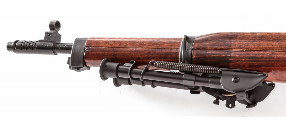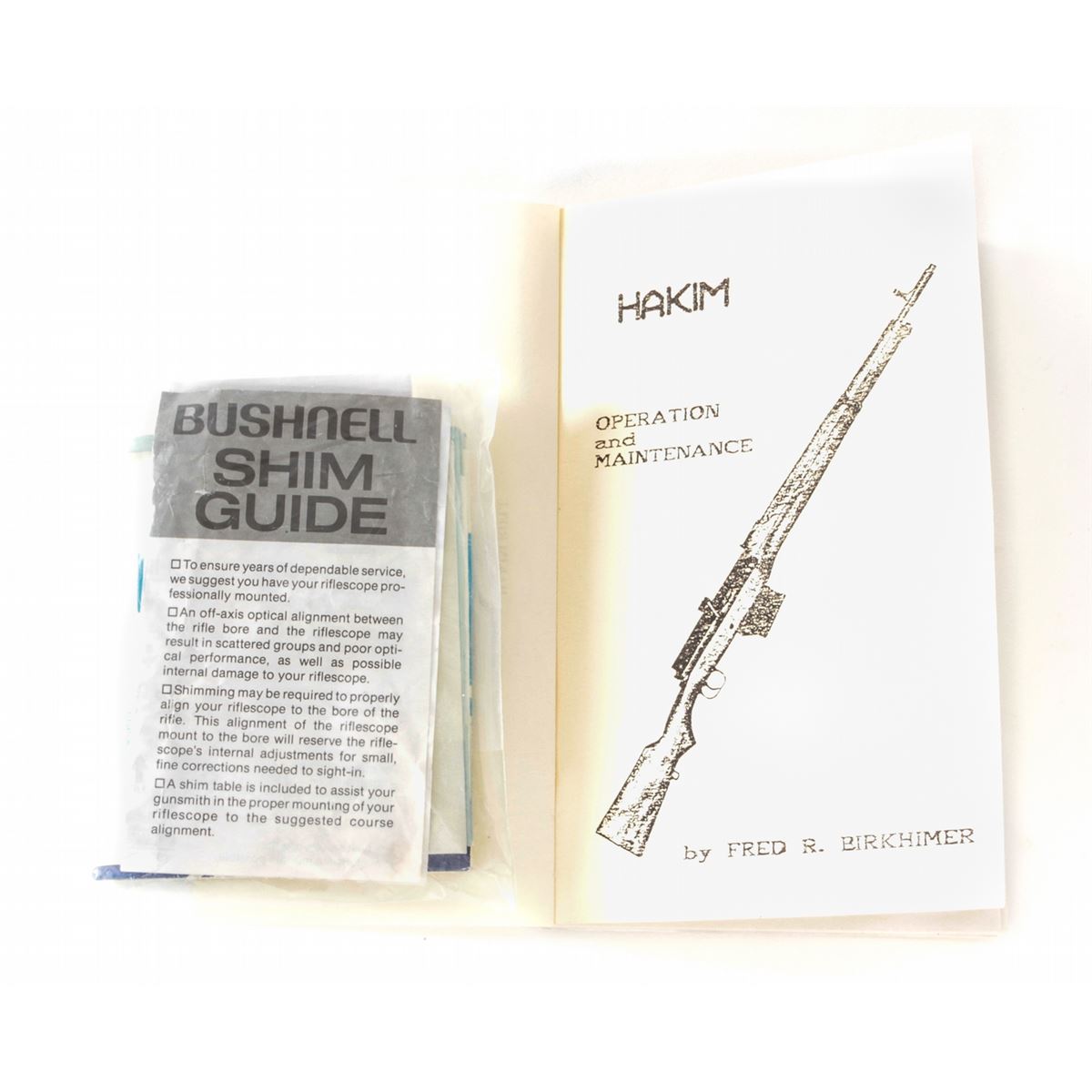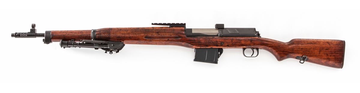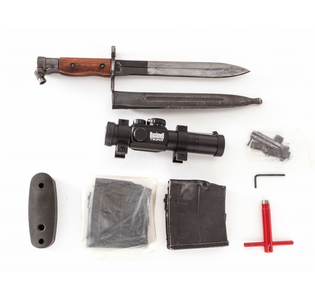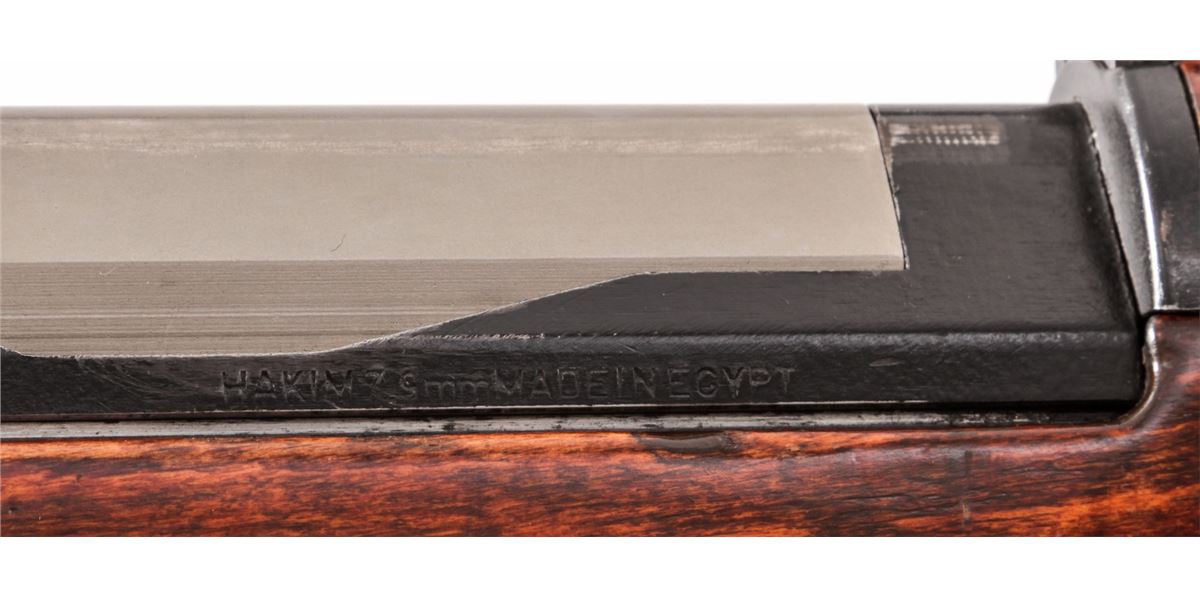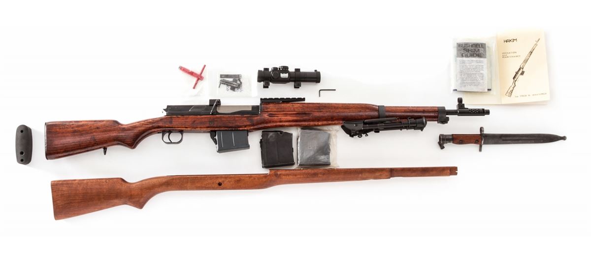 Egyptian Hakim Semi-Automatic Rifle, with accessories, NVSN, 8mm, 24'' barrel, blue finish, beech stock, with added sight rail, bipod, three (3) aftermarket magazines, bayonet, Bushnell Trophy 1x28 scope, newly made beechwood stock, manual, and aftermarket rubber butt pad. Condition is excellent retaining approx. 85% original thinning blue. Stock with light scuffs and marks and added varnish. Good action, bright bore, lightly import marked. Est.: $450-$650. (C&R)