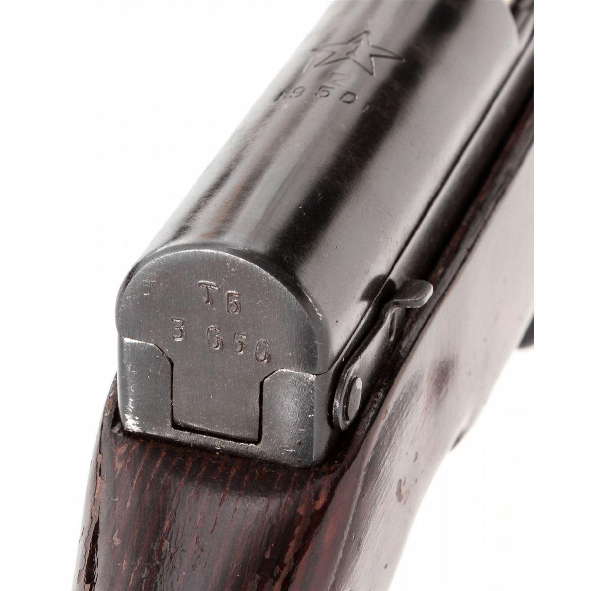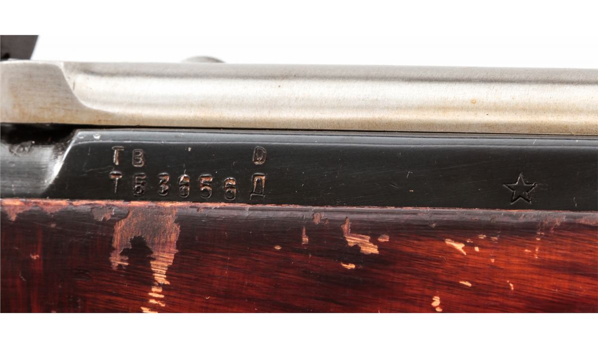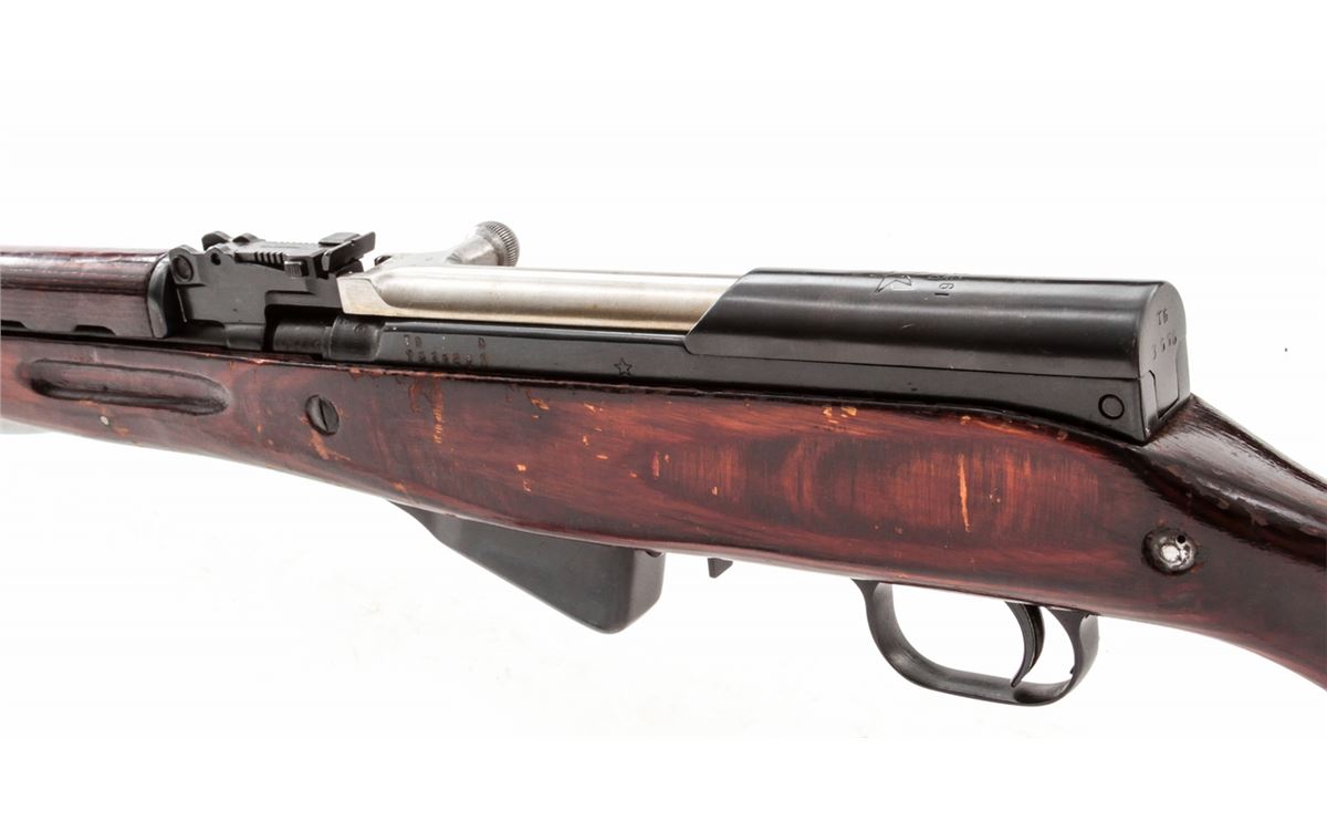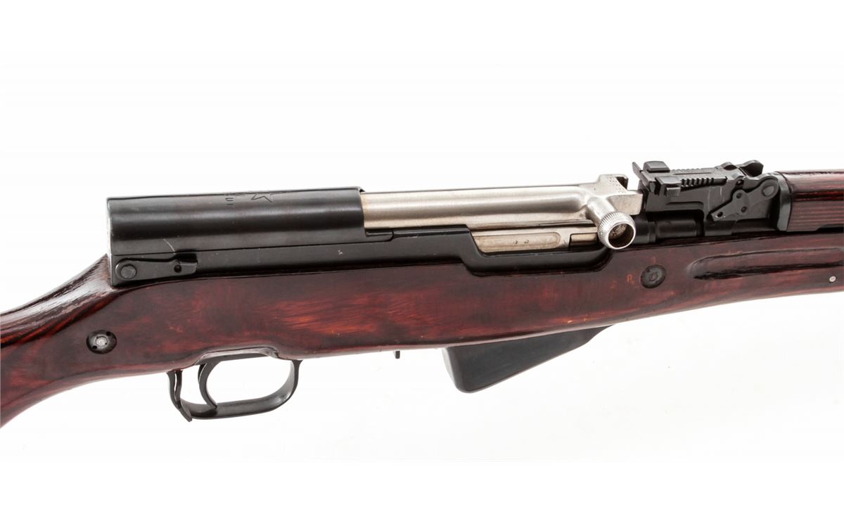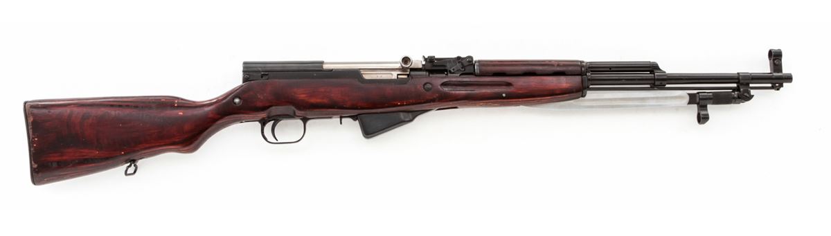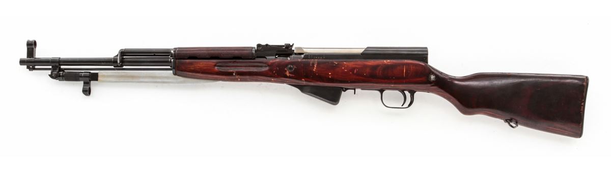 Russian SKS Semi-Automatic Rifle, #TB/T3656, 7.62x39 cal., 20'' barrel, arsenal black finish, with 1950 dated dustcover, laminated stock, cleaning rod and folding bayonet. Condition is fine. Metal surfaces retain approx. 95% blue. Stock with scuffs and scratches. Import marked. Good action and bore. Est.: $300-$500. (C&R)