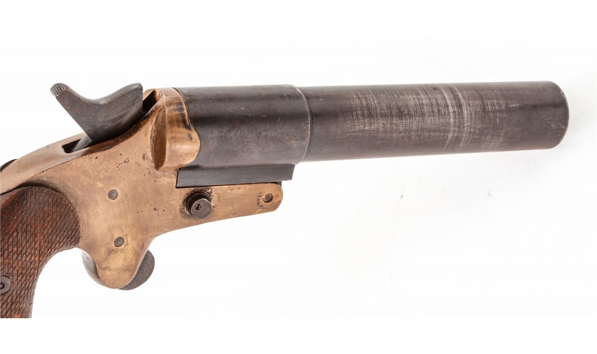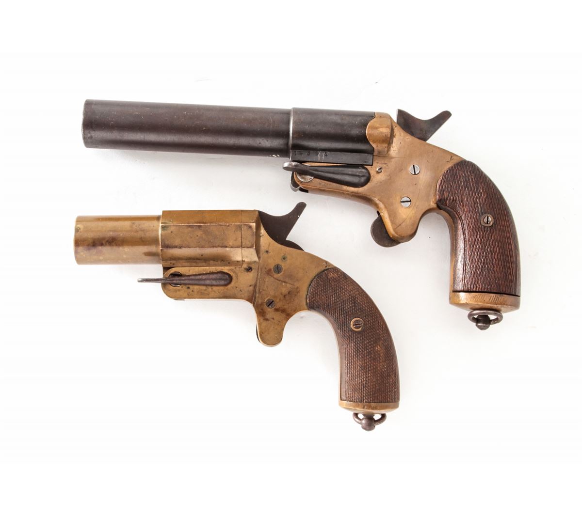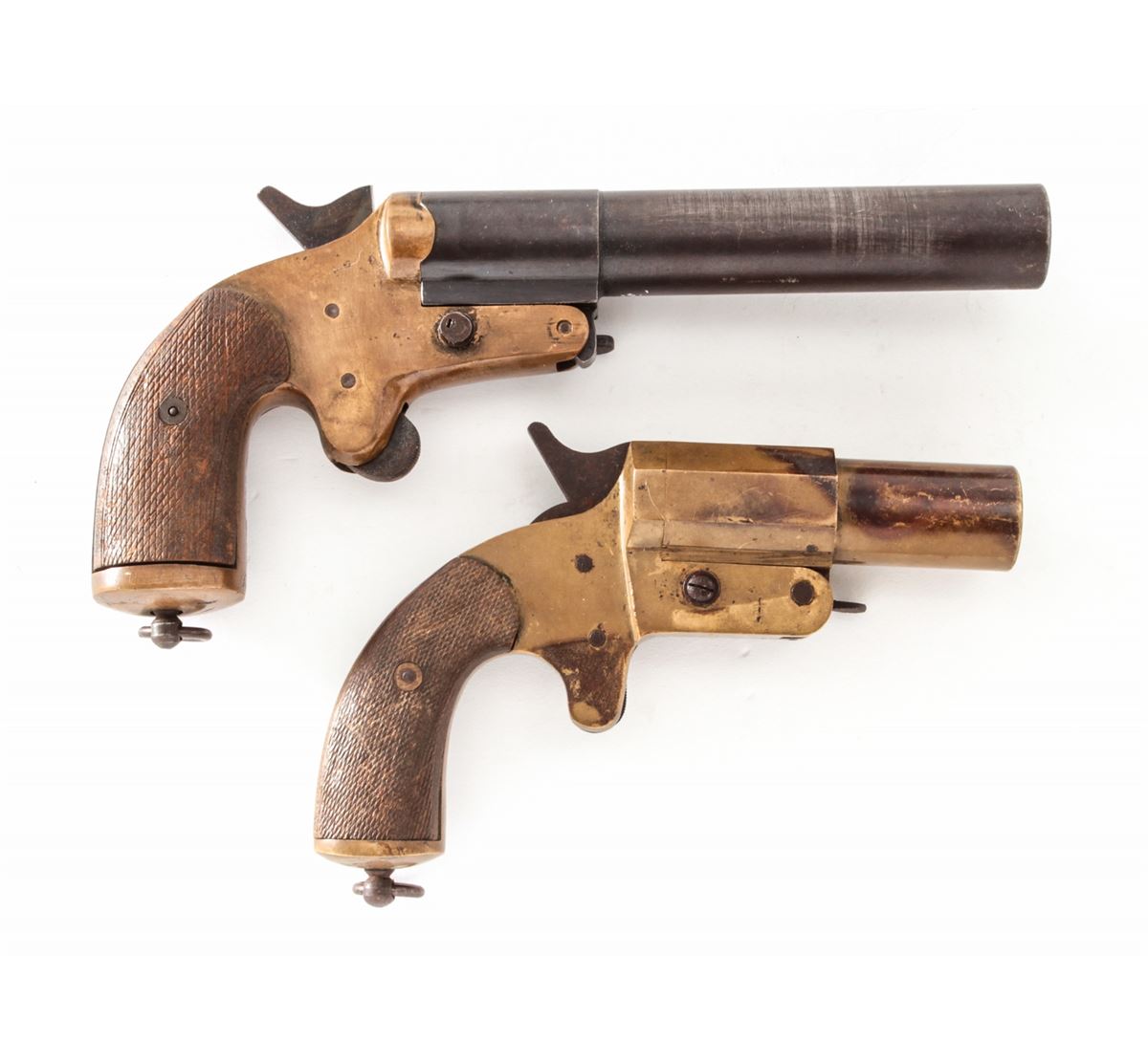 Lot of Two (2) Early 20th Century Continental Very Pistols: (1) French Model 1917 flare pistol, #14594, 25mm, 7'' blue steel barrel, brass frame, checkered hardwood grips with lanyard loop in butt. Condition is excellent retaining 85%-90% lightly thinning blue to barrel and even patination to brass frame. Grips show only minor impressions. Crisp action, bright bore. (2) Early WWI French flare pistol, NVSN, 25mm, 4'' brass barrel, brass frame, checkered walnut grips with lanyard loop in butt. Condition is excellent with even patination and light to just moderate wear to grips. Crisp action, bright bore. Est.: $250-$400/lot.