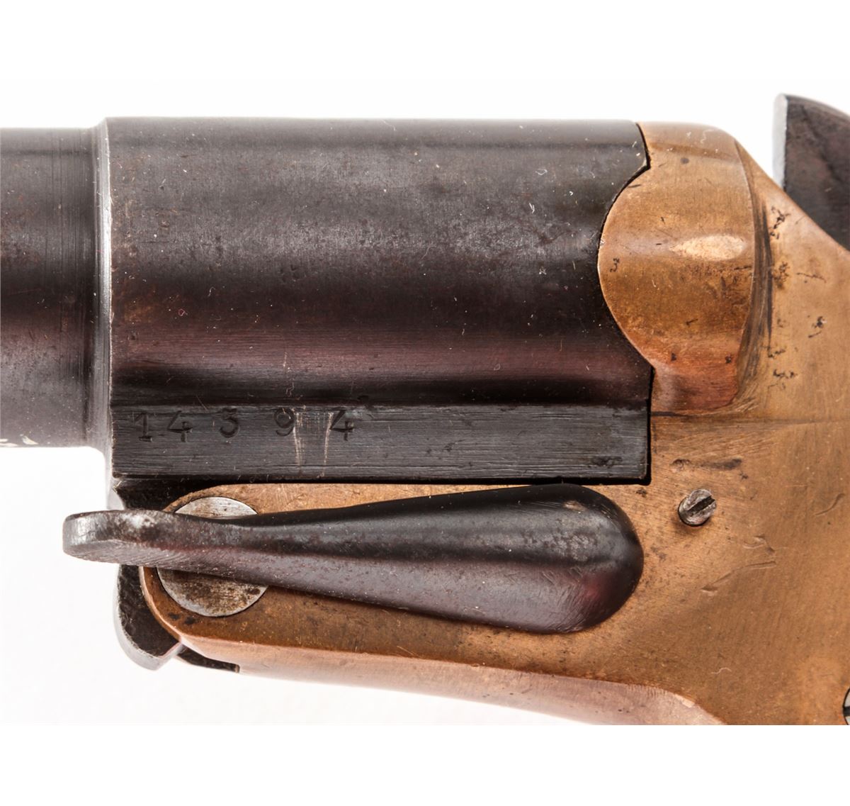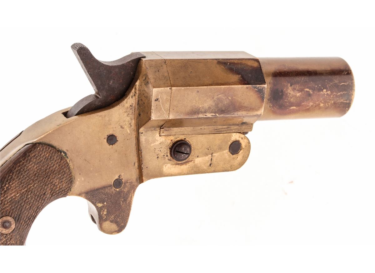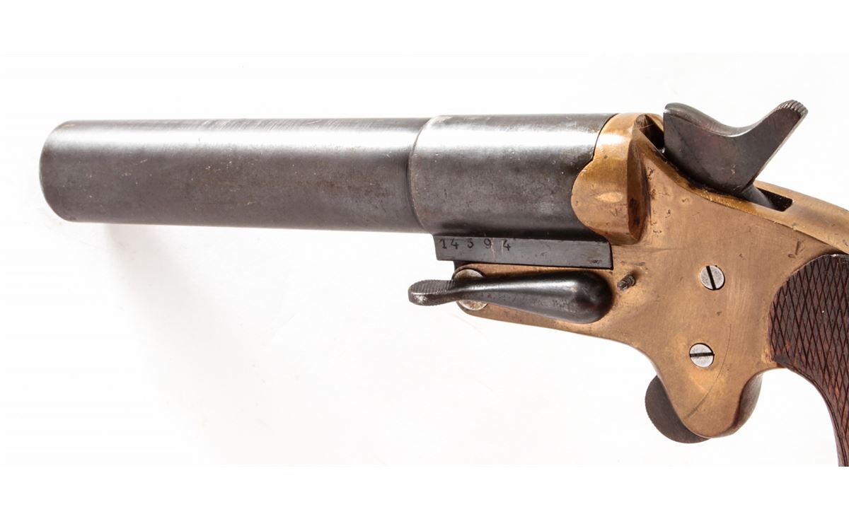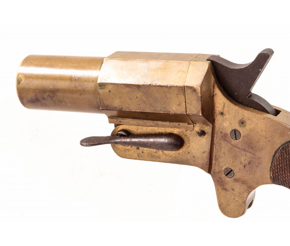 Lot of Two (2) Early 20th Century Continental Very Pistols: (1) French Model 1917 flare pistol, #14594, 25mm, 7'' blue steel barrel, brass frame, checkered hardwood grips with lanyard loop in butt. Condition is excellent retaining 85%-90% lightly thinning blue to barrel and even patination to brass frame. Grips show only minor impressions. Crisp action, bright bore. (2) Early WWI French flare pistol, NVSN, 25mm, 4'' brass barrel, brass frame, checkered walnut grips with lanyard loop in butt. Condition is excellent with even patination and light to just moderate wear to grips. Crisp action, bright bore. Est.: $250-$400/lot.