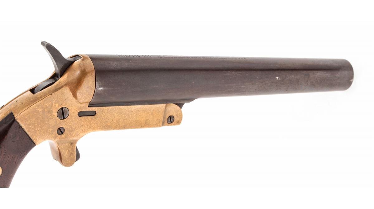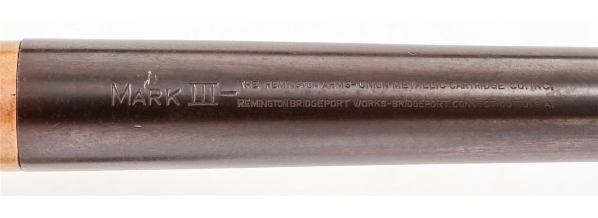 Remington MK III Single Shot Flare Pistol, #5611, 12 ga., 8-3/4'' blue barrel, bronze frame, with smooth walnut grips. Condition is excellent retaining approx. 90% thinning and toning blue to barrel. Bronze frame with nice even light patina. Grips with minor impressions. Good action, fine bore. Est.: $250-$450.