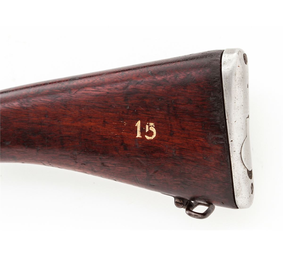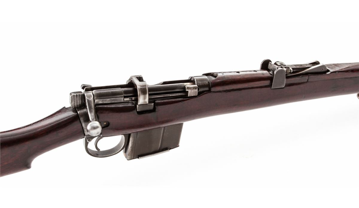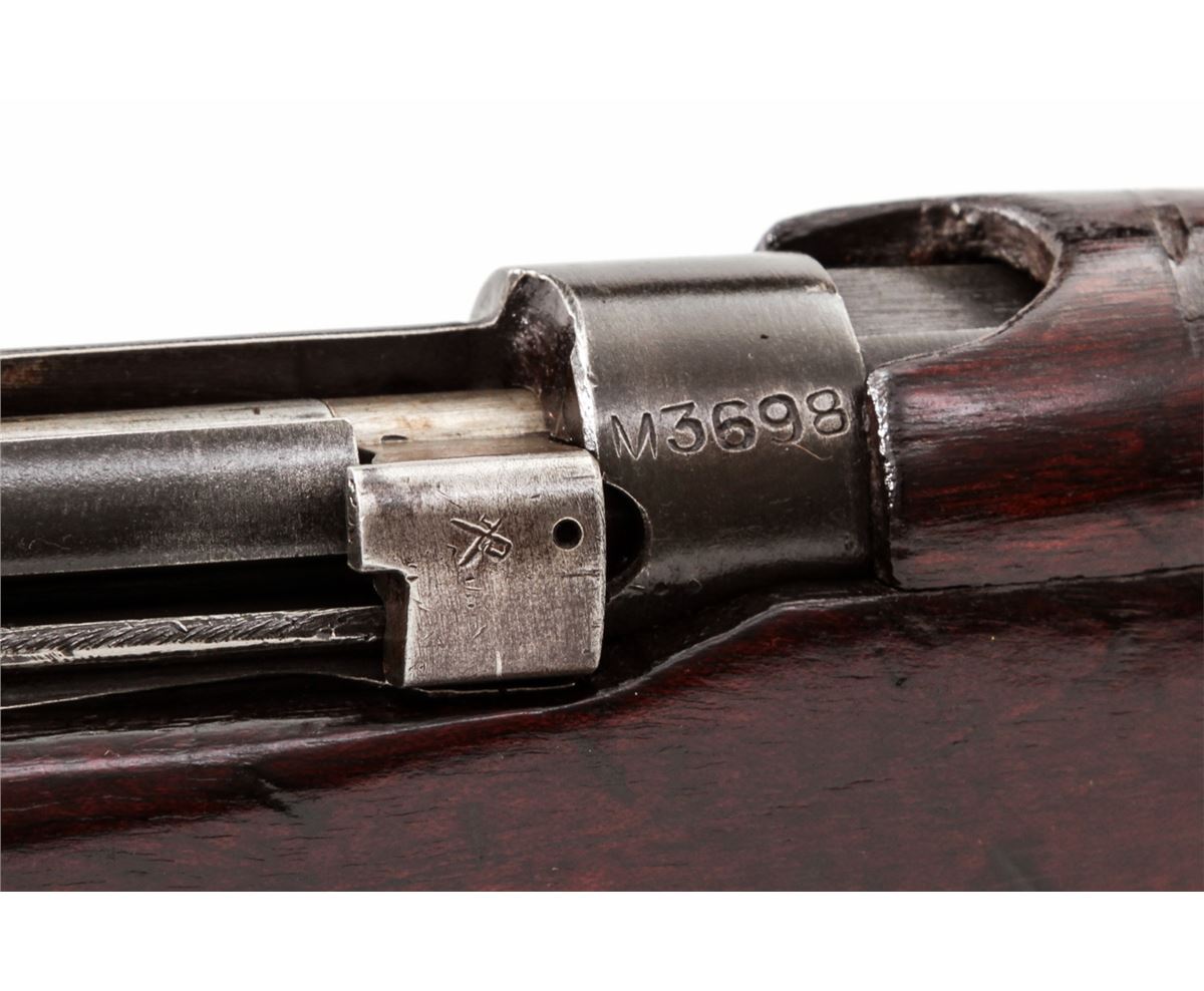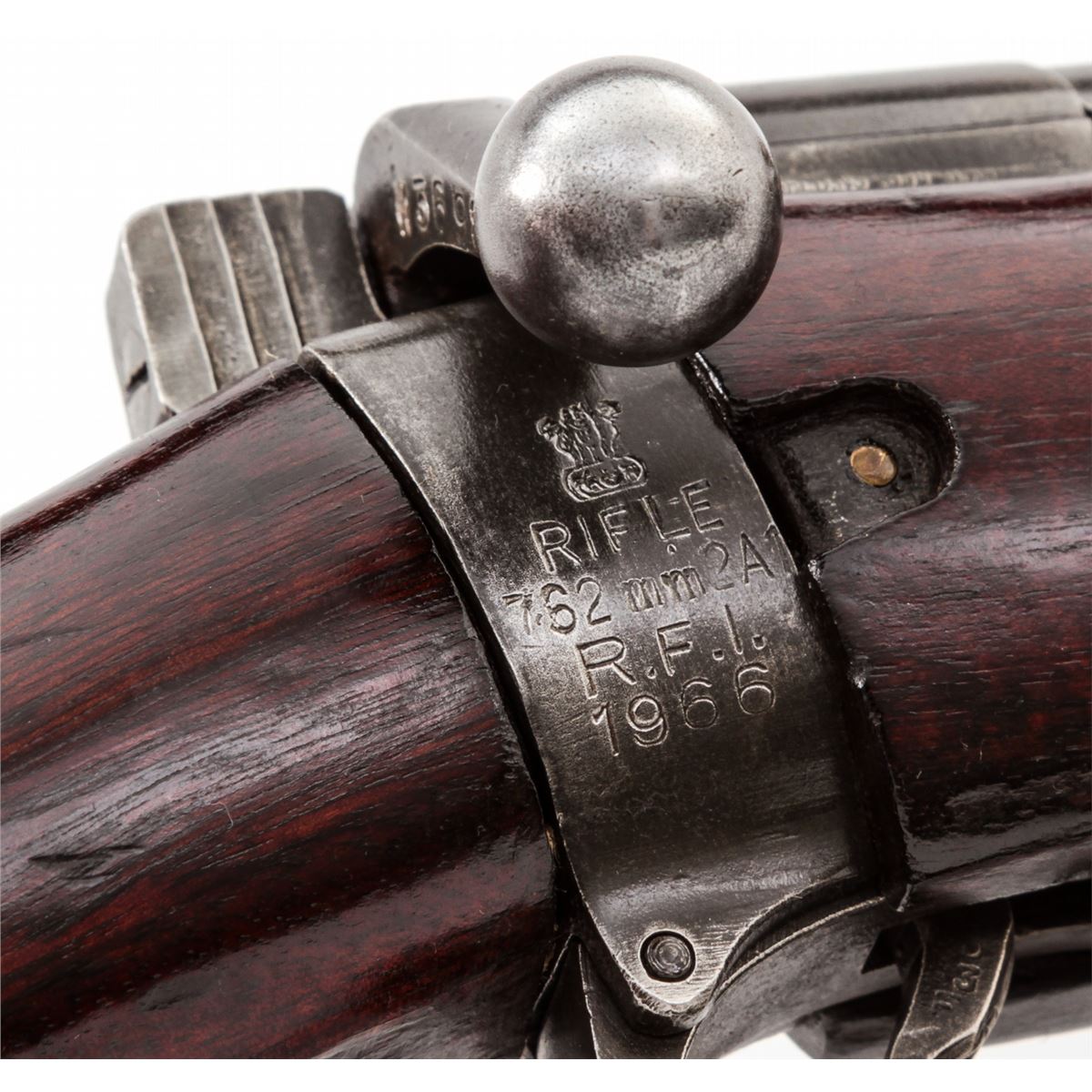 British 2A1 Bolt Action Rifle, by RFI (1966), #M3698, .308 cal., 25'' barrel, matte blue finish, walnut stock and forend, with white metal buttplate. Condition is fine retaining approx. 85% thinning blue. Stock with oil darkening, scuffs and scratches. Lightly import marked to rear right portion of frame. Good action and bore. Est.: $250-$400. (C&R)