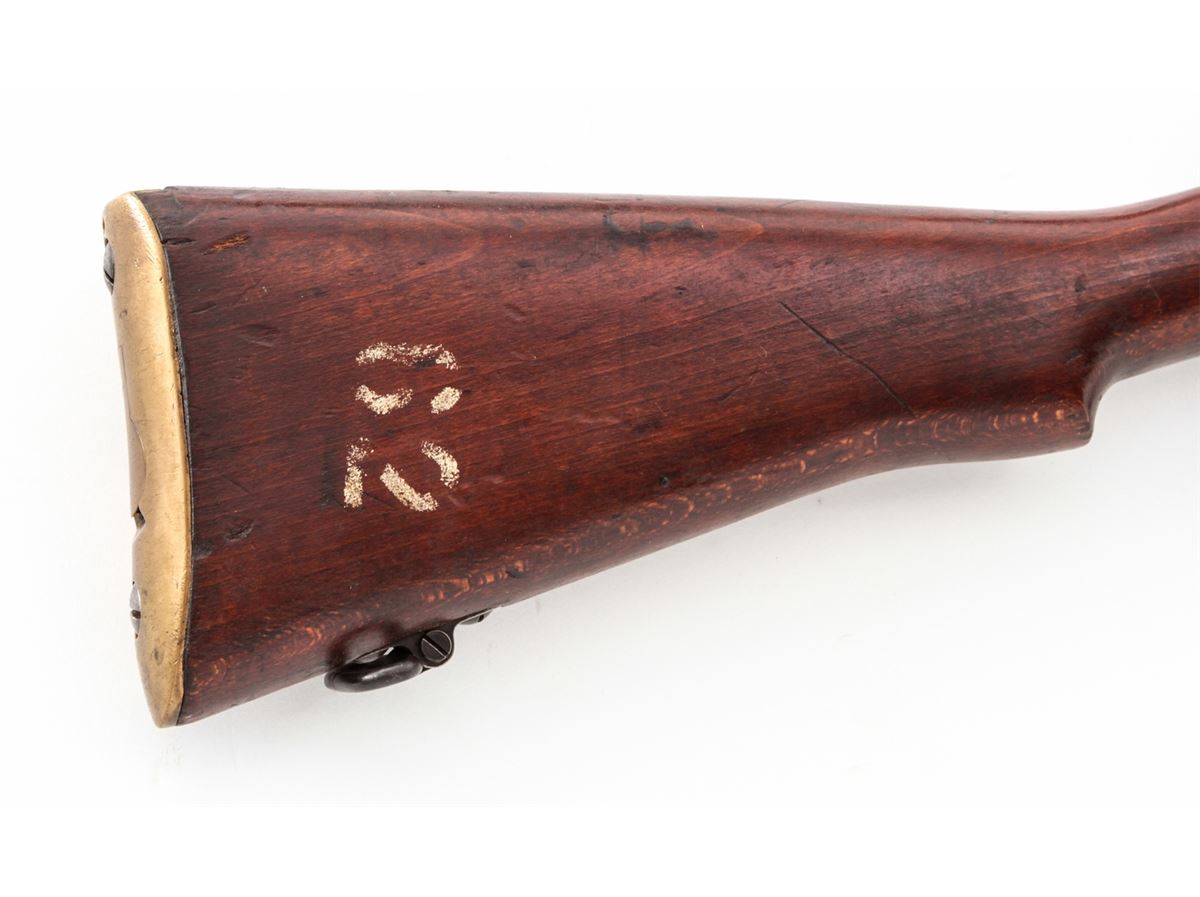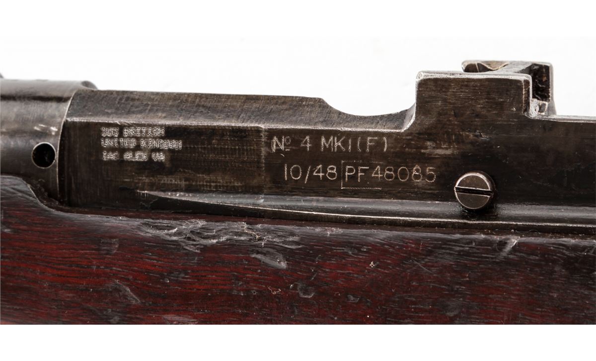 Lee-Enfield No. 4 MK I(F) Bolt Action Rifle (10/48), #PF48085, .303 cal., 25'' barrel, black finish, beech stock. Condition is very good to near fine retaining approx. 80% finish. Stock with moderate scuffs and scratches. Lightly import marked to forward left portion of frame. Good action and bore. Est.: $200-$400. (C&R)