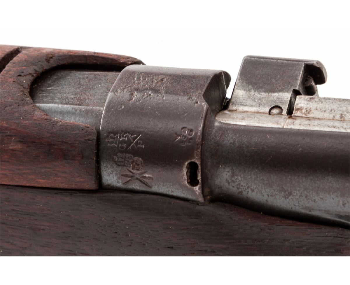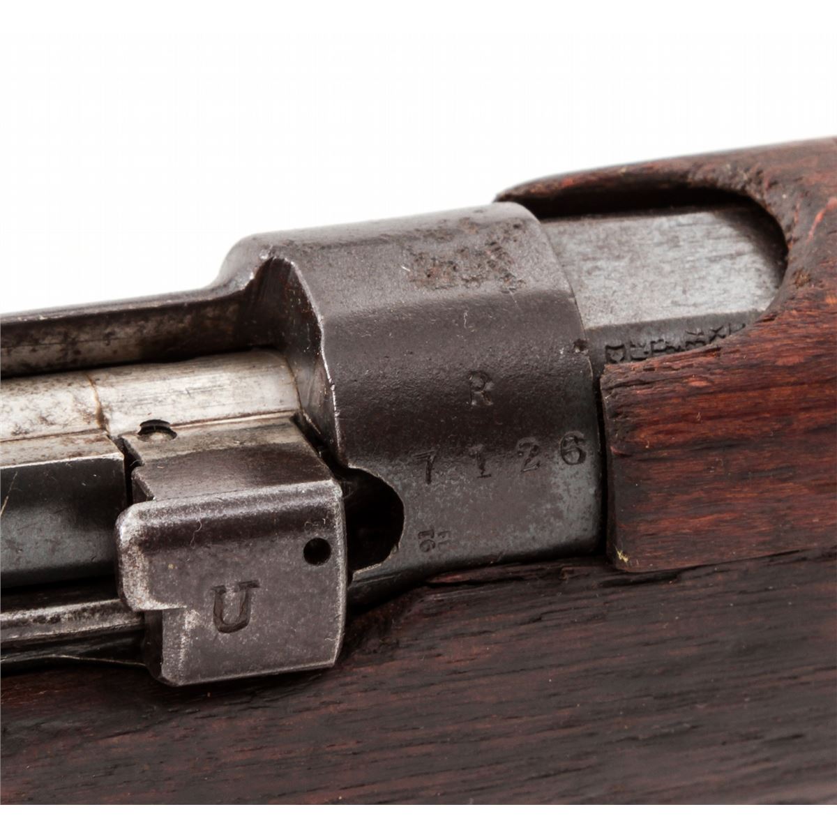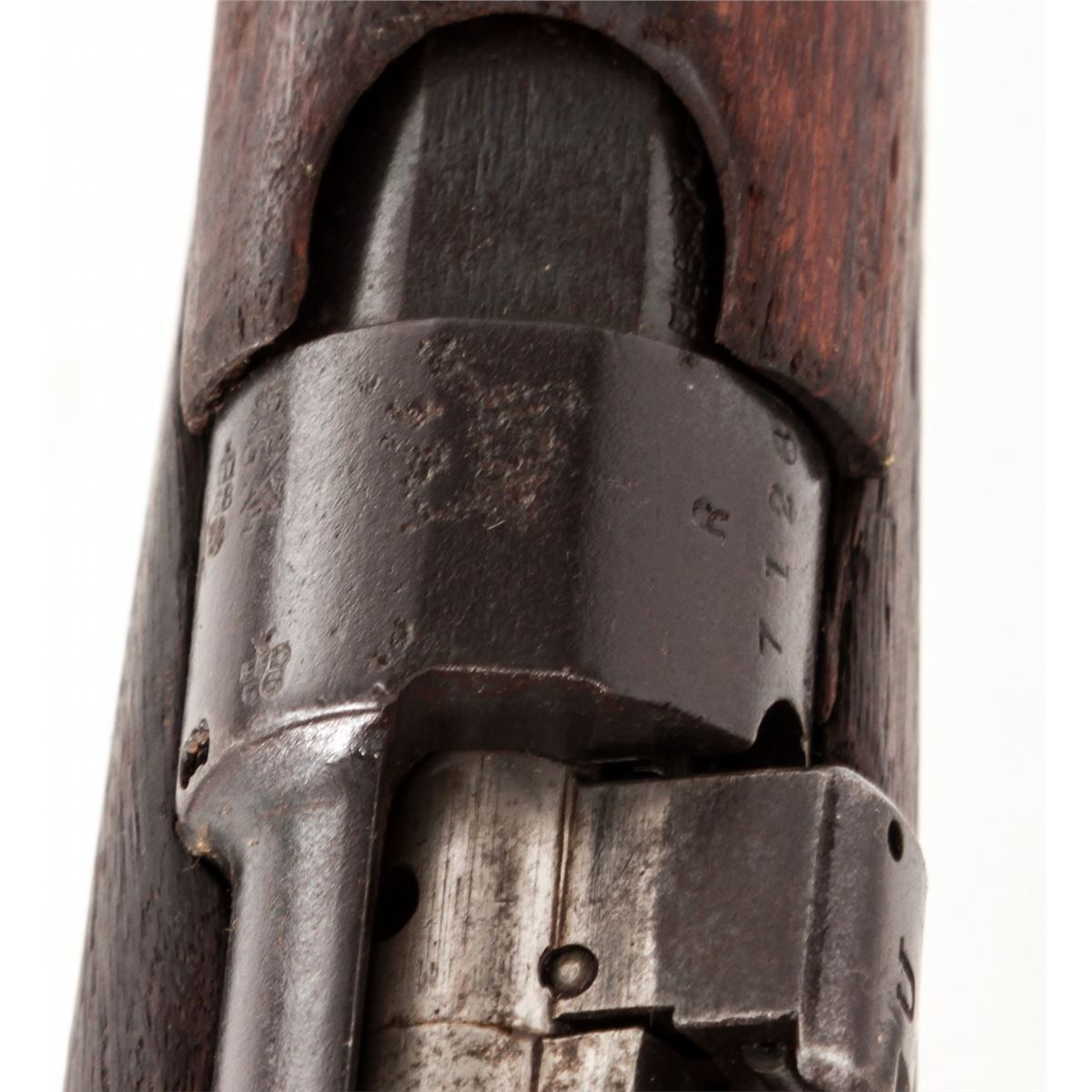 British SMLE No. 1 MK III* Bolt Action Rifle, (1917), #R7126, .303 cal., 25'' barrel, arsenal blue finish, walnut stock and handguard. Condition is very good as lightly import marked to back of receiver. Metal surfaces retain approx. 85% arsenal blue. Mismatched bolt. Stock with moderate scuffs and bruises and oil darkening. Good action and very good bore. Est.: $200-$400. (C&R)