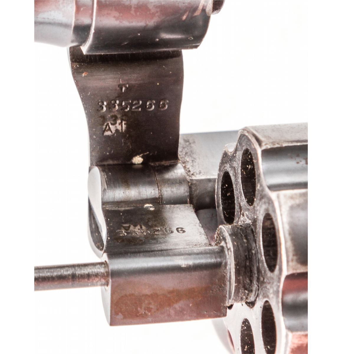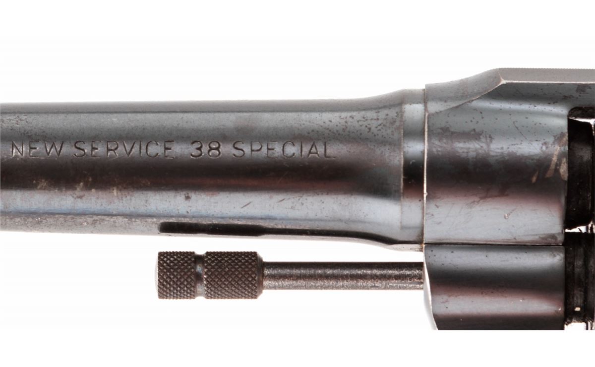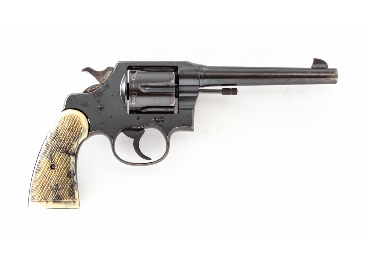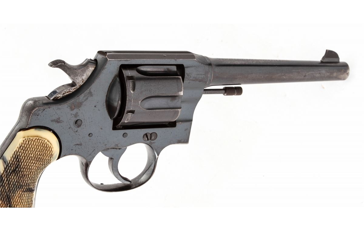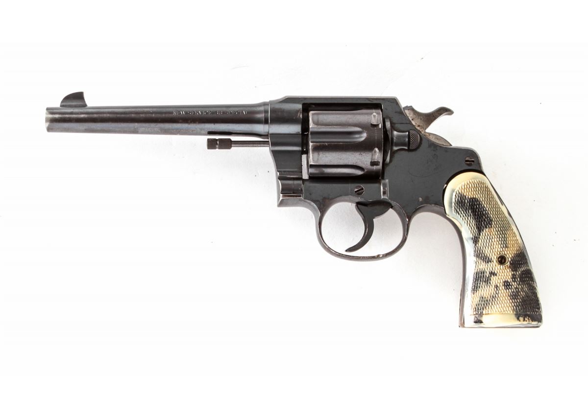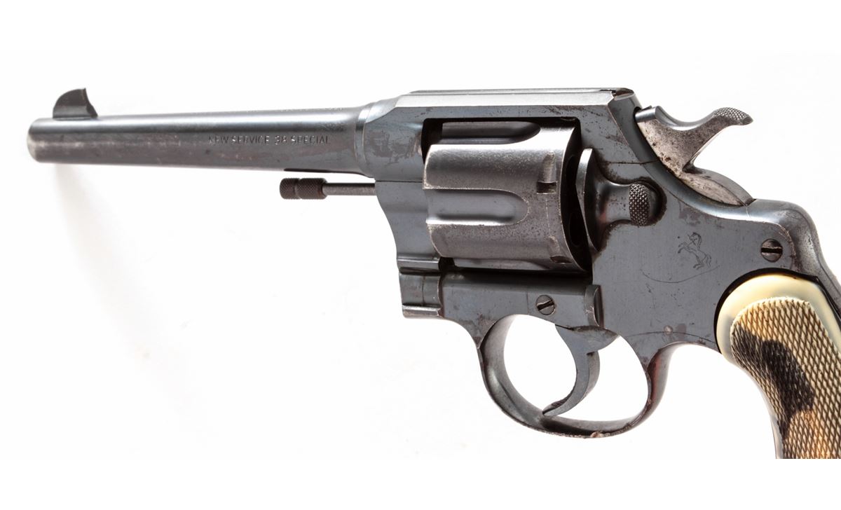 Colt New Service Double Action Revolver, #335266, .38 Spec. cal., 6'' barrel, blue finish, black & white checkered franzite grips. Mfg'd 1933. Condition is very good to near fine retaining approx. 85%-90% lightly thinning blue. Left side bottom portion of triggerguard with nicks and mild deformation. Non-original grips show some shrinkage at upper portion. Recoil shield that surrounds firing pin is missing. Action is crisp, bore is bright. Est.: $450-$650. (C&R/PPT)