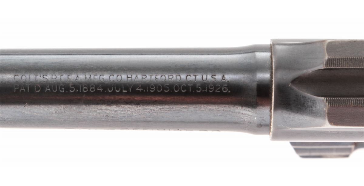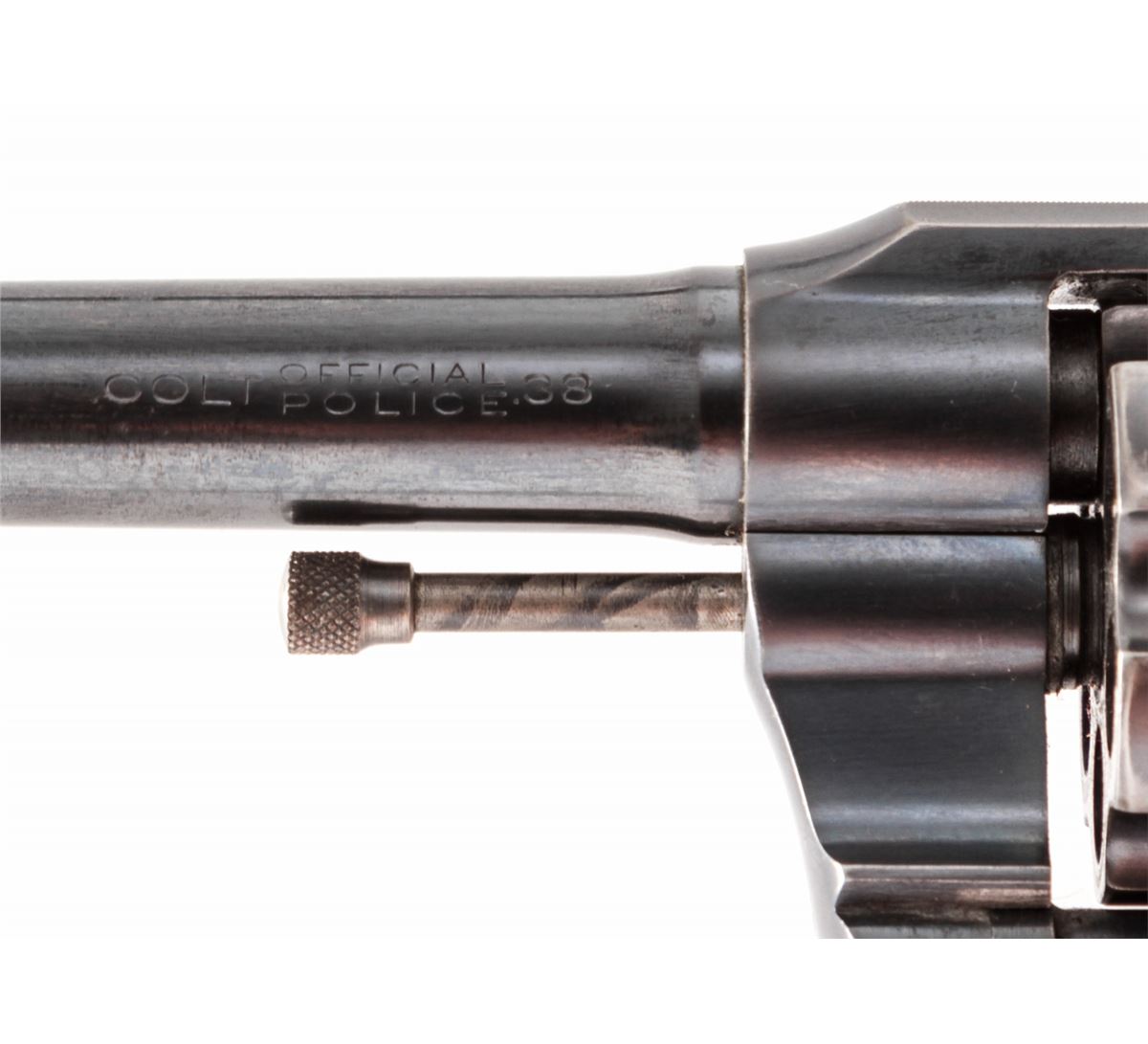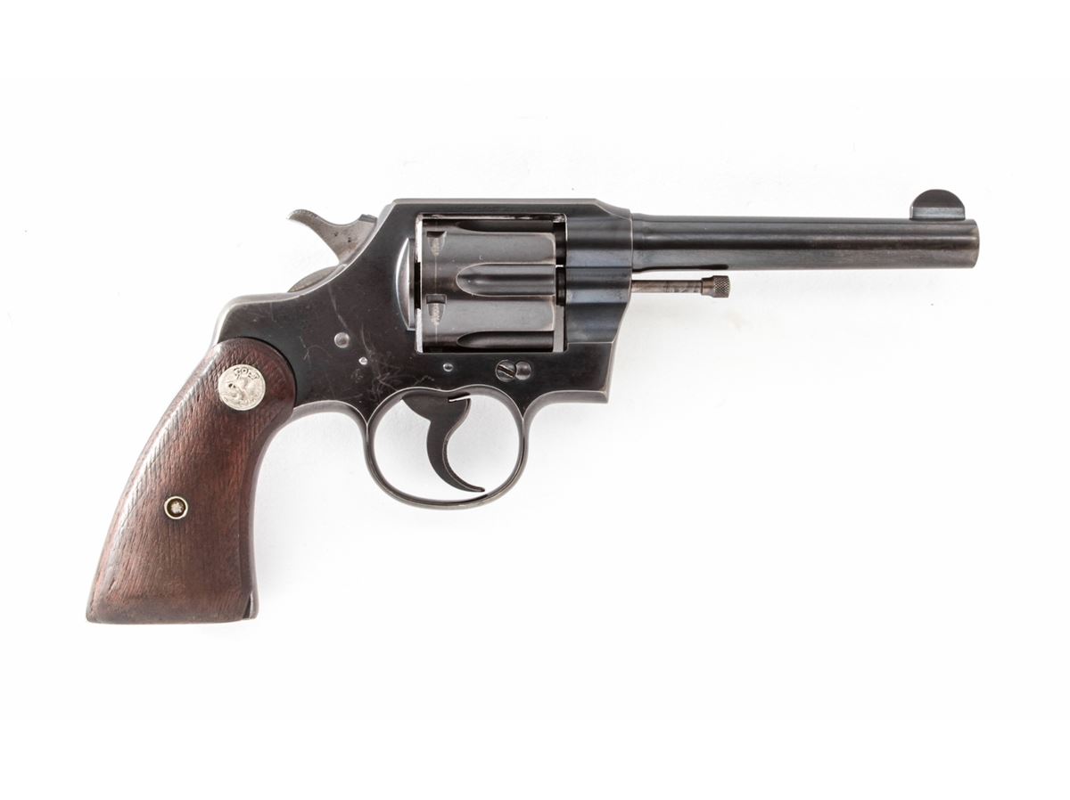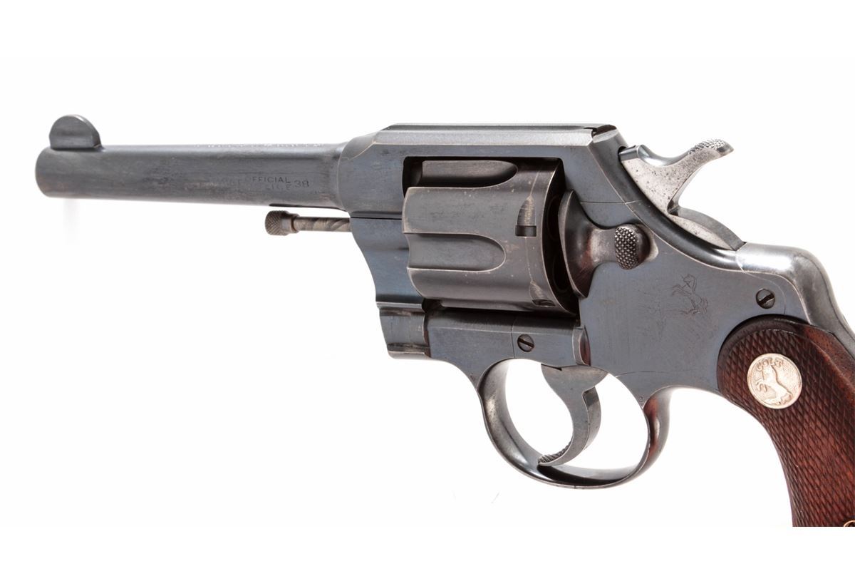 Colt Official Police Double Action Revolver, #544232, .38 Spec. cal., 5'' barrel, blue finish, factory checkered walnut grips with Colt medallions. Mfg'd 1929. Condition is fine retaining approx. 94% lightly thinning blue, somewhat more extensive on front and backstrap. Grips with moderate to heavy flattening. Tight action, bright bore. Est.: $350-$500. (C&R/PPT)