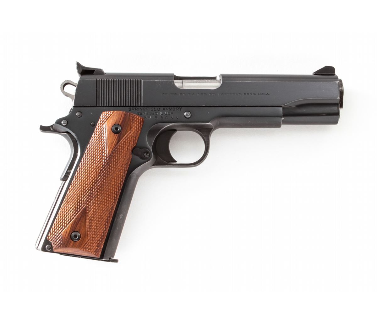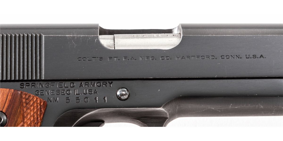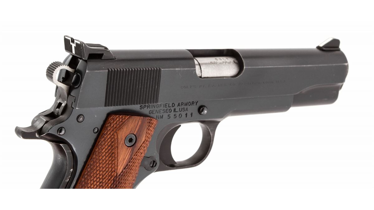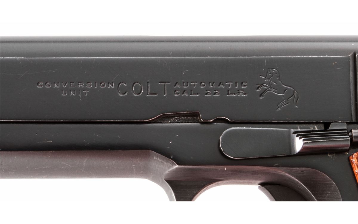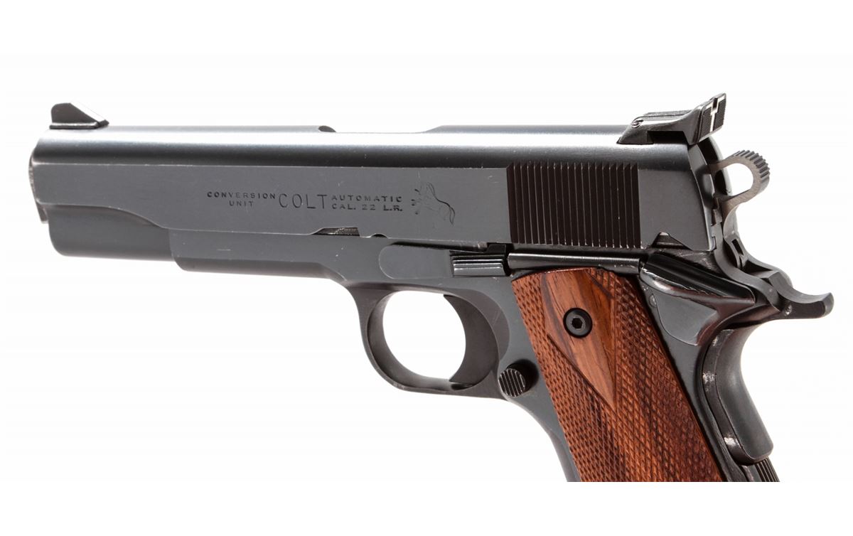 Springfield Armory 1911-A1 Lower Frame with 1960s Era Colt .22 Conversion Unit, #NM55011, .22 LR cal., 5'' barrel, blue finish, modern diamond checkered walnut grips, Allen head grips screws, and one Colt .22 magazine. Slide has been fitted with Millett sights. Condition is excellent as converted, showing approx. 95% high polish blue. Good grips and action, bright bore. Slide does not always stay back on last round. Est.: $600-$800. (Modern/PPT)