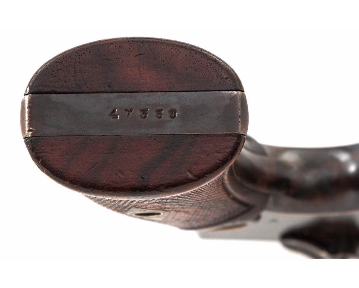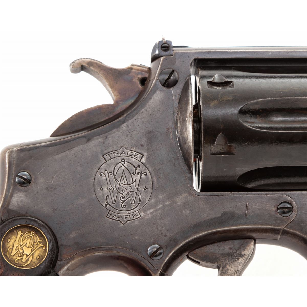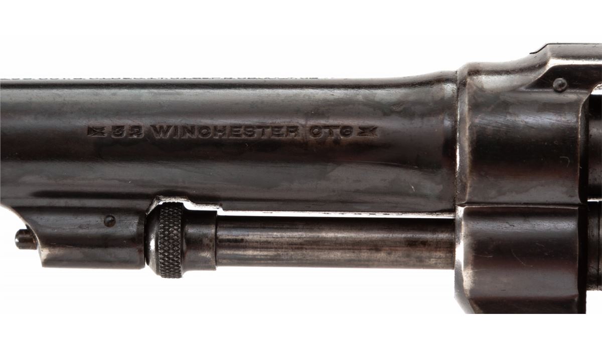 Smith & Wesson Hand Ejector Double Action Revolver, #47389, .32-20 cal., 5'' barrel, blue finish, factory checkered diamond grips with gold medallions, with adjustable rear and silver bead front sight. Condition is very good with some touchup, retaining approx. 80% blue. Grips with moderate flattening. Crisp action, fine bore. Est.: $250-$450. (C&R)