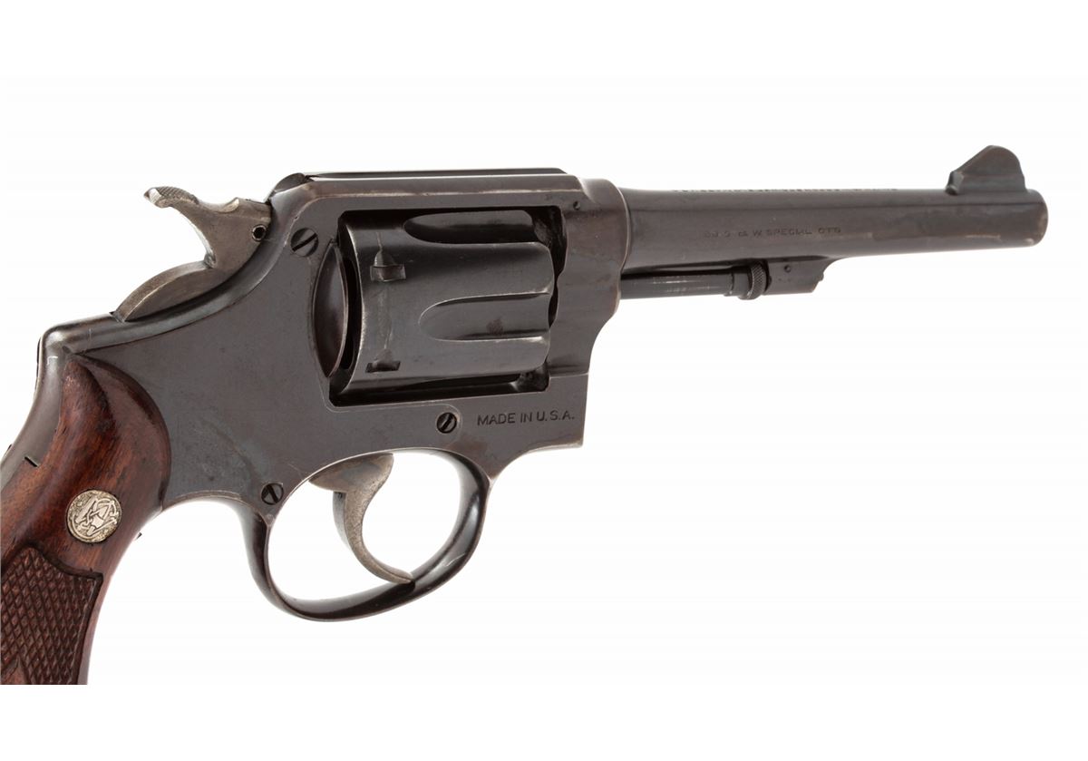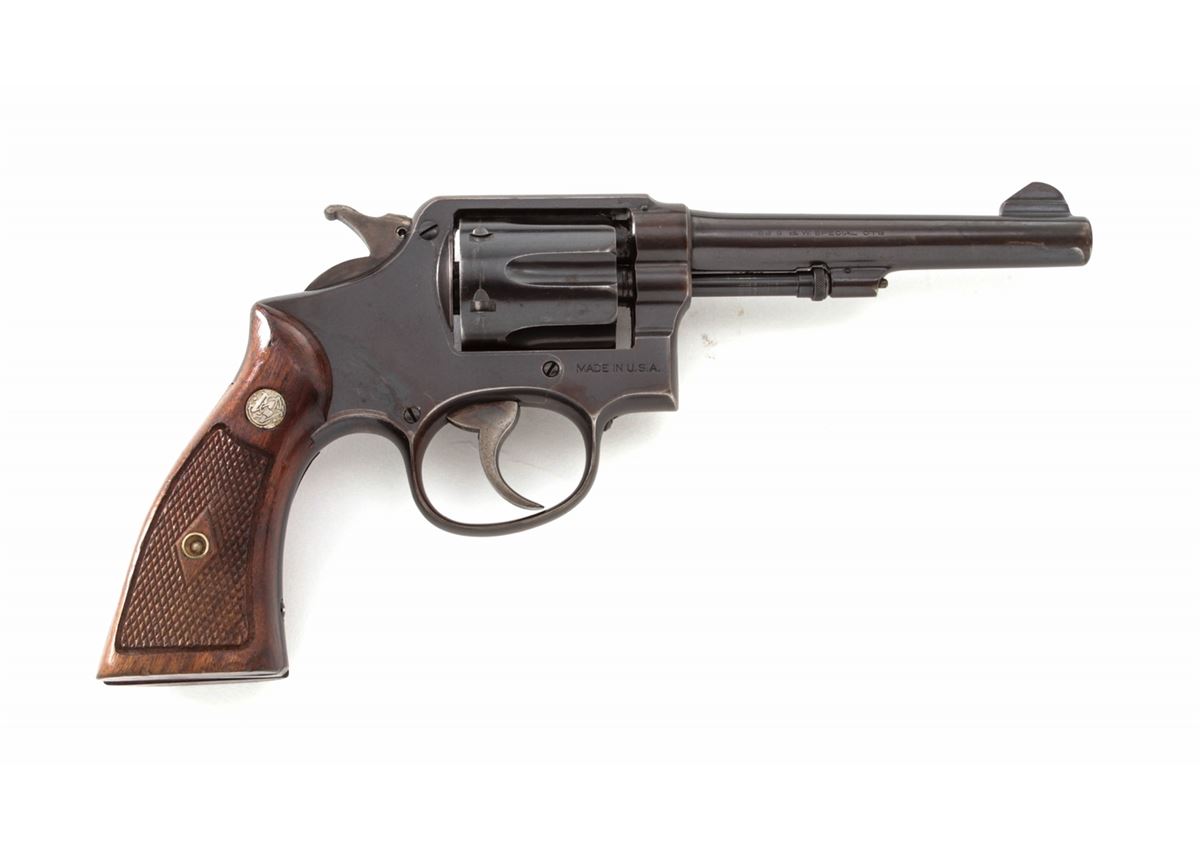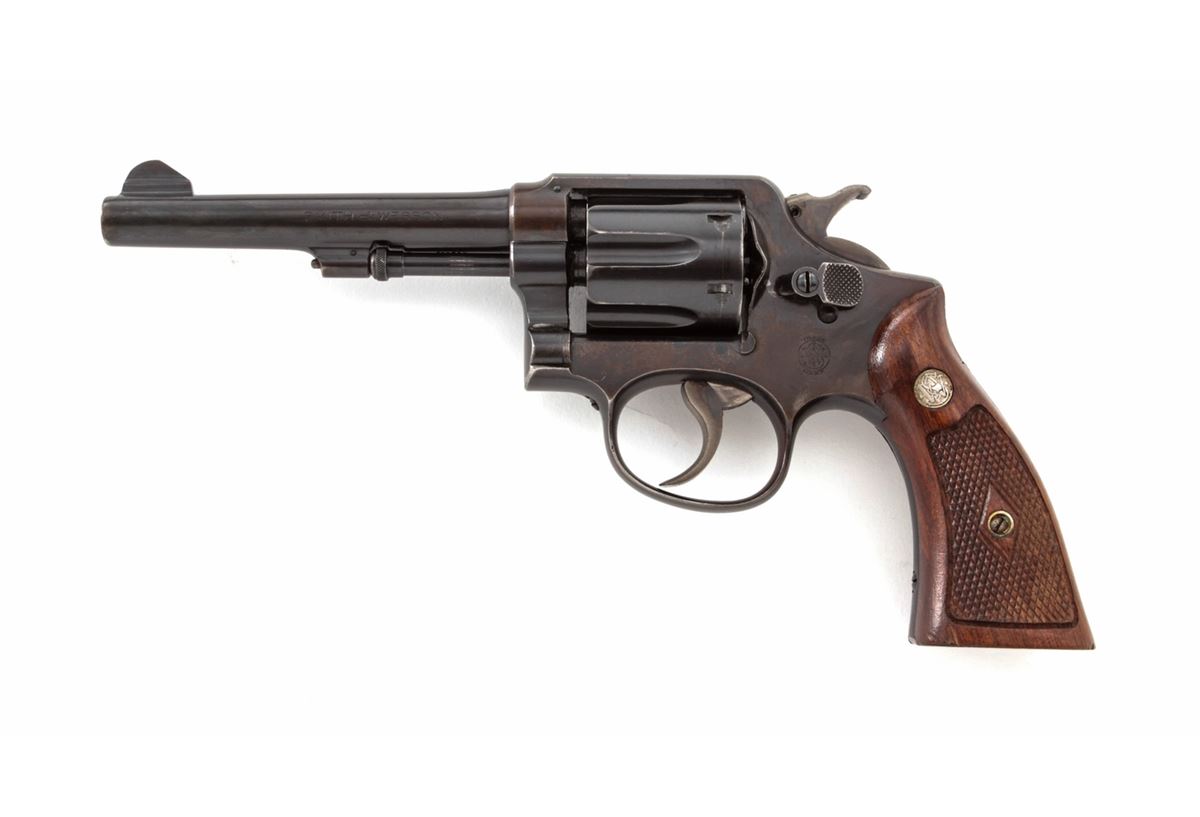 Smith & Wesson M&P Double Action Revolver, #508584, .38 Spec. cal., 5'' barrel, blue finish, factory checkered diamond walnut grips. Condition is very good to near fine retaining approx. 80% thinning and toning finish with most of the losses to left side of frame. Grips remain mostly crisp with one small loss to left panel. Good action, bright bore. Est.: $250-$400. (C&R)