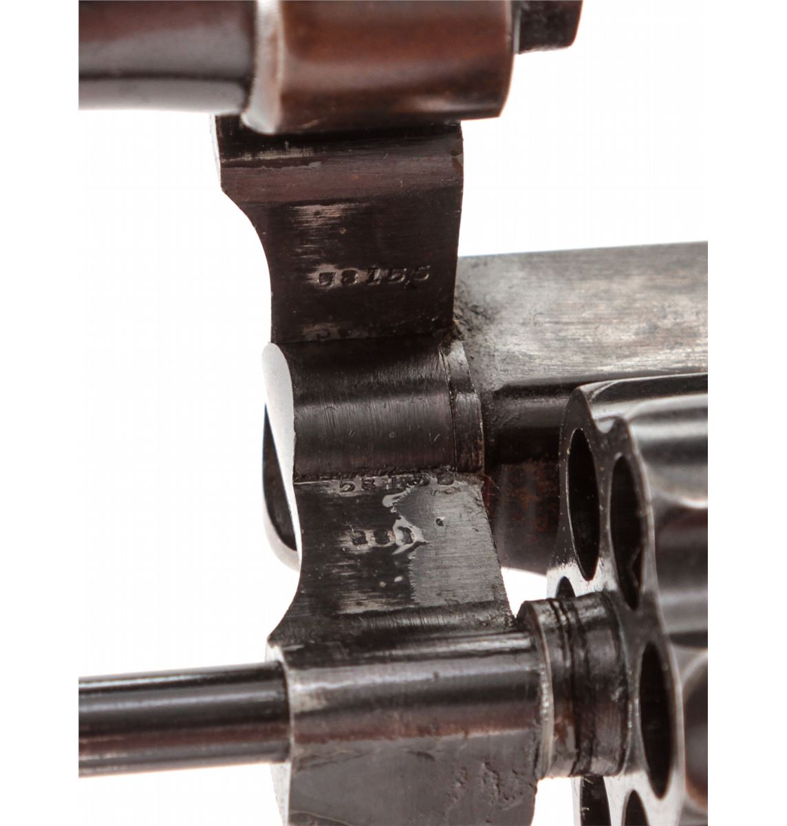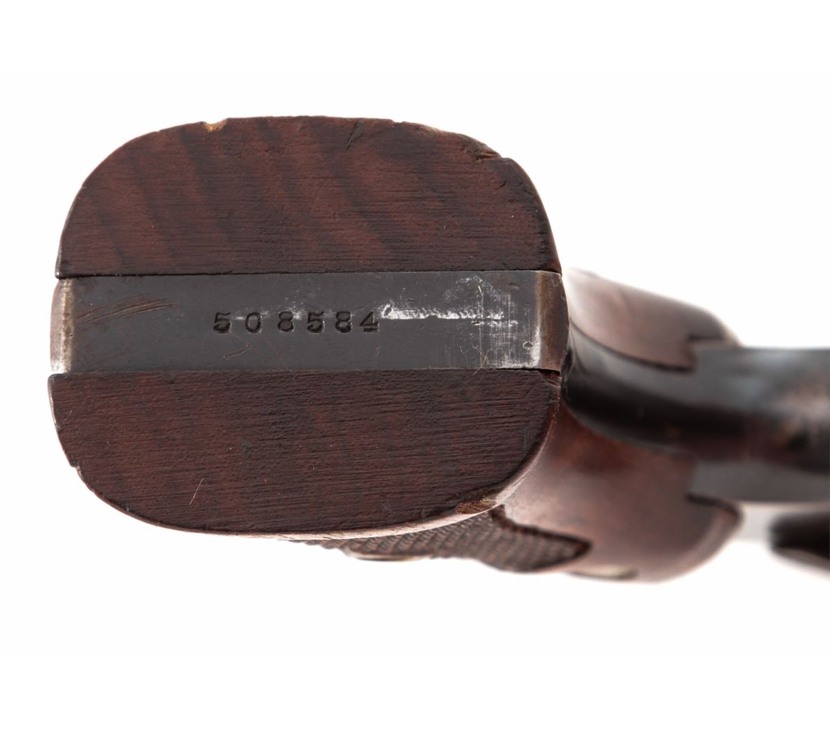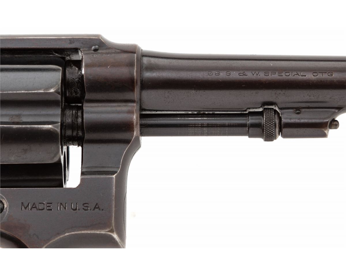 Smith & Wesson M&P Double Action Revolver, #508584, .38 Spec. cal., 5'' barrel, blue finish, factory checkered diamond walnut grips. Condition is very good to near fine retaining approx. 80% thinning and toning finish with most of the losses to left side of frame. Grips remain mostly crisp with one small loss to left panel. Good action, bright bore. Est.: $250-$400. (C&R)