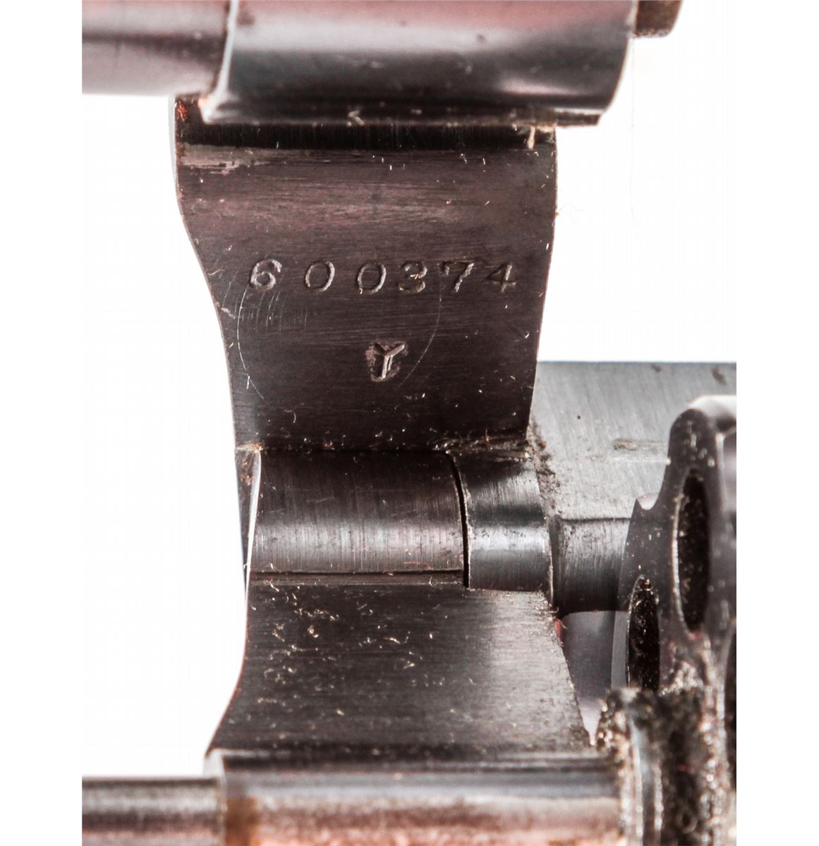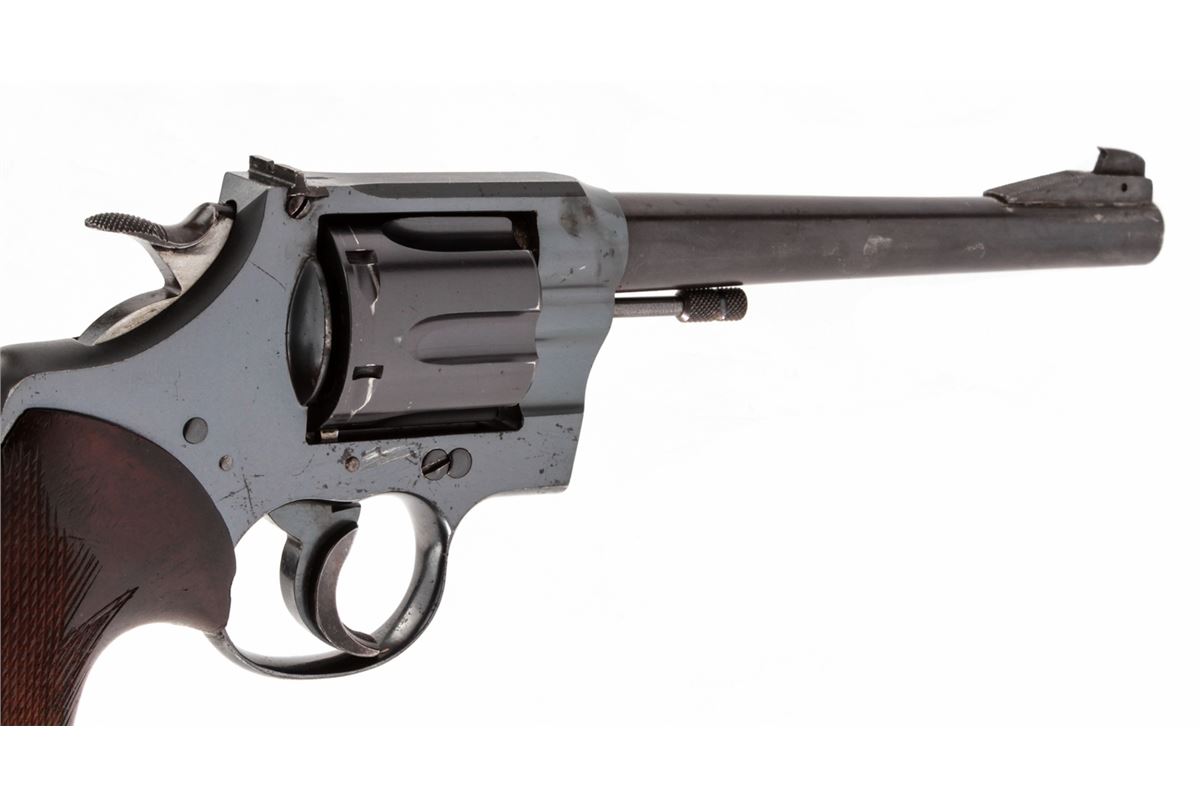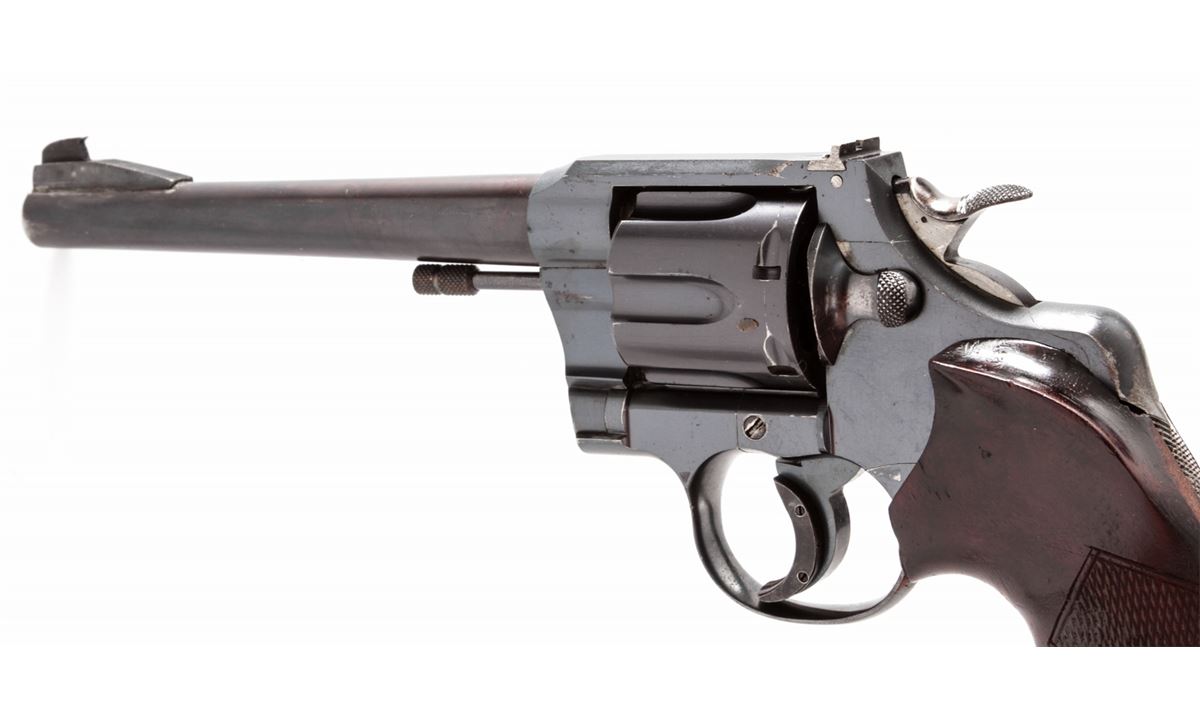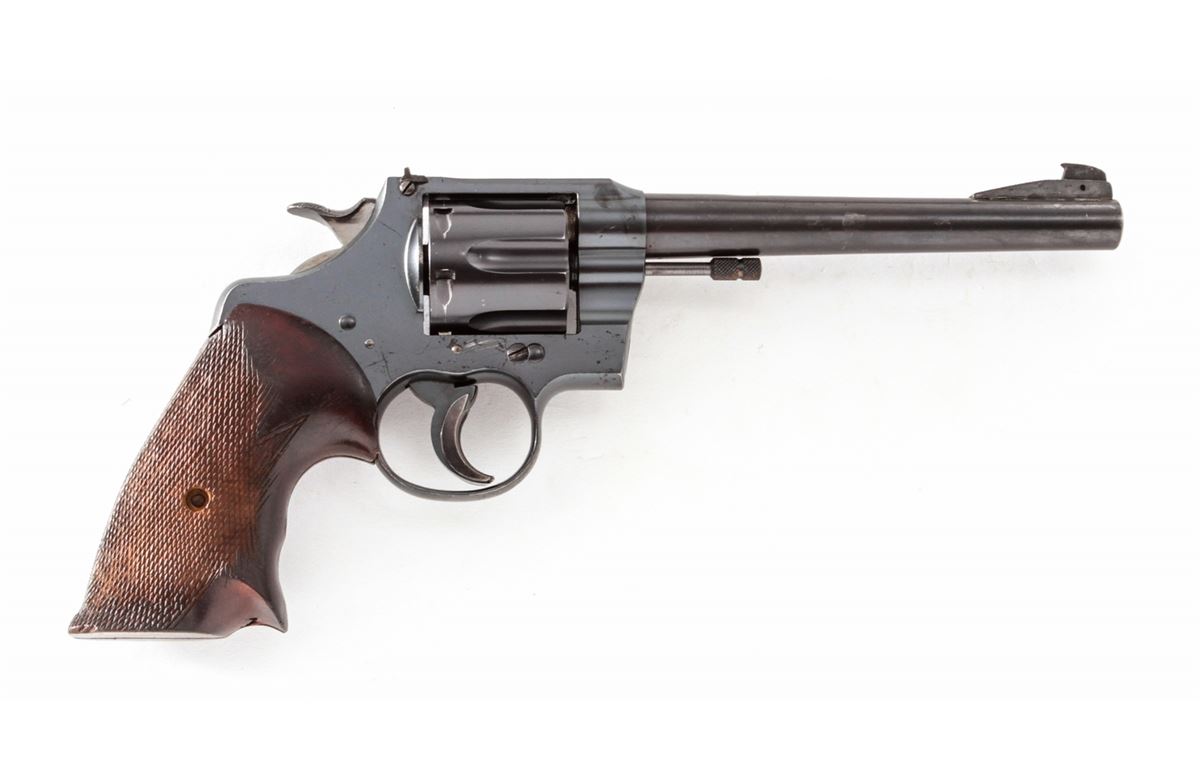 Modified Colt Officer's Flat-Top Target Model Revolver, #600374, .32 S&W Long cal., 6-1/4'' non-factory barrel, blue finish, custom made thumbrest checkered walnut grips, with triggershoe, King's Gunworks style hammer, with undercut Patridge front sight and standard rear sight. Converted to Single Action only target use. Condition is fine as modified, retaining approx. 92% blue with moderate range use. Later barrel with 92% thinning blue of a slightly different tone than the frame. Custom grips show flattening to checks and light general overall wear. Action is smooth and crisp, bore is bright. Est.: $450-$600. (C&R)