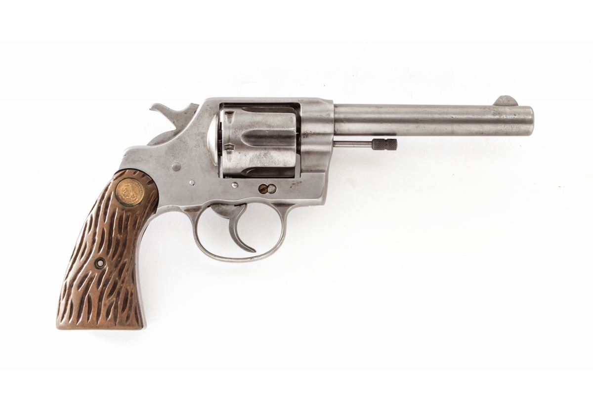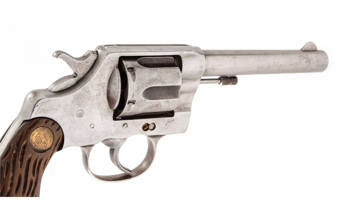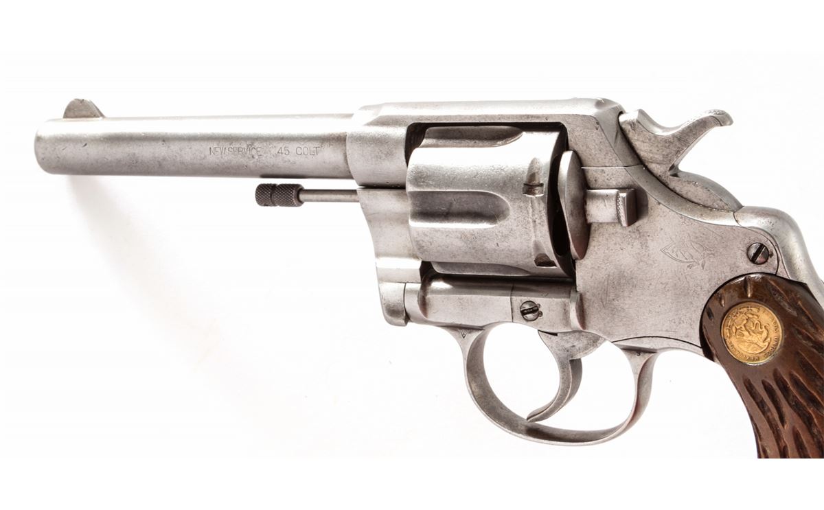 Colt New Service Double Action Revolver, #21302, .45 Colt cal., 5-1/2'' barrel, originally with blue finish, hand-crafted Bakelite grips, with Mexican coins as escutcheons. Mfg'd 1909. Condition is fair retaining little original finish. Grips are good, action needs a little work, bore is very good. Est.: $250-$450. (C&R/PPT)